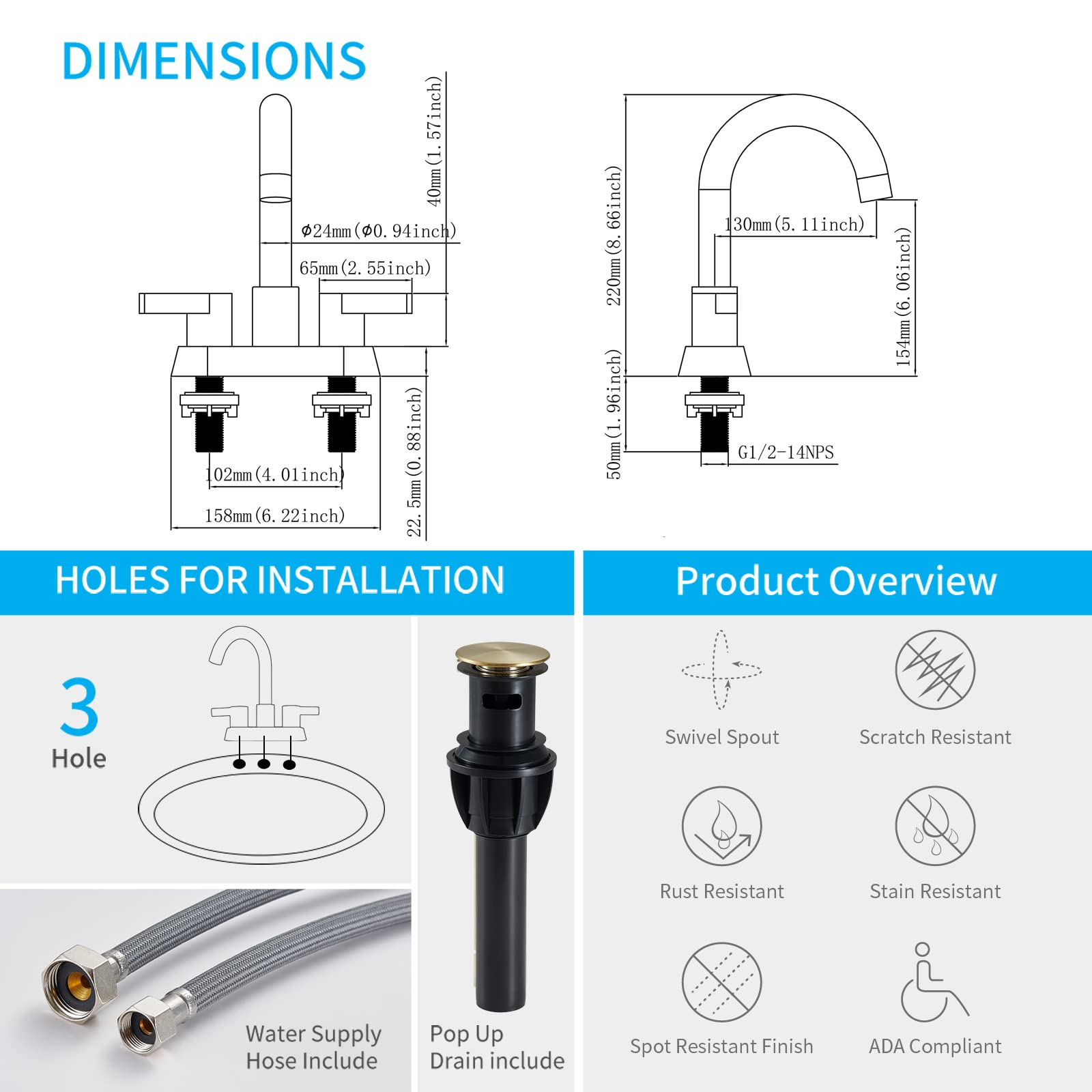 [EASY INSTALLATION]: The brushed gold bathroom faucet comes with a plastic Pop up Sink Drain Assembly with Overflow and 2 high-density solid braided nylon tub water supply lines. 4-inch centerset and 3 hole mount design allow for easy installation. Detailed installation instructions will guide you on how to perform installation quickly. [DIMENSIONS]: Spout Height is 6.1"(154mm), Spout Reach is 5.1"(130mm), overall height is 8.7"(220mm), 4-Inch center set installation, fit max countertop thickness 1.0" and pre-drilled hole 1.5".