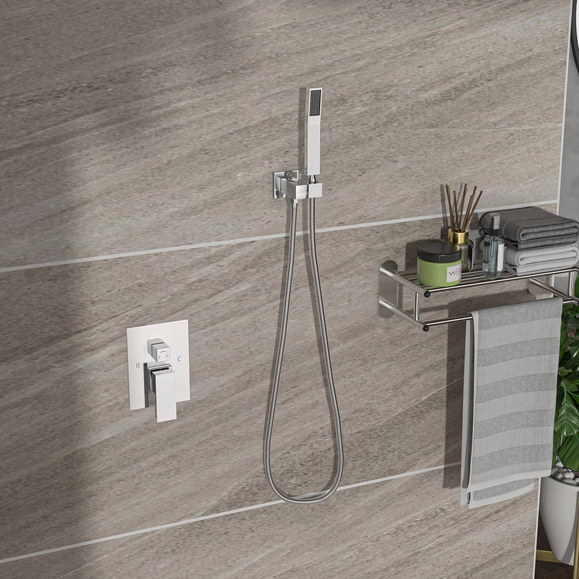 Dual function 304 stainless steel square shower concealed set, solid brass shower mixing valve. 10 inch brass ceiling-mounted shower arm with enamel cover, corrosion resistant, high temperature resistant, not easy to age, with shower arm, hose easy to install, different function shower to provide you with a comfortable shower, so you can have the ultimate bathing experience.