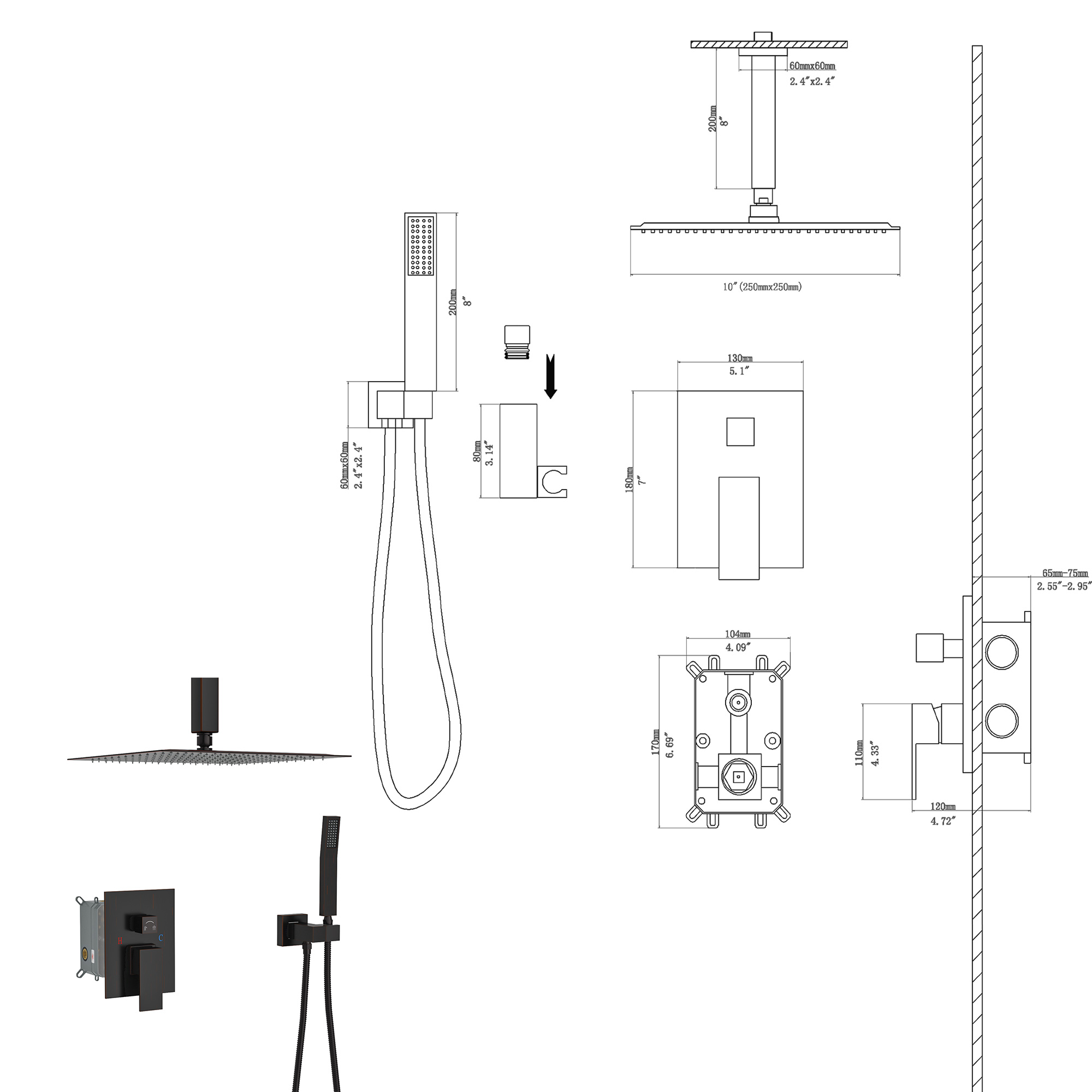 Dual function 304 stainless steel square shower concealed set, solid brass shower mixing valve. 10 inch antique brass ceiling-mounted shower arm with enamel cover, corrosion resistant, high temperature resistant, not easy to aging, with shower arm, hose easy to install, different function shower to provide you with a comfortable shower, so you have the ultimate bathing experience.