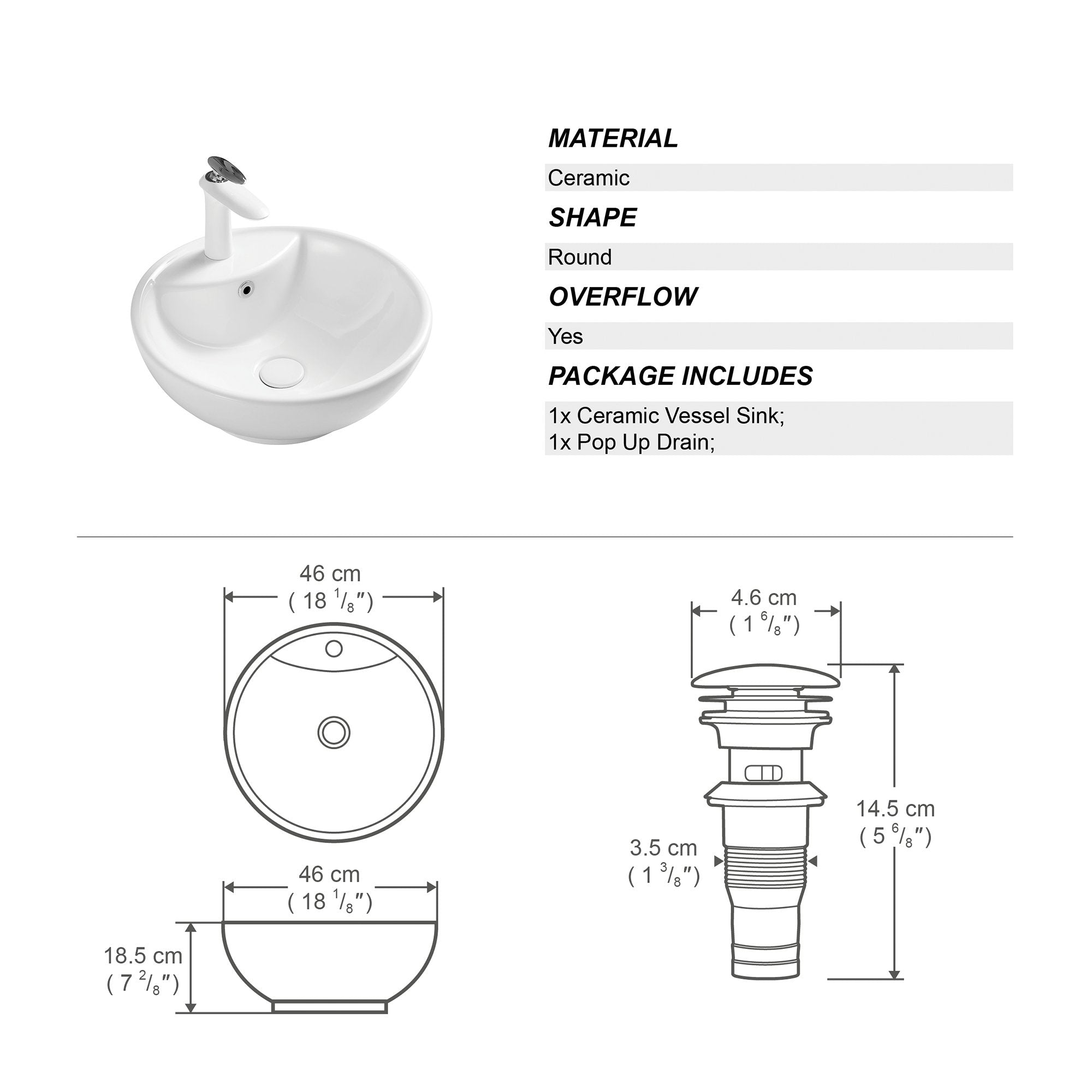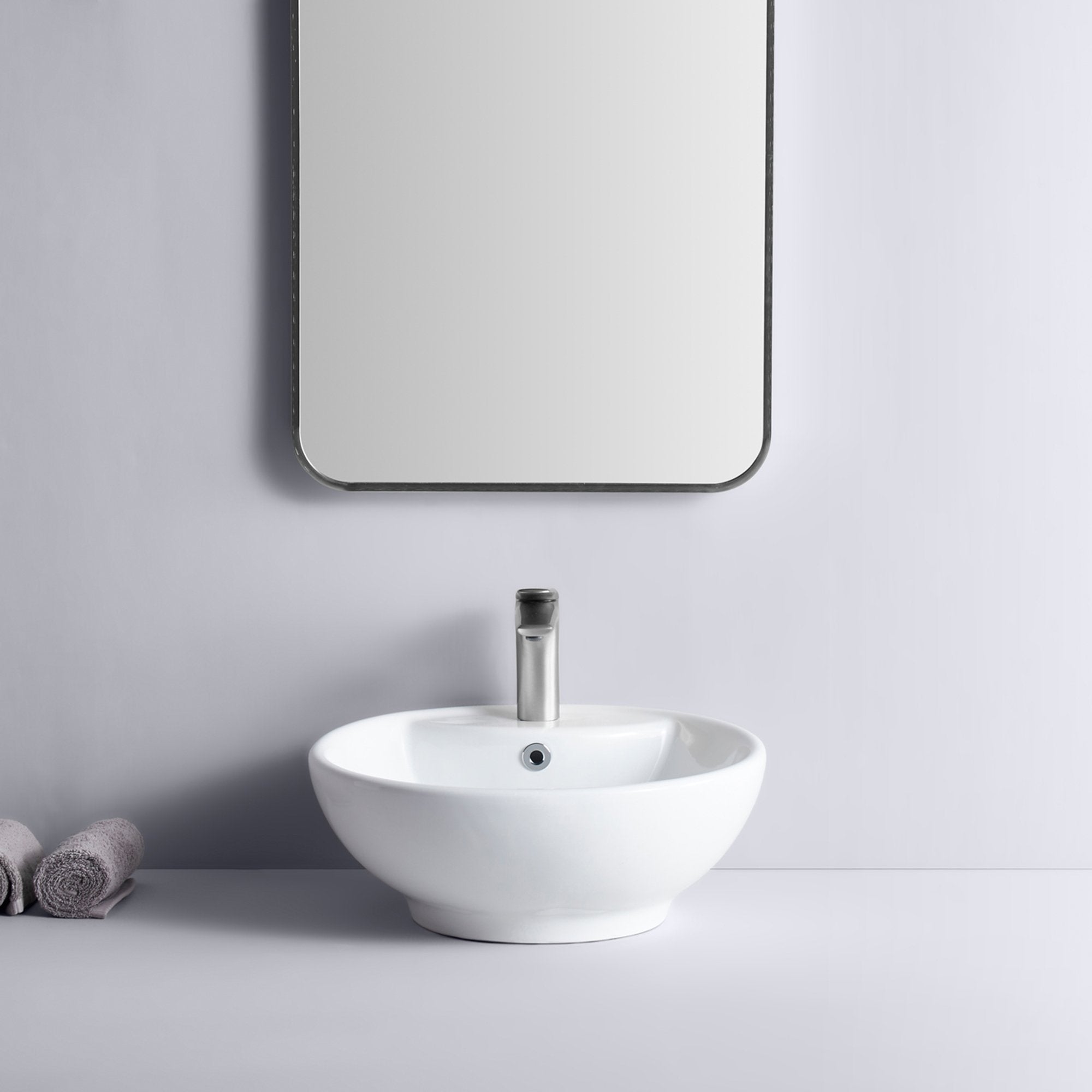 Made of premium ceramic,solid and durable, the white bathroom vessel sink has no risk of thermal shock, and it will not blister, melt or discolor from hot water;The vessel sink will nicely fit on the counter with relative large hole to provide maximum water drainage, smooth and polish surface of the basin making it easy to clean and maintain, and always shines like a brand new one with bright white color.