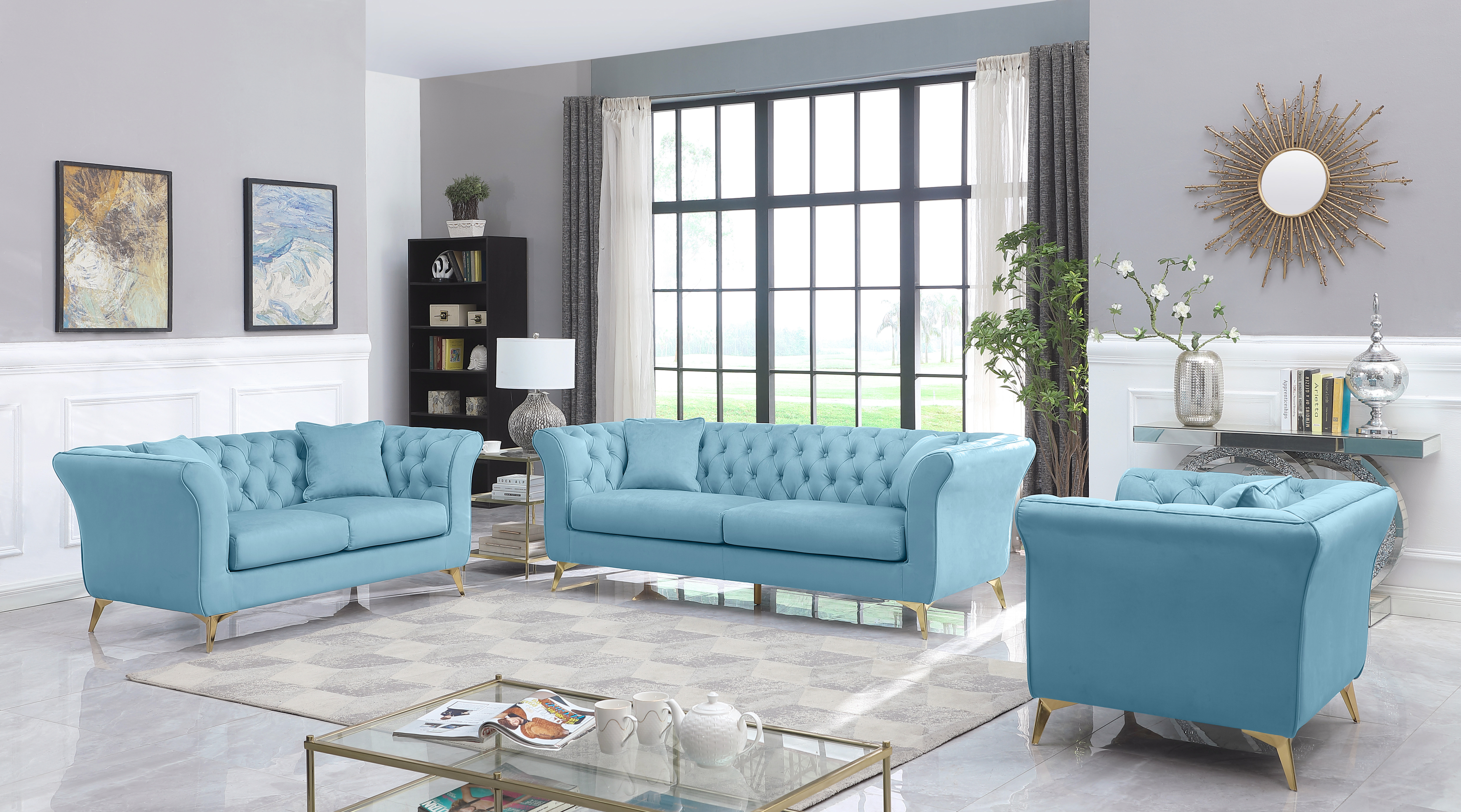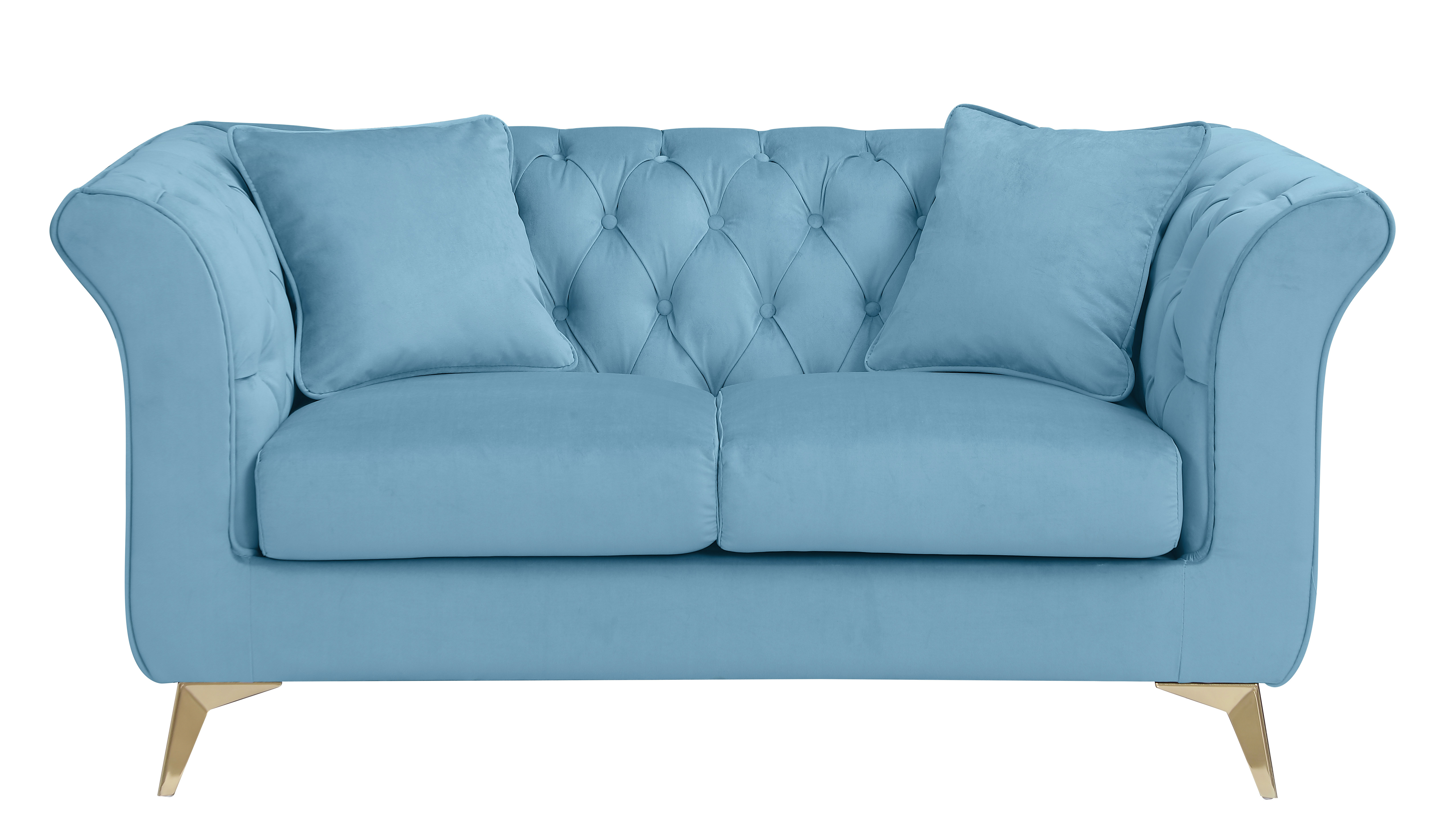 A traditional Chesterfield taken on a modern look, the loveseater is making piece of beautiful design. High GSM velvet is deeply tufted on inside of the frame, a beautiful design detail that can be seen from any angle in a room. Single "bench" cushions allow for comfortable multi person seating without cushion separations. The flared arm and contemporary golden color Y shape legs make it looks very modern and the deeply tuftings makes it looks luxury and valuable. Suited for both traditional and contemporary design environments.