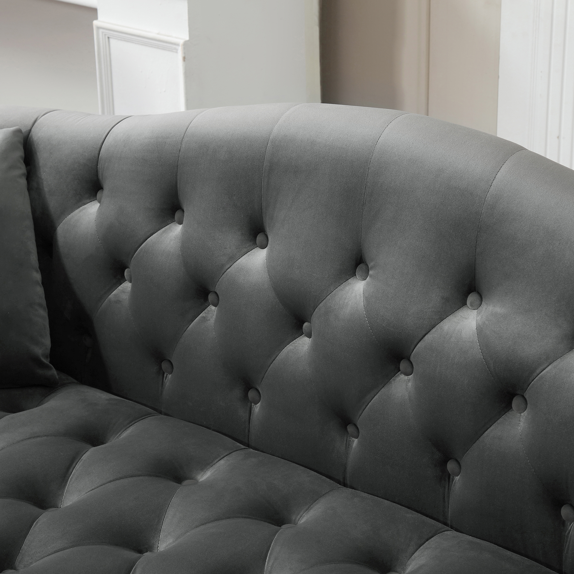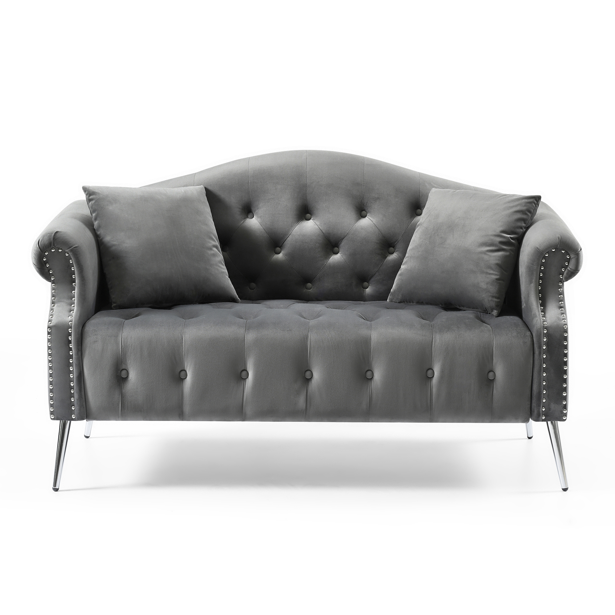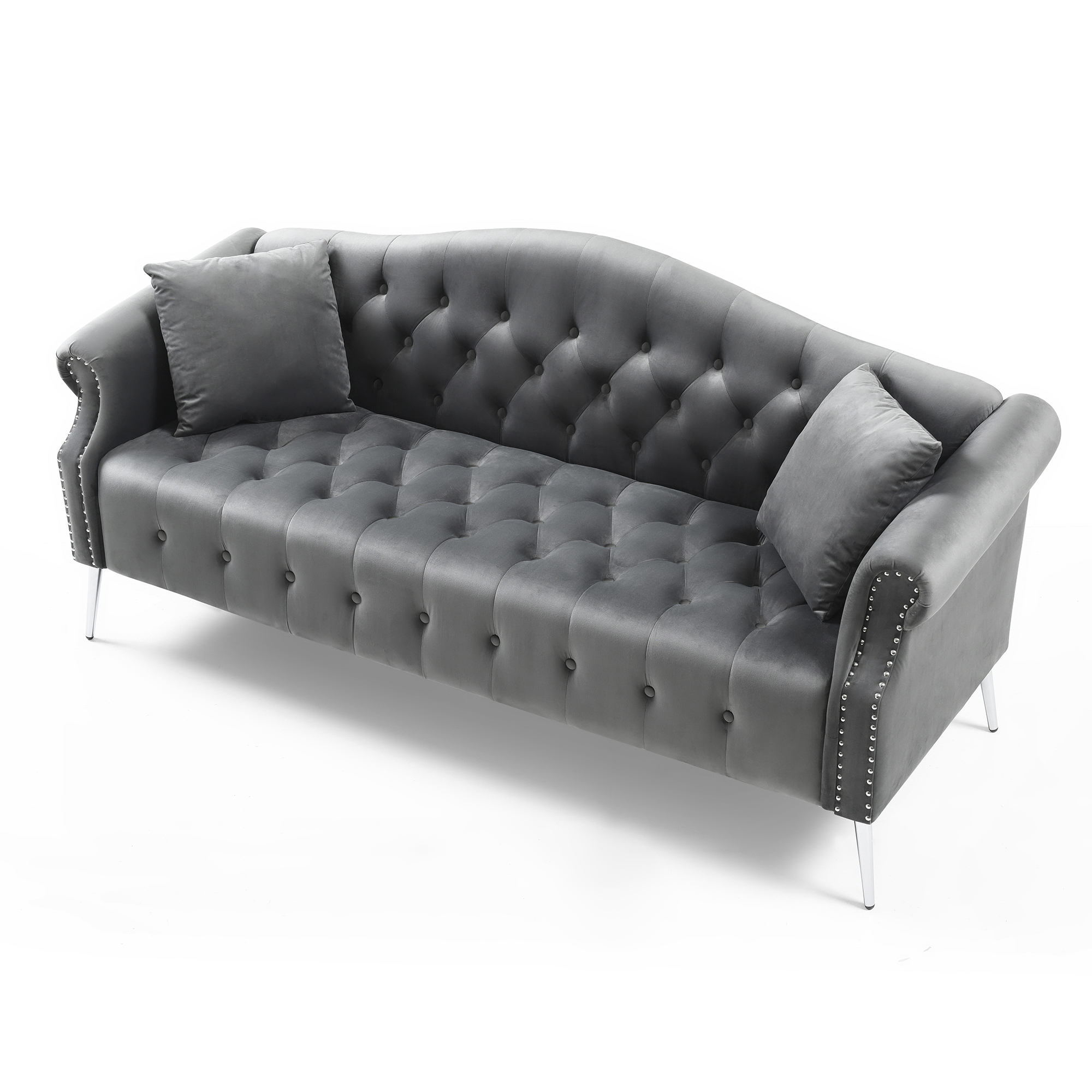 This chesterfield style living room sofa and loveseat set feature with soft velvet,button tufting,nail head trimming,elegantly curved backrest,rolled armrests and silver metal legs.Each nail head is individually applied for a neat and handcrafted touch.High-strength sinuous springs and high-density foam used on both seating and backrest provide long lasting comfort and support.KD design allows for easy delivery to any home or room.Minor assembly is required,just follow our instruction.Packed in four cartons,delivery maybe in different date.Simply spot clean with a damp cloth.