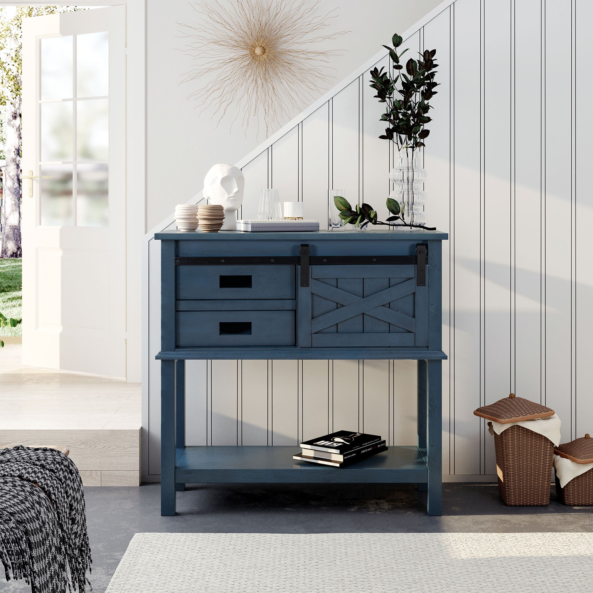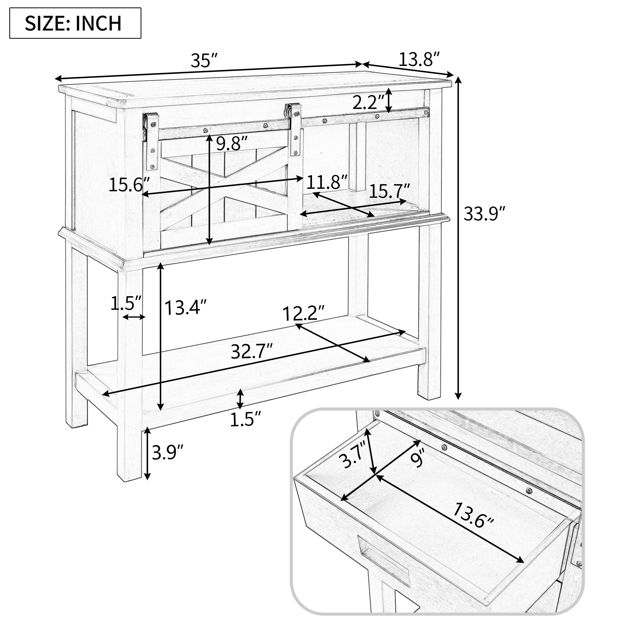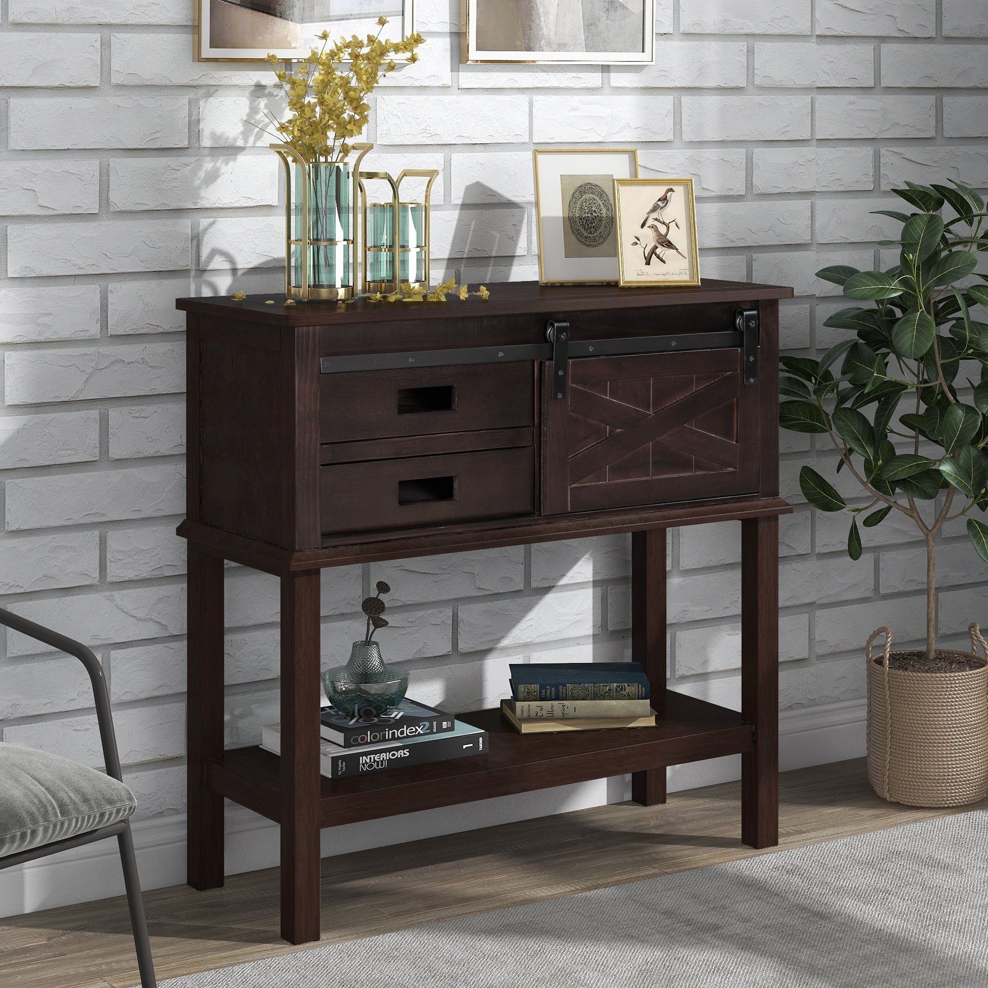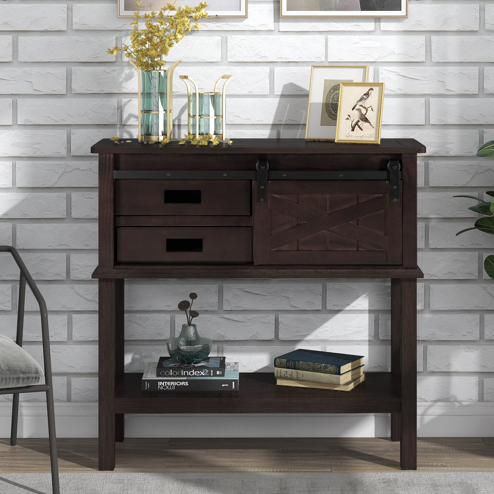 Classic Farmhouse Style Pine Wood Console Table with Sliding Barn Door and Two Drawers One Cabinet Open Style Shelf