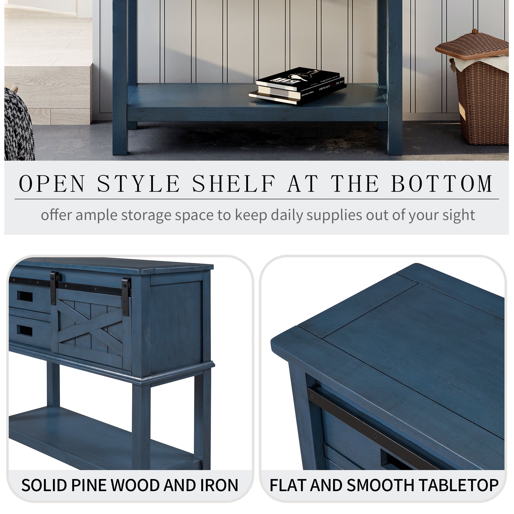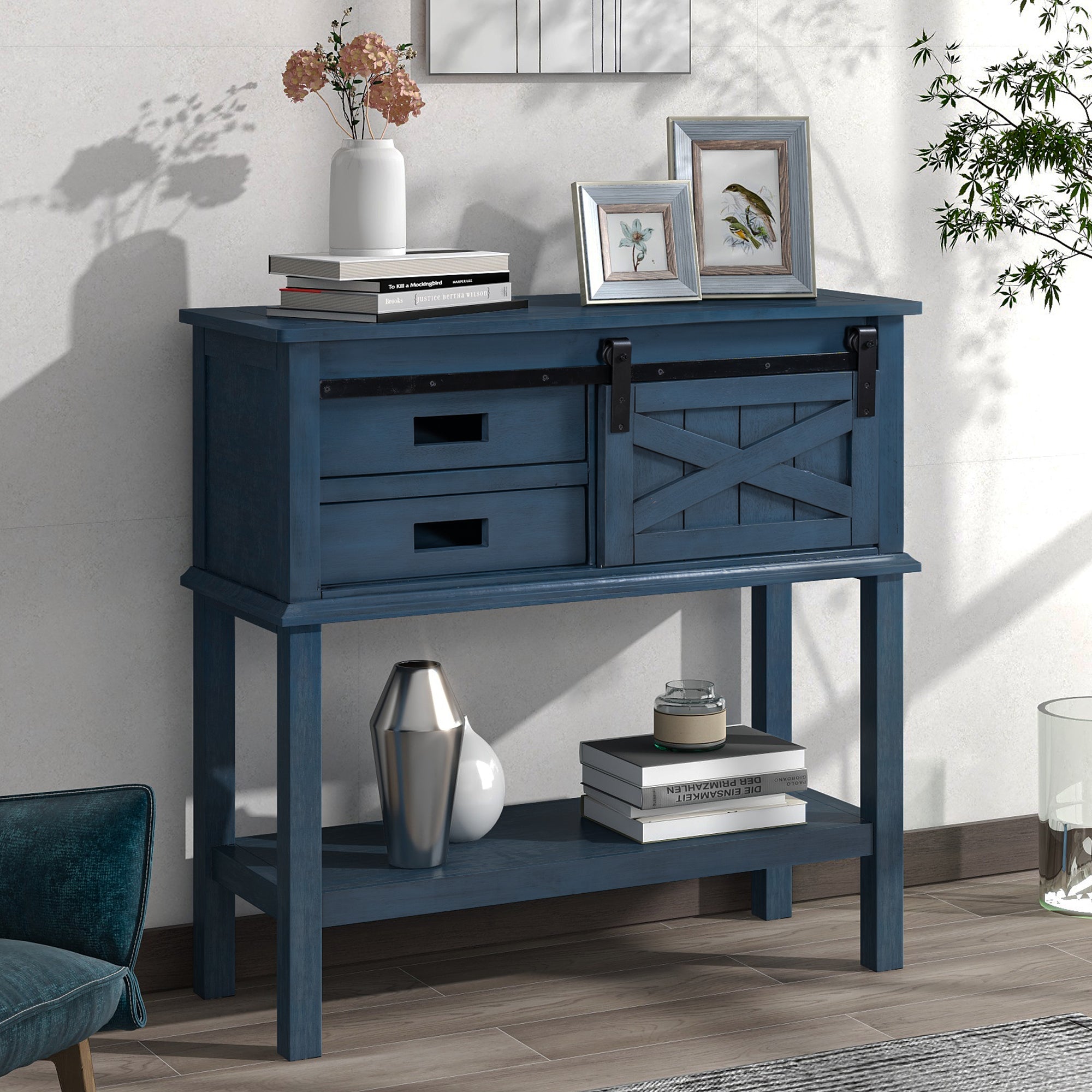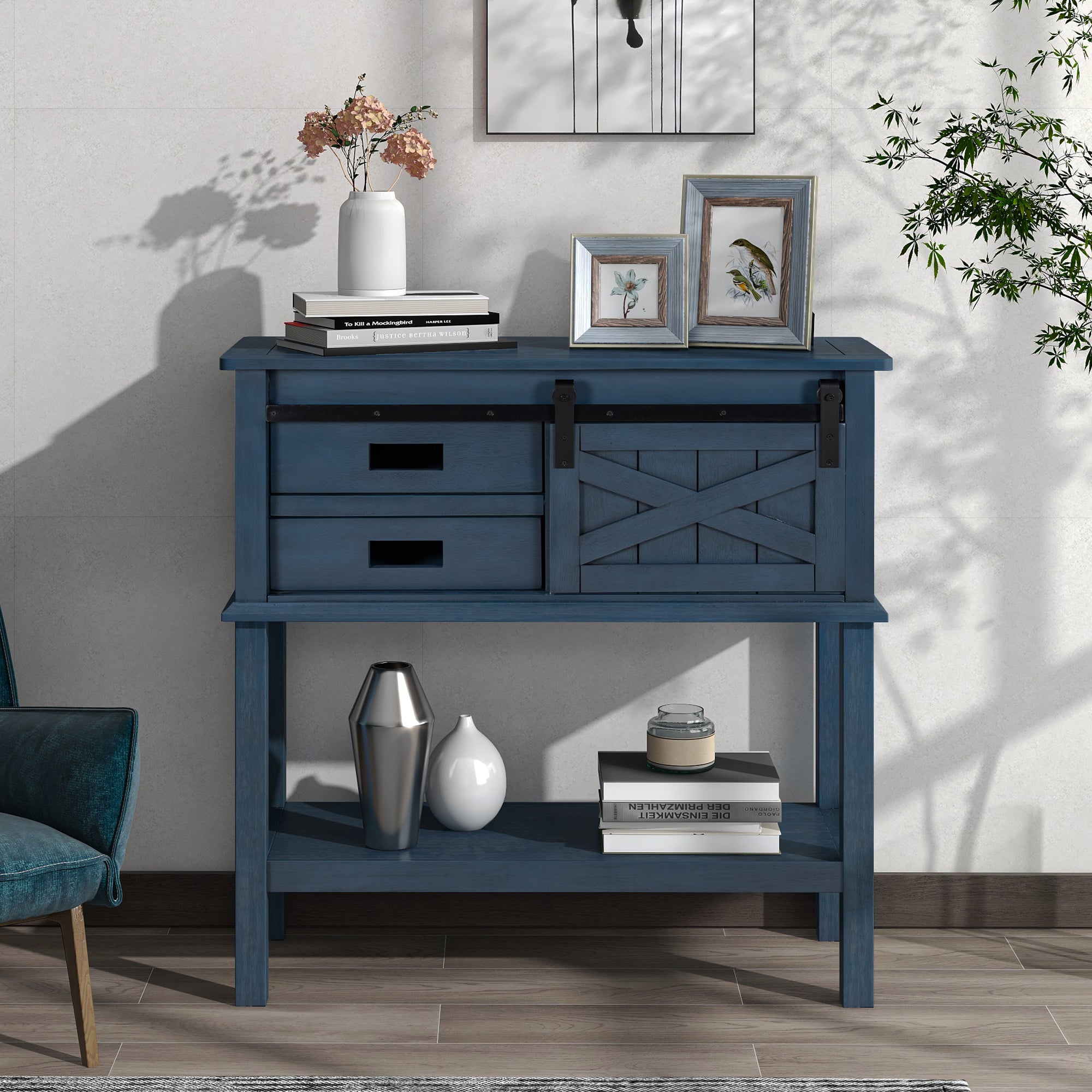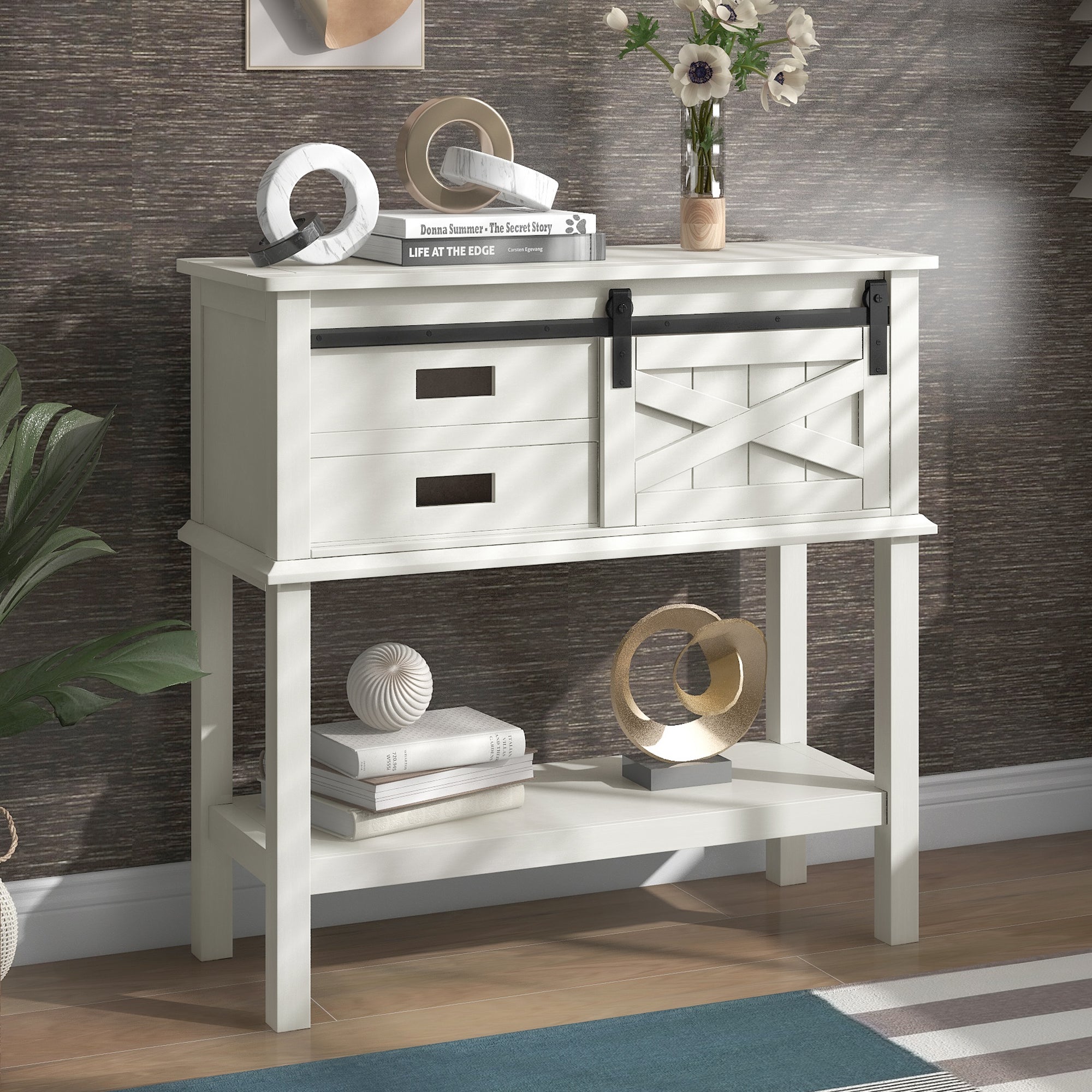 Classic Farmhouse Style Pine Wood Console Table with Sliding Barn Door and Two Drawers One Cabinet Open Style Shelf