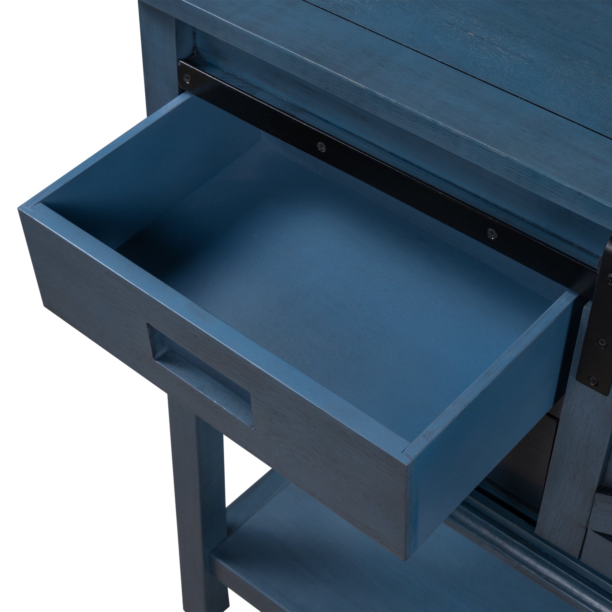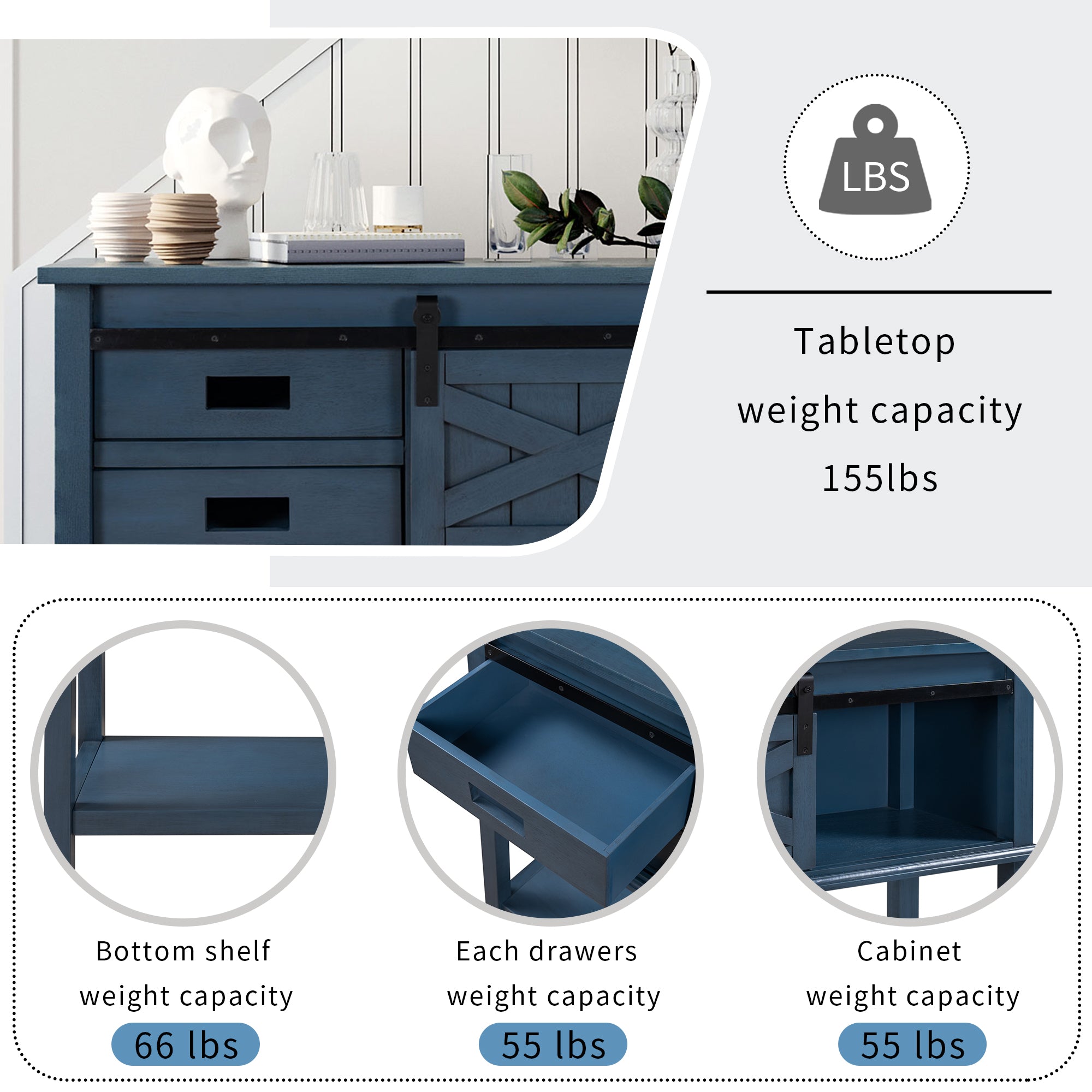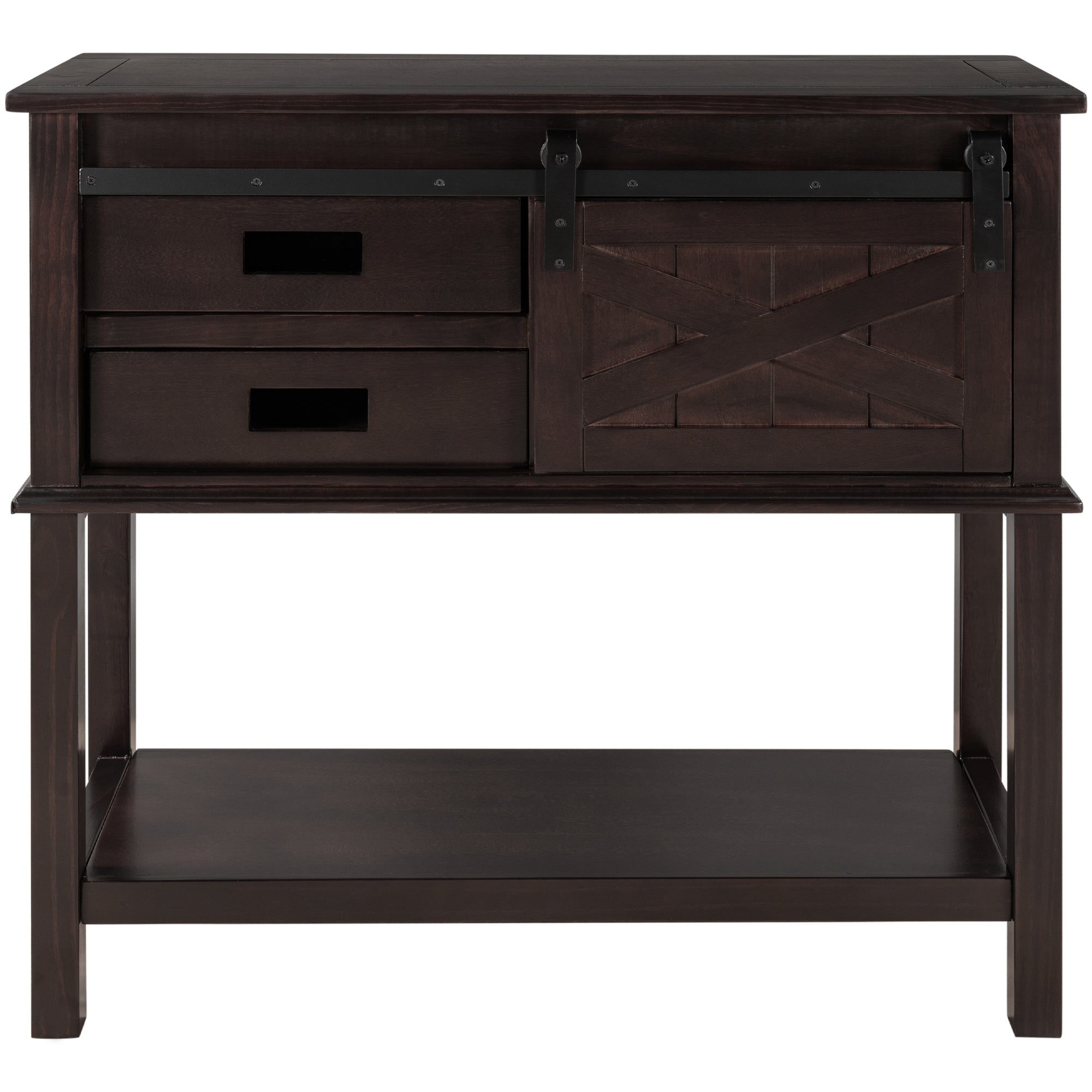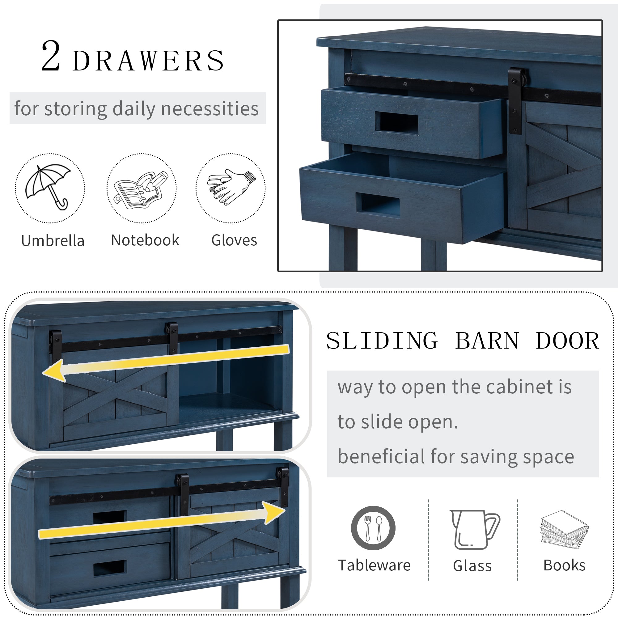 Classic Farmhouse Style Pine Wood Console Table with Sliding Barn Door and Two Drawers One Cabinet Open Style Shelf