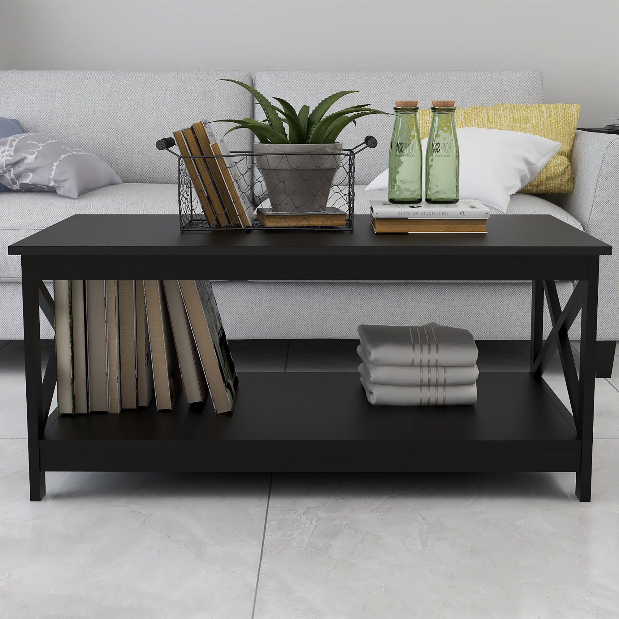 This black coffee table with X-shaped legs has high stability and durability. The appearance of black is more advanced, giving people a sense of mystery. Simple assembly, suitable for living room and bedroom, which can decorate your home well