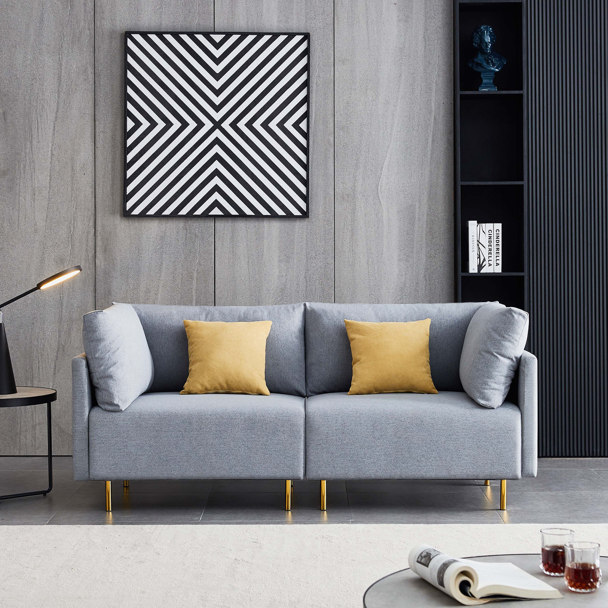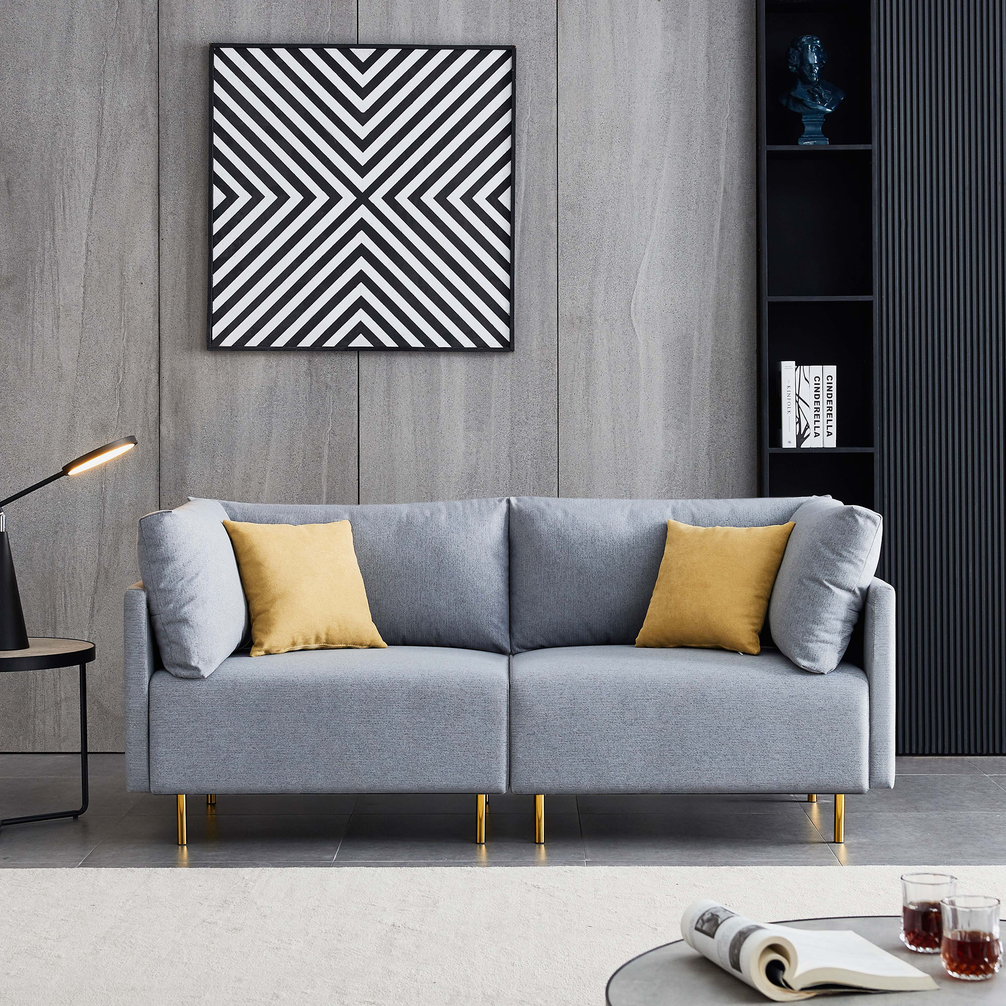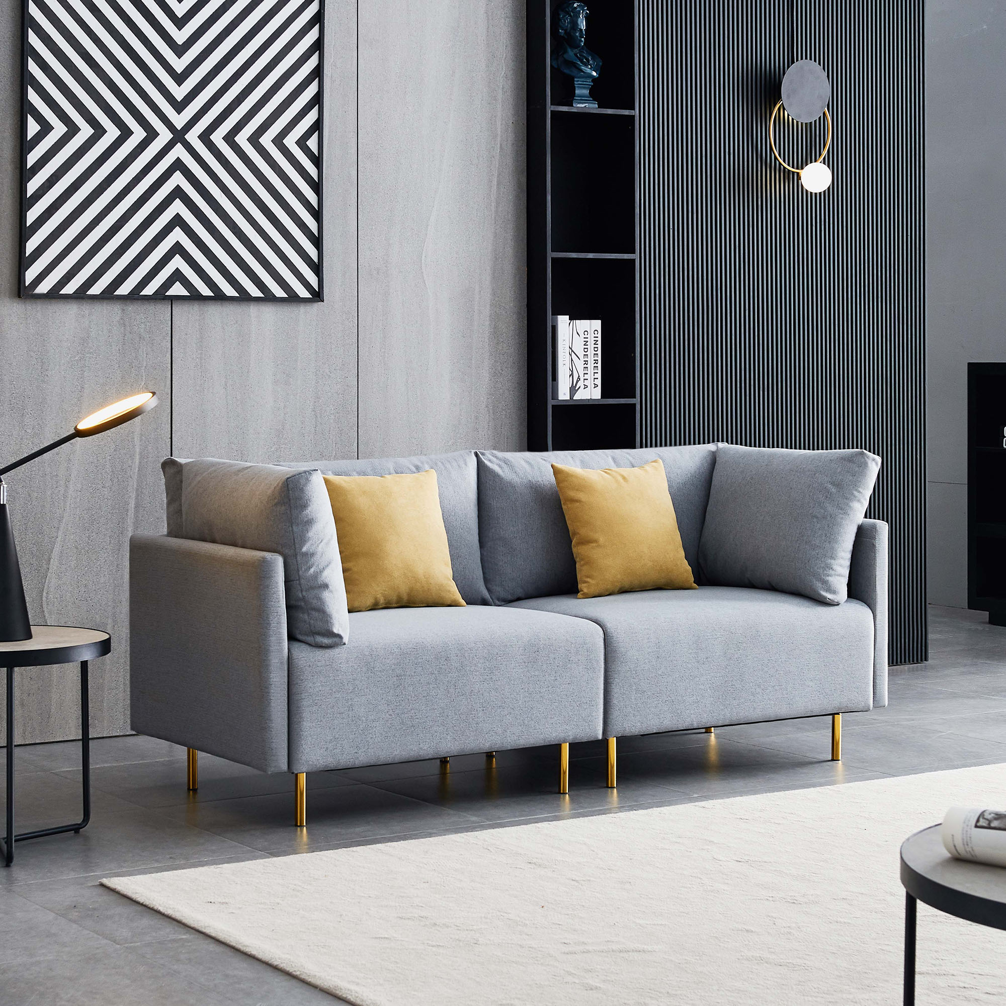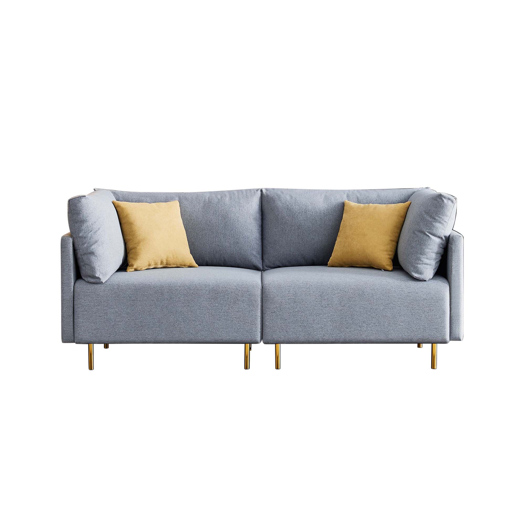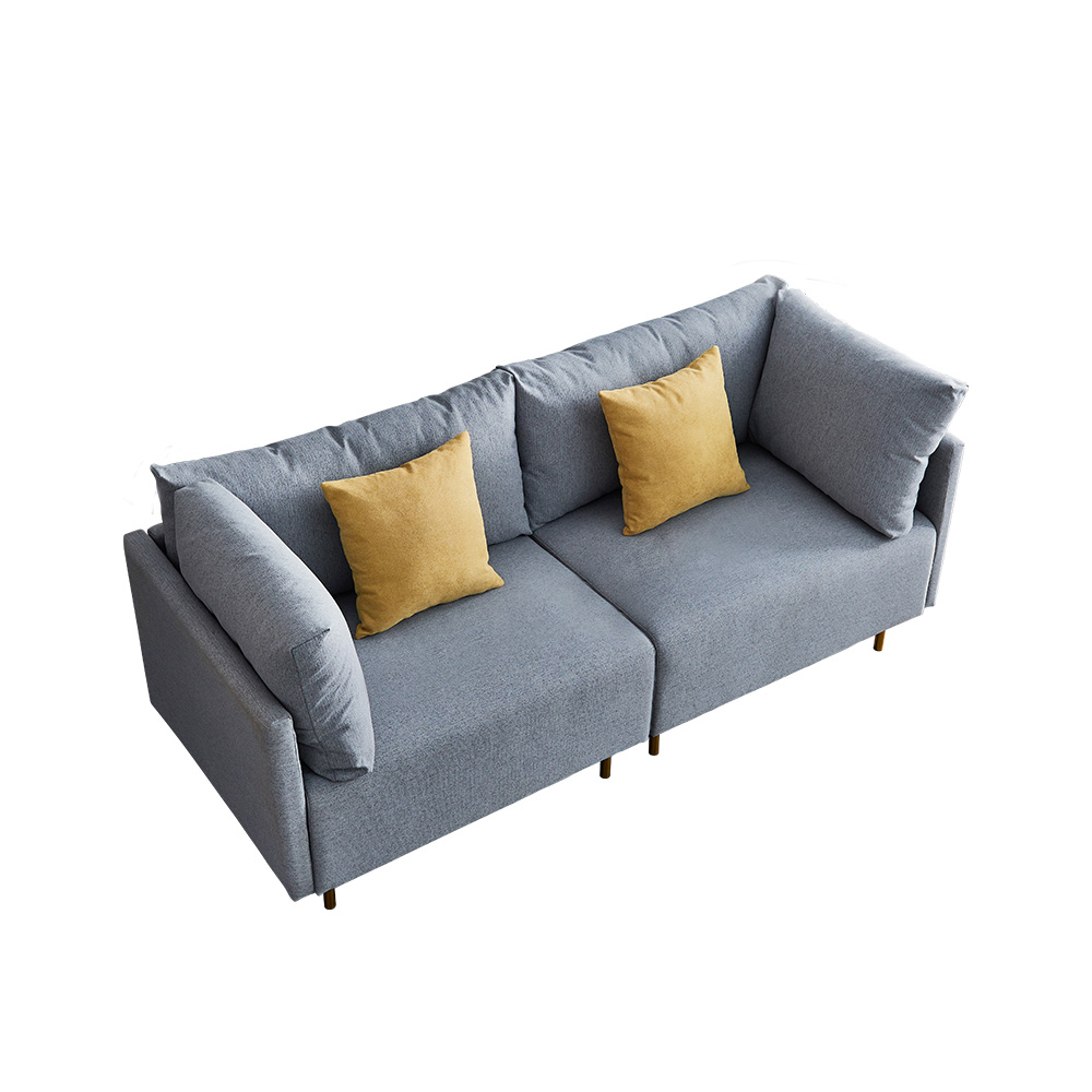 1.COMFORTABLE DESIGN:Wide &comfortable cushions are a hallmark of this modern sofa. Easy-care removable cushion and bright color pillows make this piece looking fresh. A strong solid wood frame connects to cylindrical golden metal legs and structure to the foam-seat cushions. Soft arms give additional support.Such comfortable attracts you to sit.