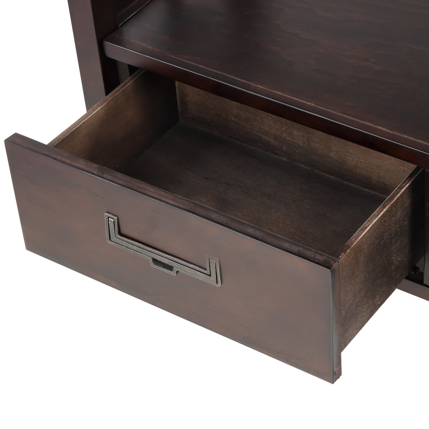 Features two special bottom storage drawers to tastefully tuck away your belongings with seamless accent distressed metal front facing pull-away handles