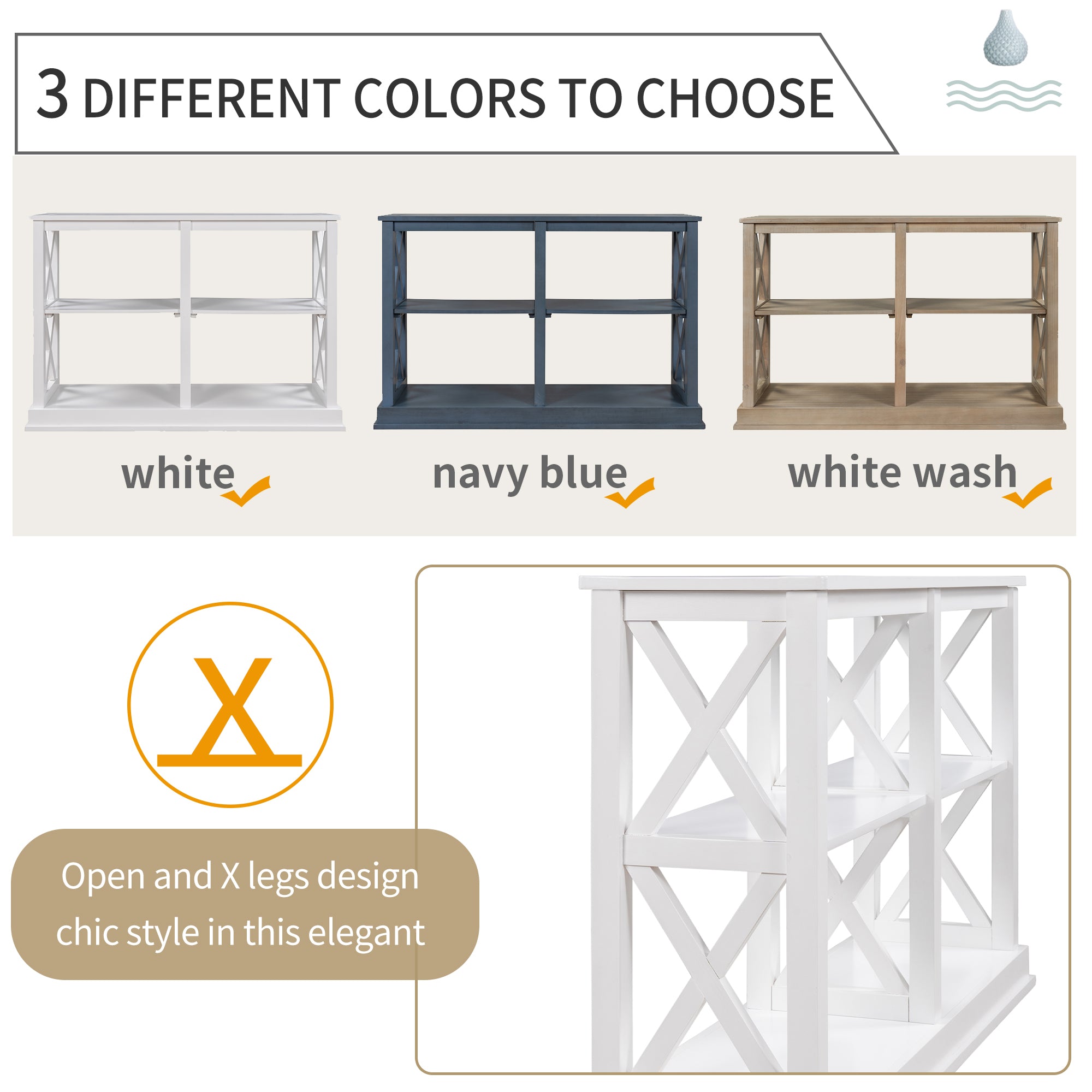 CLEANNESS and COLOR: The open design console table allows user clean it effortlessly, and offer large storage space. This console table has white, white wash, navy blue three different colors to choose.