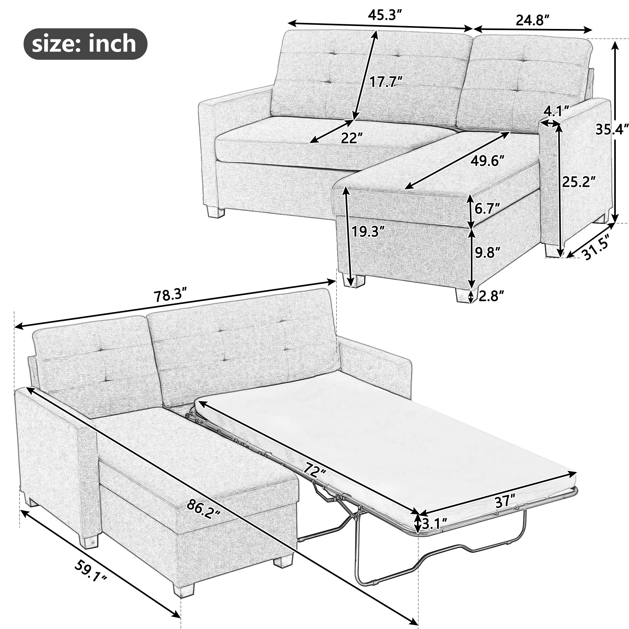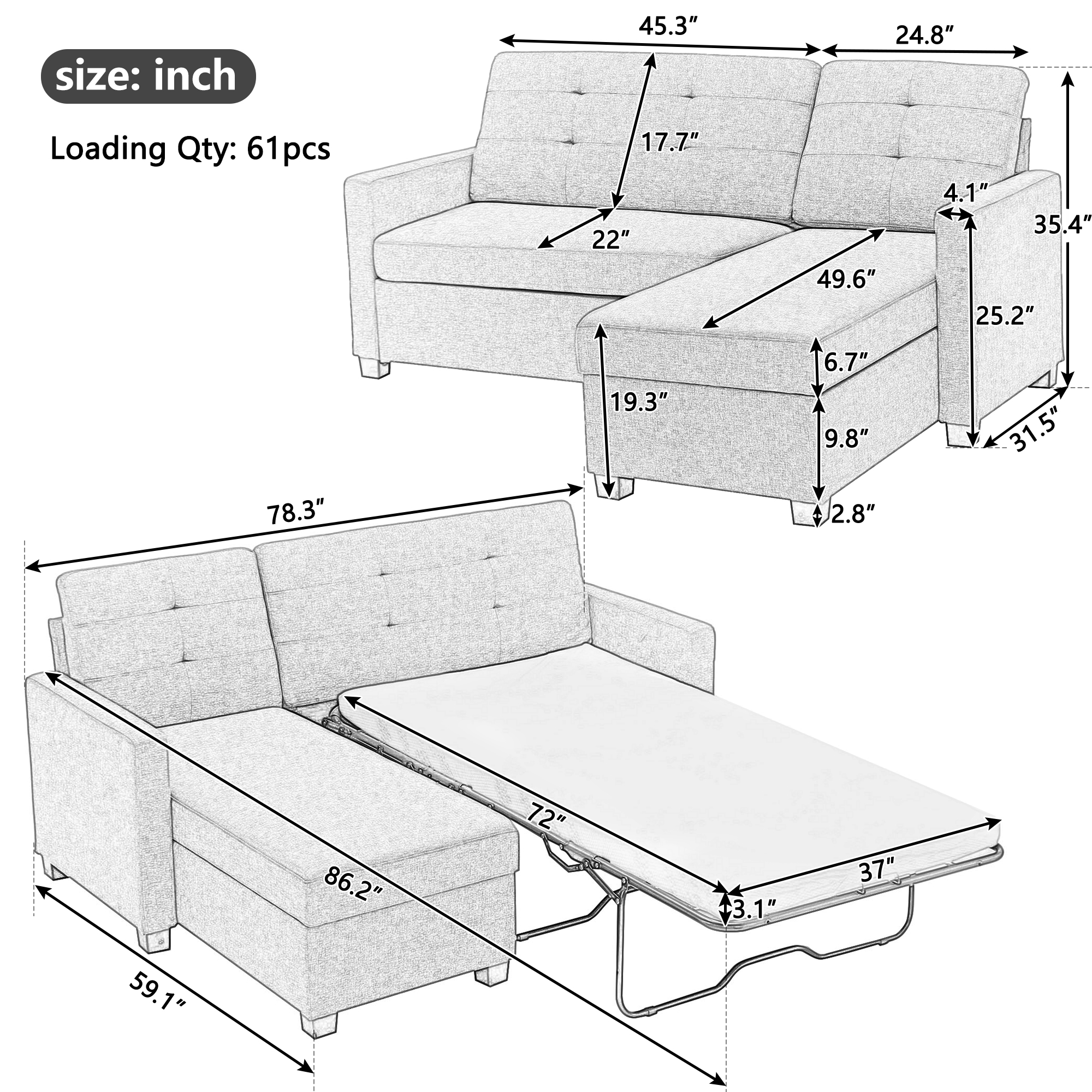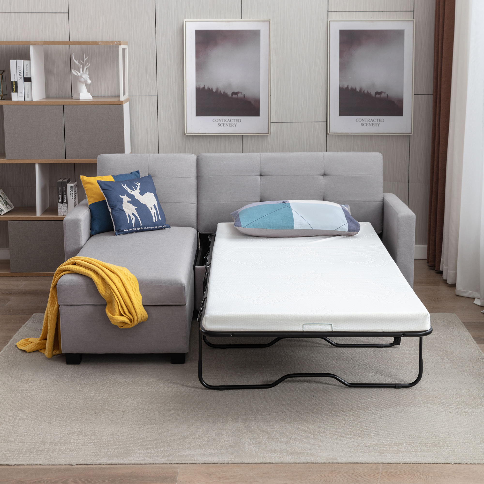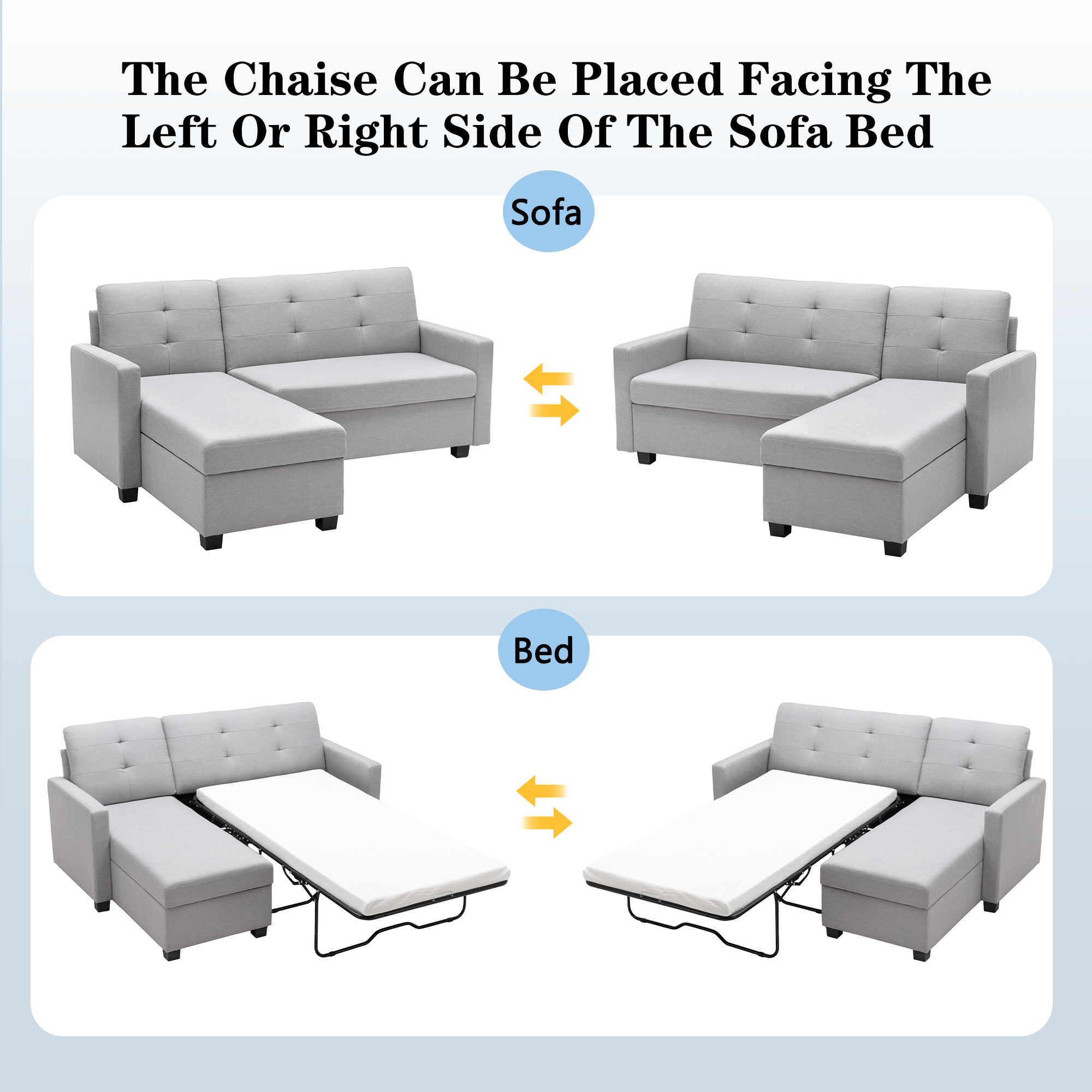 ▲Selling Points【Multi-Function Sleeper Couch 】The pull out sleeper sofa is a comfortable couch that can be easily and quickly converted into a visitor bed when a friend needs to stay overnight.【Sofa Bed Includes Mattresses】This sofa bed includes a foldable mattress, you don't need to buy an extra mattress, just simply prepare a sheet, can enjoy a comfortable sleep.【Free Combination】You can change the shape of the couch by moving the position of the chaise. The chaise can be assembled both on the left or on the right.You can adjust your living room funiture freely according to your needs and preferences.【Hidden Surprises】Bonus storage function under the chaise. It is not only a good choice for children ’s toys, but also can store blankets ,magazines,and living room items.【Ultimate Comfort】Sofa wrapped in high-quality linen, skin-friendly, giving you a gentle touch; Cushions filled with high density foam, which is soft and elastic, giving you an enjoyable rest experience.▲Product Details: