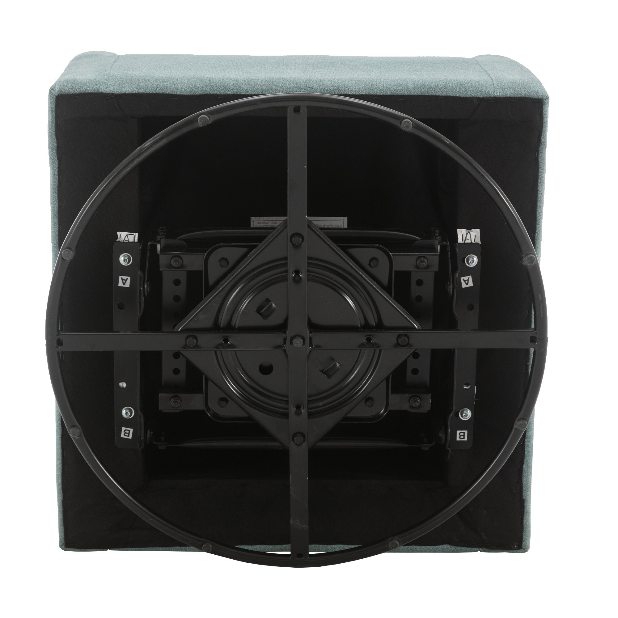 The Harlow has a solid metal base that easily supports  swivel rotation and gliding capabilities. It is covered with an easy to clean durable polyester fabric with foam filling, and has convenient side pocketsher!