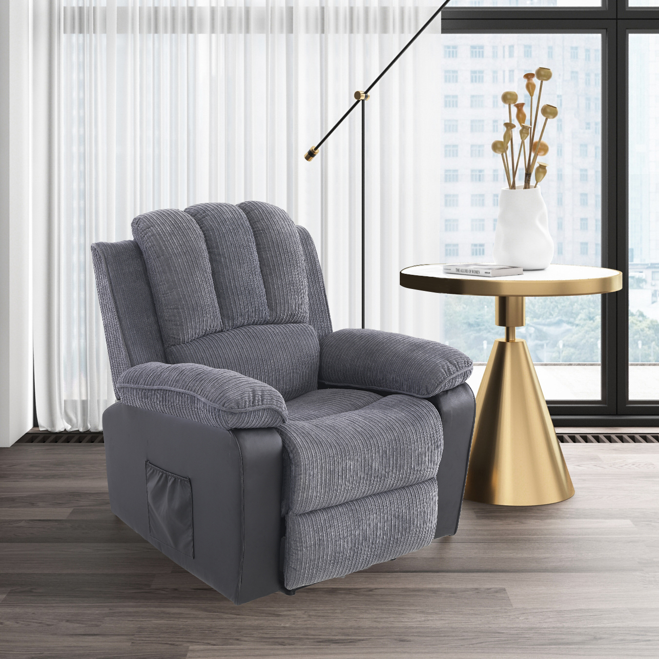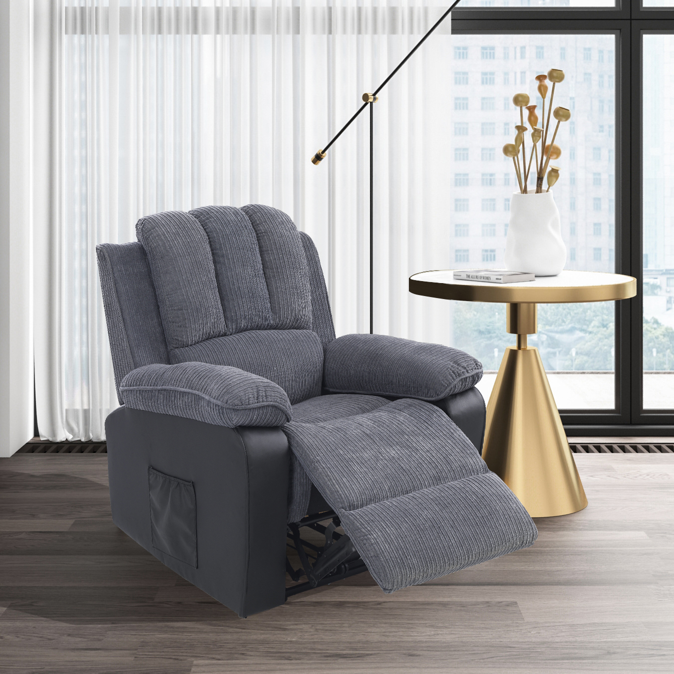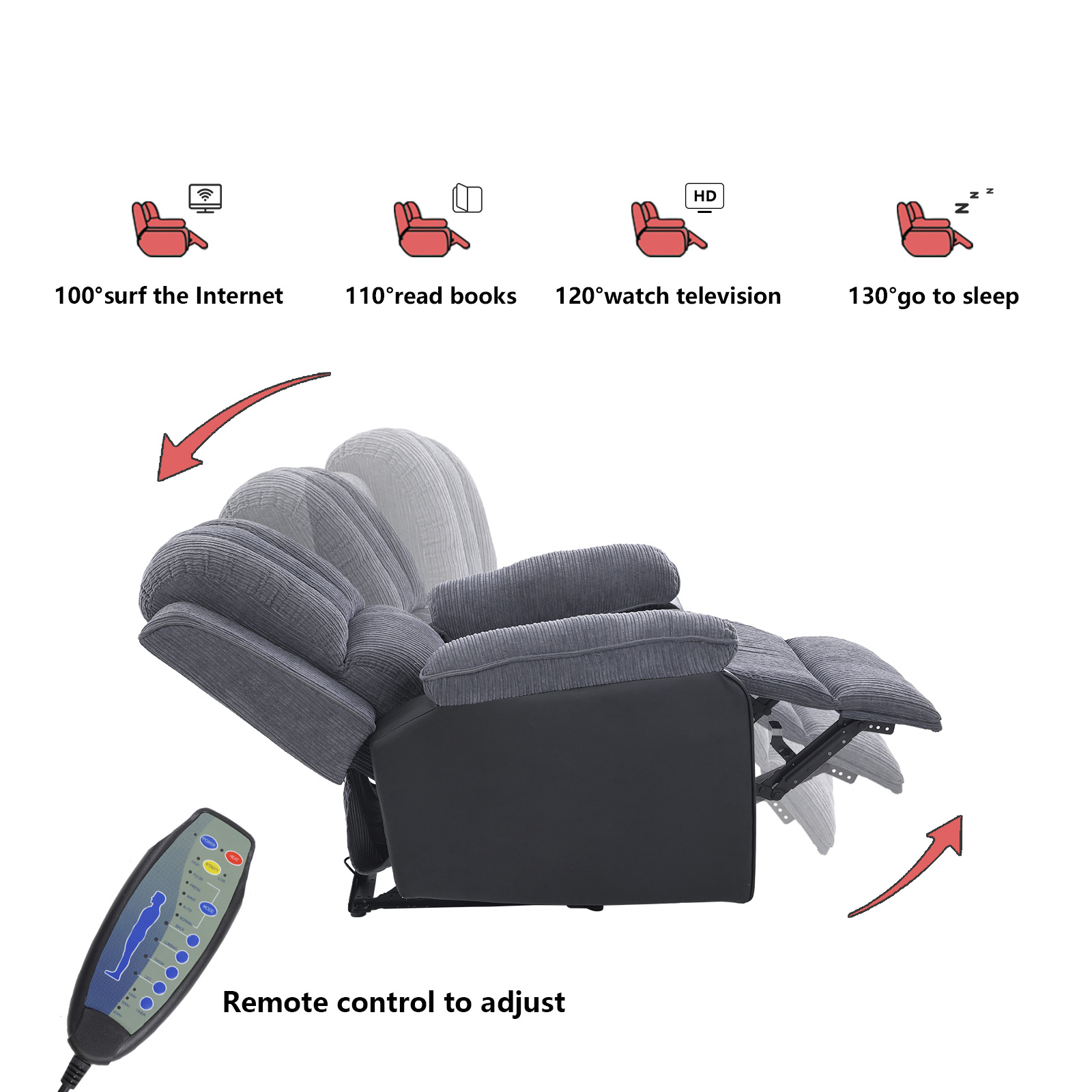 [Vibration massage + heating function]: The entire electric reclining chair has 8-point massage + heating function. The 8-point massage is distributed at 2 points above the backrest + 2 points below the backrest + 2 points in front of the cushion + 2 points at the footrest, there are five different The intensity adjustment of the gears brings you a comfortable body massage, and when you come home from a busy day, you can feel the best relaxation experience for your back, lumbar spine, thighs and calves. You can also use our attached massage remote control to adjust the time you need to massage, he can set 15 minutes, 30 minutes, 60 minutes respectively. Lots of options to bring convenience to your life! The heating is performed at two points under the back, and the heating is performed at the same time as the massage at the two points under the back, or it can be performed separately. 【High-quality fabrics】: We use high-quality high-density corduroy fabrics and black pu artificial leather fabrics to make products. We take a lot of small details in our sampling, which can make you sit very comfortable and guarantee to give You bring a different experience! 【The backrest can be adjusted freely】: We also have a hand controller for adjusting the backrest, which is equipped with a motor with slight noise, which allows the backrest to be freely tilted from 90° to 130°, you can remotely control the TV or read books, Adjust it to your liking and use it while you nap! You can relax your body and mind at the same time and spend a good leisure time. 【Ergonomic Design】: Our engineering reclining chair that perfectly fits the human body curve design can effectively improve your whole body pressure. This is very suitable for the elderly. Hurry up and buy one for the elders. Bar! [Stable support + durable]: Our wooden frame structure is made of high-quality and sturdy horizontal slats + multi-layer boards + cardboard, and the seat frame and back frame also have S bow springs that pull up and 5 cm rubber bands that pull up, very It is firm and the bearing capacity is as high as about 330 pounds, which can be better durable, and obese partners do not need to worry, the safety guarantees that we check every layer, you can buy it with confidence. [Thickened armrests and backrests]: Our armrests and backrests are filled with high-density native doll cotton and native cotton + spring packs, with good resilience and no need to worry about quality. We are a company that pursues quality. Company, we check, you can rest assured! [European and American styles are widely applicable]: The gray chaise longue is stylish, simple and simple, and can be applied to various environments, such as bedrooms, living rooms, study rooms, offices...many places. 【Extra Footrest + Side Pockets】: We also have a comfortable extended footrest, which can be adjusted in translation along with the backrest, allowing your legs to have a comfortable experience of relaxing muscles. The included side pocket can be installed in the motor of the product, which is very convenient, and the remote control can also be put in. 【Easy to install + buy with confidence】: All mounting hardware is included in the package, no additional tools are required. Easy to assemble with detailed installation instructions, detailed instructions to help you install in 15 minutes! If you don't understand, you can contact us, we will be happy to help you. All our products are guaranteed quality and rest assured to buy!