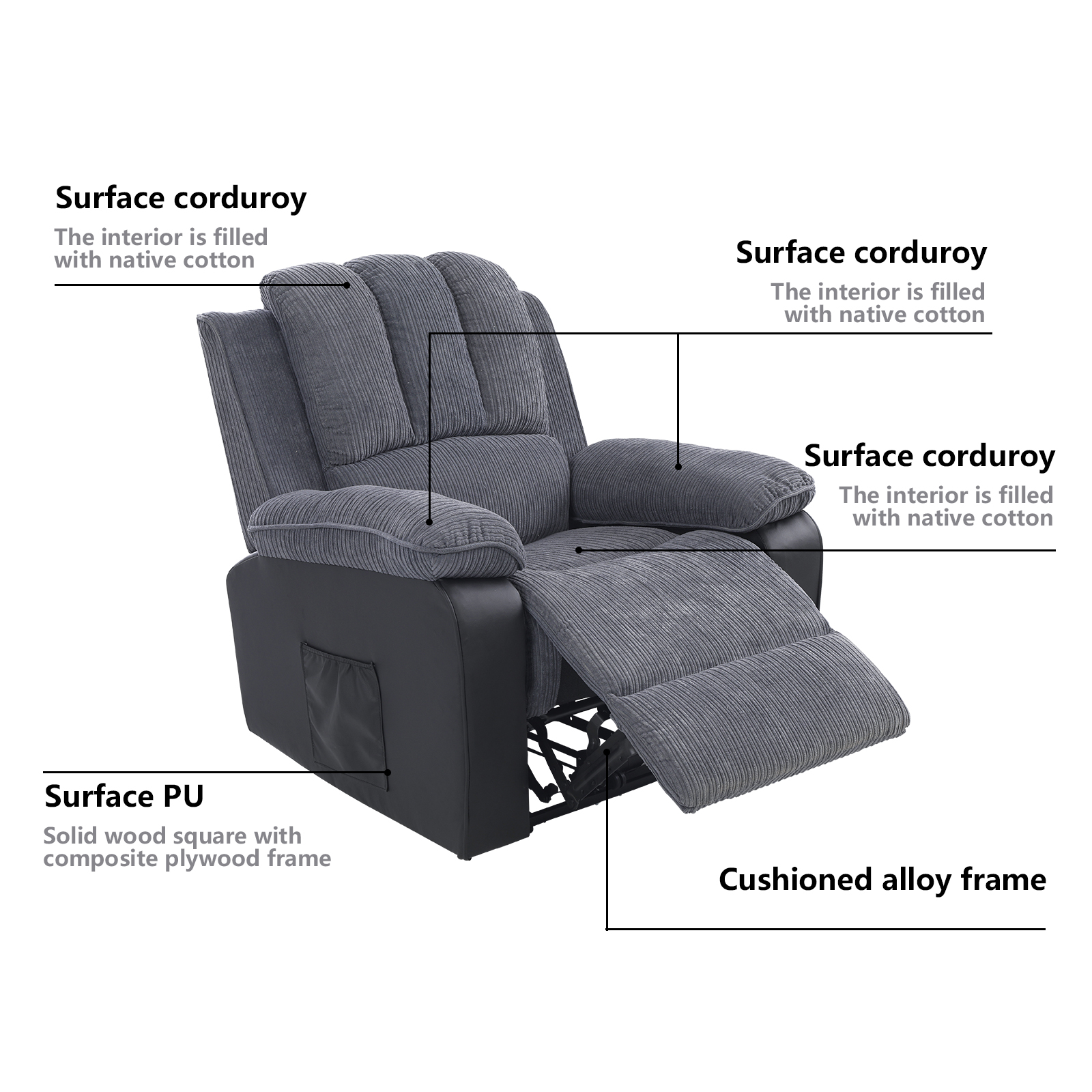 Fabric: mother and daughter corduroy + black pu color: gray Material: The backpack armrest bag is filled with native doll cotton, and the seat bag is filled with native cotton + spring bag Internal structure: The wooden frame structure is horizontal slat + multi-layer board + cardboard, the S bow spring is pulled on the seat frame, and the 5 cm rubber band is pulled on the back frame. Overall size: 73*98*100 (cm) Back Height: 27.56 inches Seat to Floor: 25.2 inches Back to ground: 39.37 inches Extended footrest: 18.5 inches Overall Length Unfolded: 64.96 inches Weight: 330 lbs Carton size: A box: 76*60*50 (cm) B box: 76*57*57 (cm) Quantity: 1 piece/2 boxes Country of Origin: China