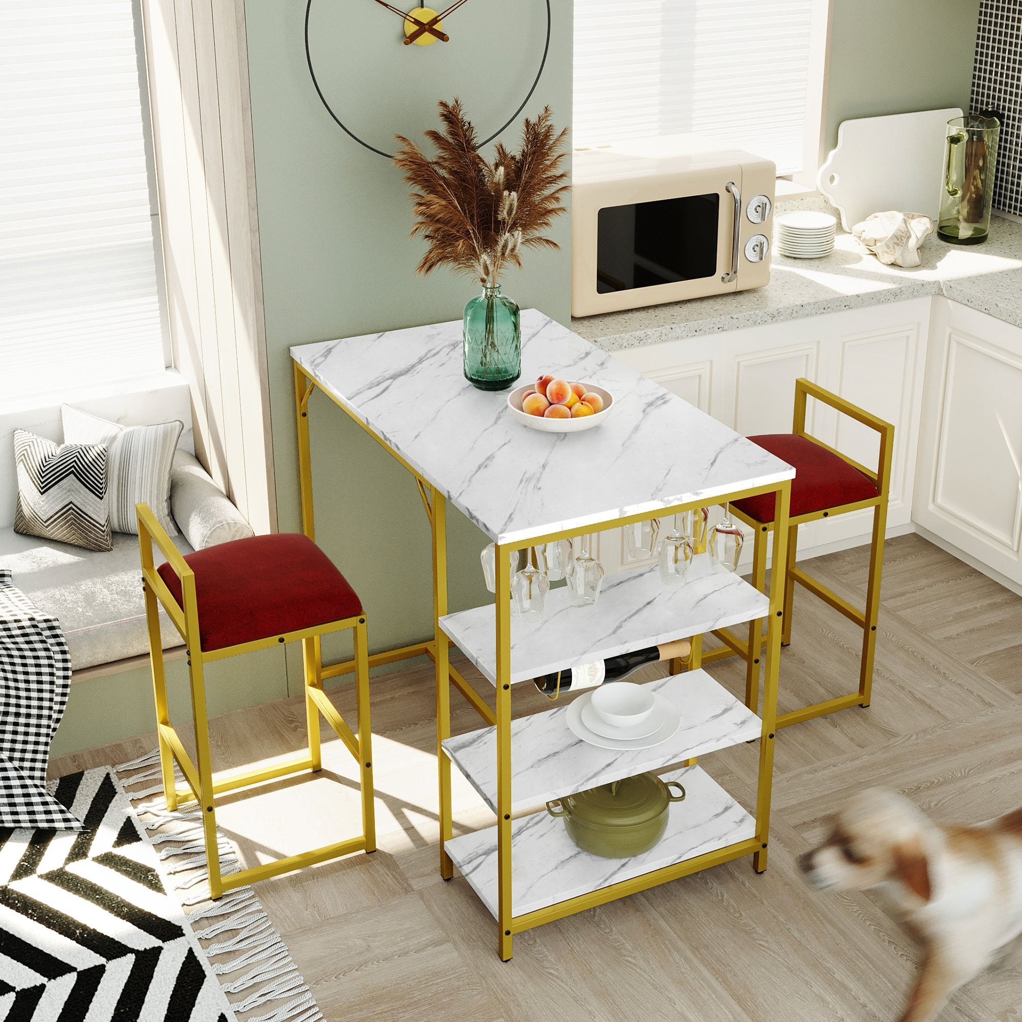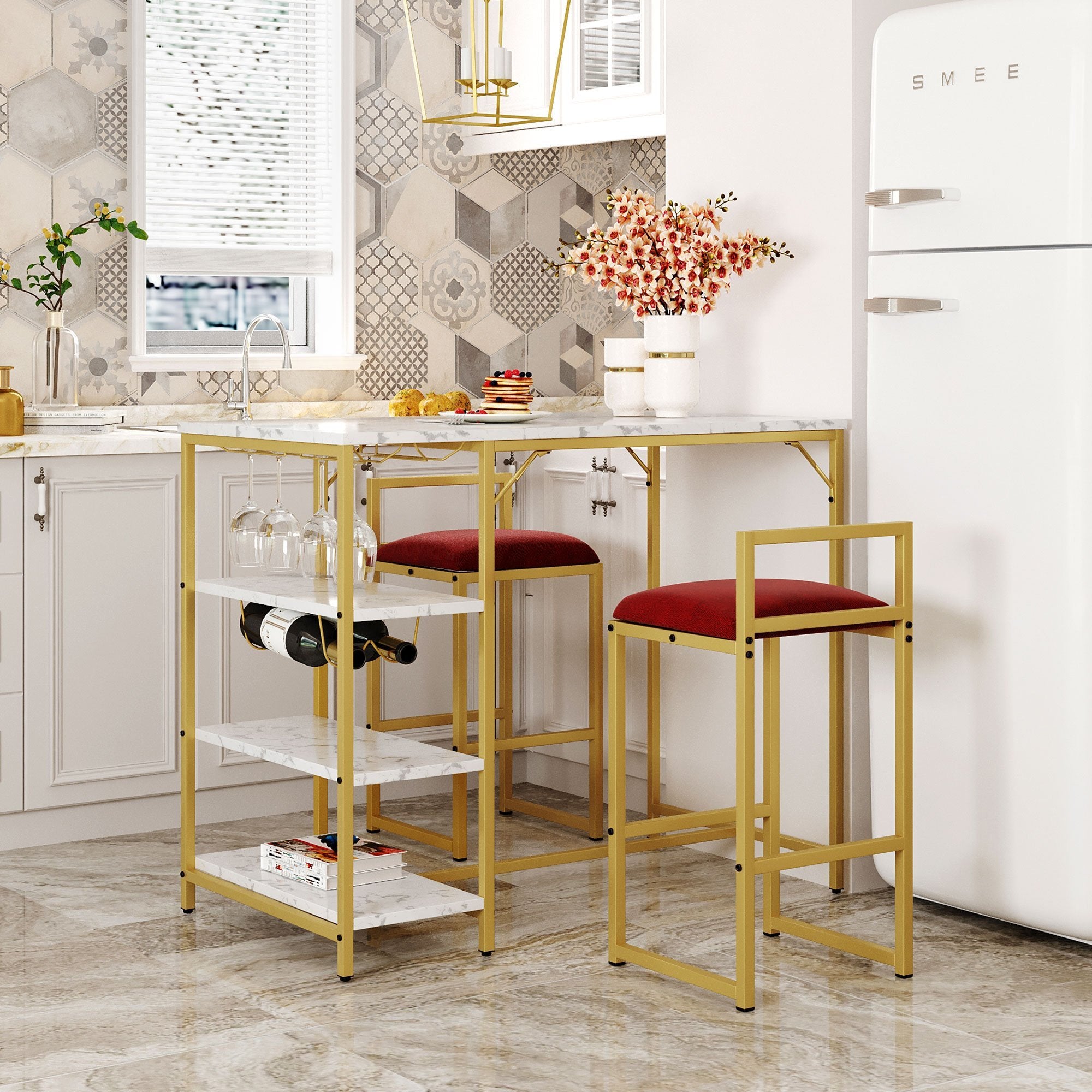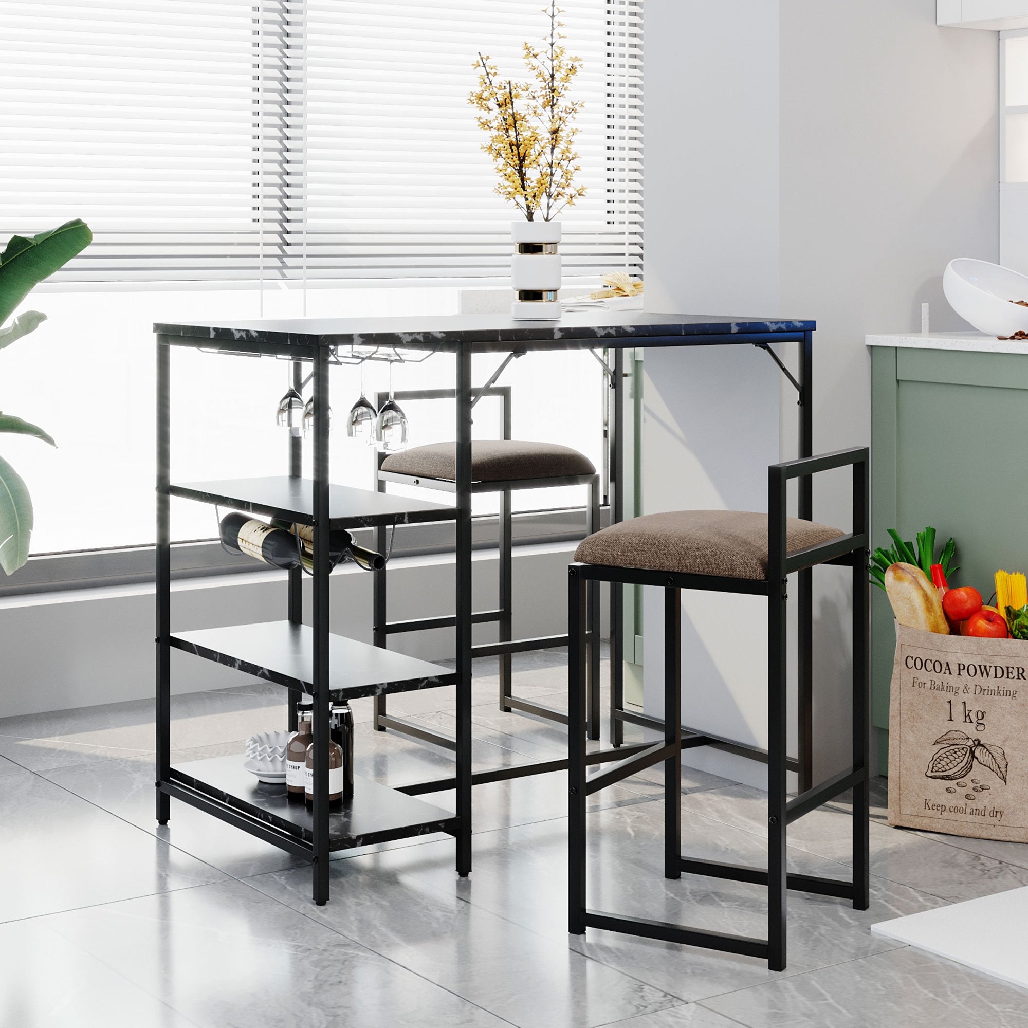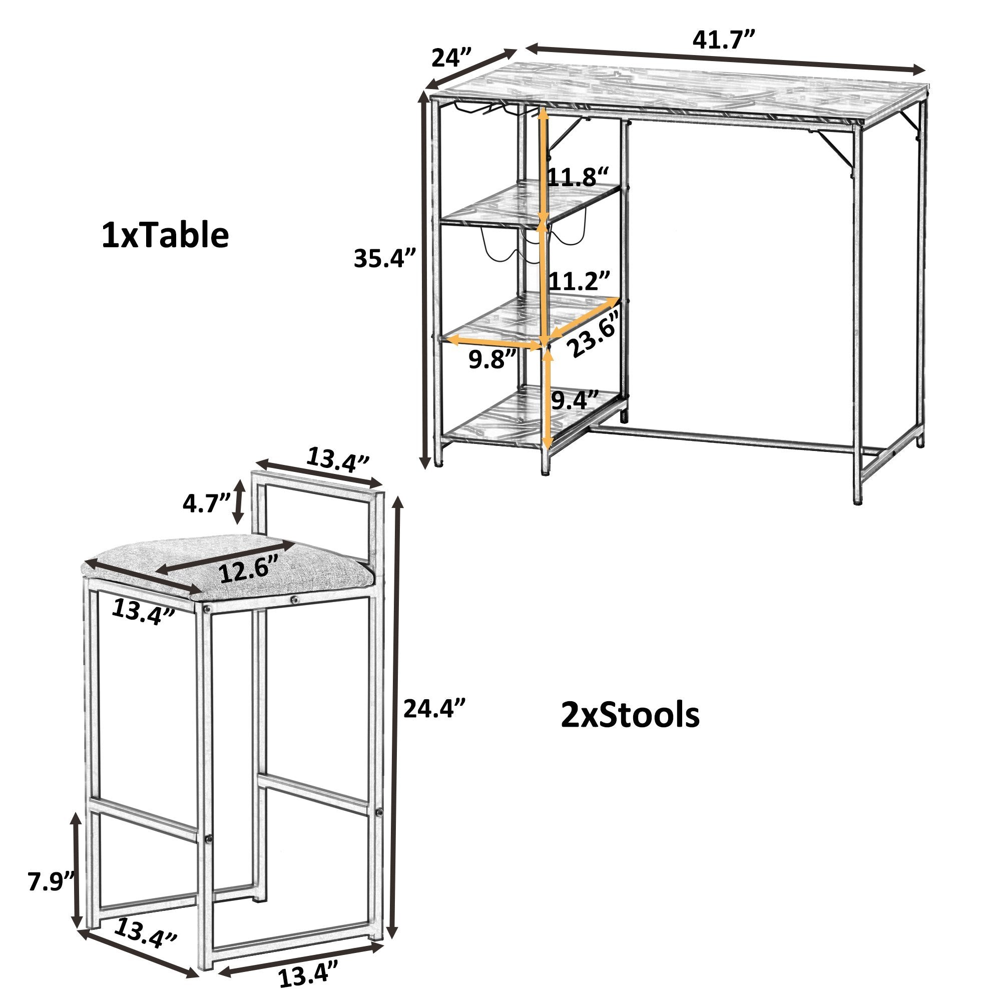 Counter Height 3-piece Bar Dining Table Set with 2 Upholstered Bar Stools/Chairs, 4 Glass Holders,2 Wine Racks and 3 Open Storage Shelves for Small Places