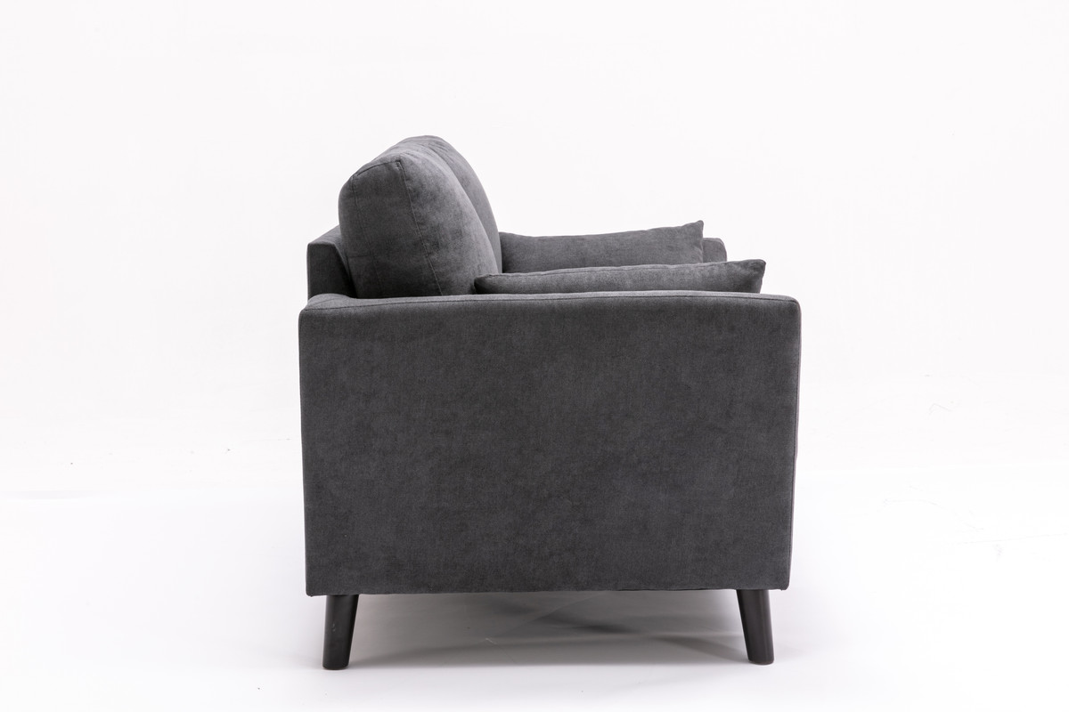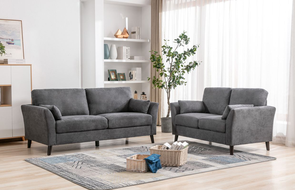 The Damian 2 piece living room set is a classic. It's simple design is guaranteed to stand the test of time. The smooth surface of the cushions amplify the sense of order and cleanliness of any room. The 4 accent pillows included are designed to keep guests comfortable according to their own needs. With dark brown solid wood legs as support, the Damian Collection is sure to fit the color palette of most rooms. Relaxing on comforting fabric has never been so easy. This set includes 1 sofa and 1 loveseatIncludes 1 Sofa, 1 Loveseat4 Accent Pillows IncludedPocket Coil SeatingSofa Measurement: 77”x34”x35”H, Loveseat Measurement: 57”x34”x35”H19.75" Seat Height21.5" Seat Depth20.5" Arm Height17" Seat Back Height5.25" Leg HeightDark Brown Solid Wood Leg