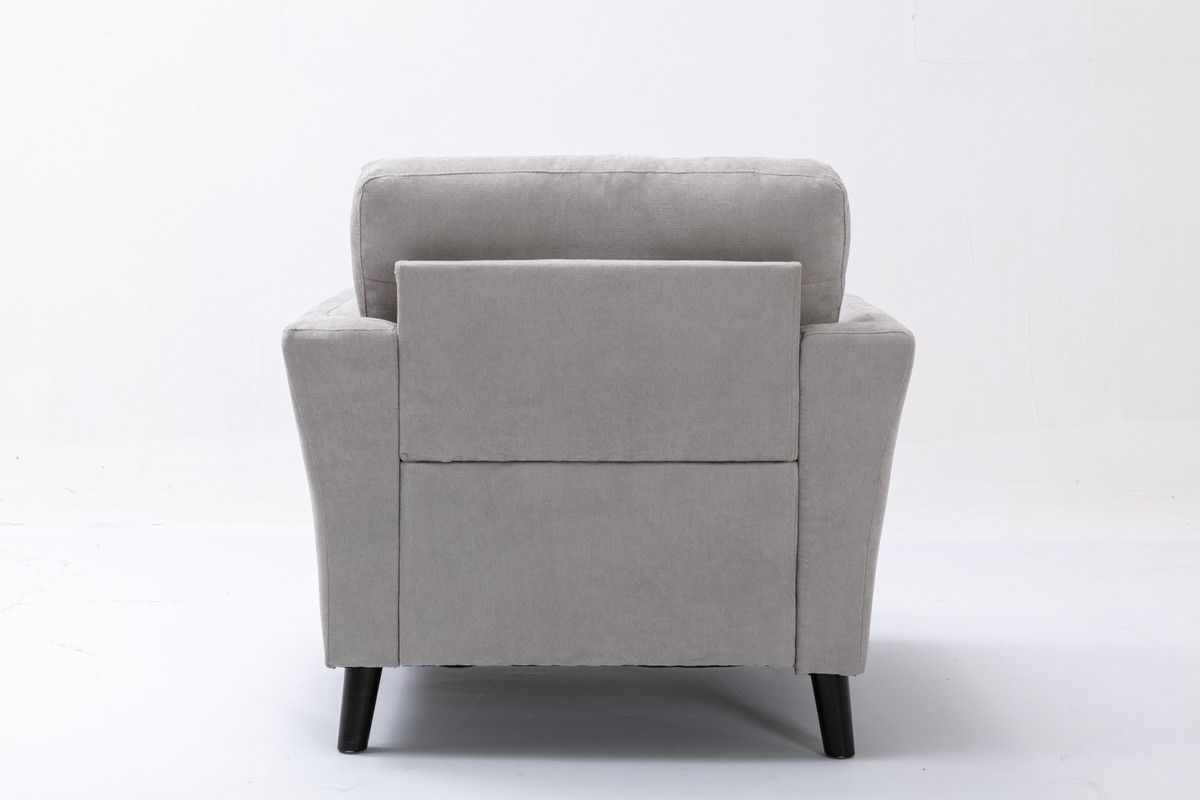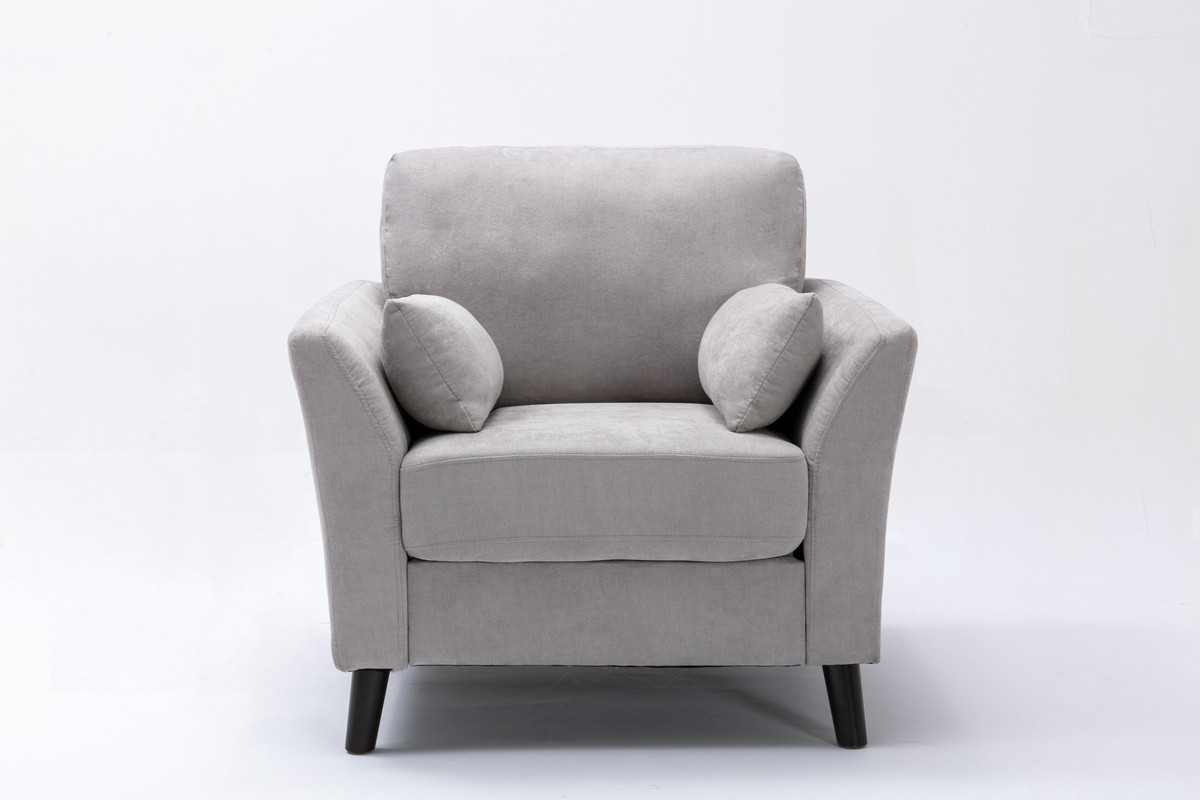 The Damian chair is a classic. It's simple design is guaranteed to stand the test of time. The smooth surface of the cushions amplify the sense of order and cleanliness of any room. The 2 accent pillows included are designed to keep guests comfortable according to their own needs. With dark brown solid wood legs as support, the Damian Collection is sure to fit the color palette of most rooms. Relaxing on comforting fabric has never been so easy. 2 Accent Pillows IncludedPocket Coil Seating23" Seat Width19.75" Seat Height21.5" Seat Depth20.5" Arm Height17" Seat Back Height5.25" Leg HeightDark Brown Solid Wood Leg