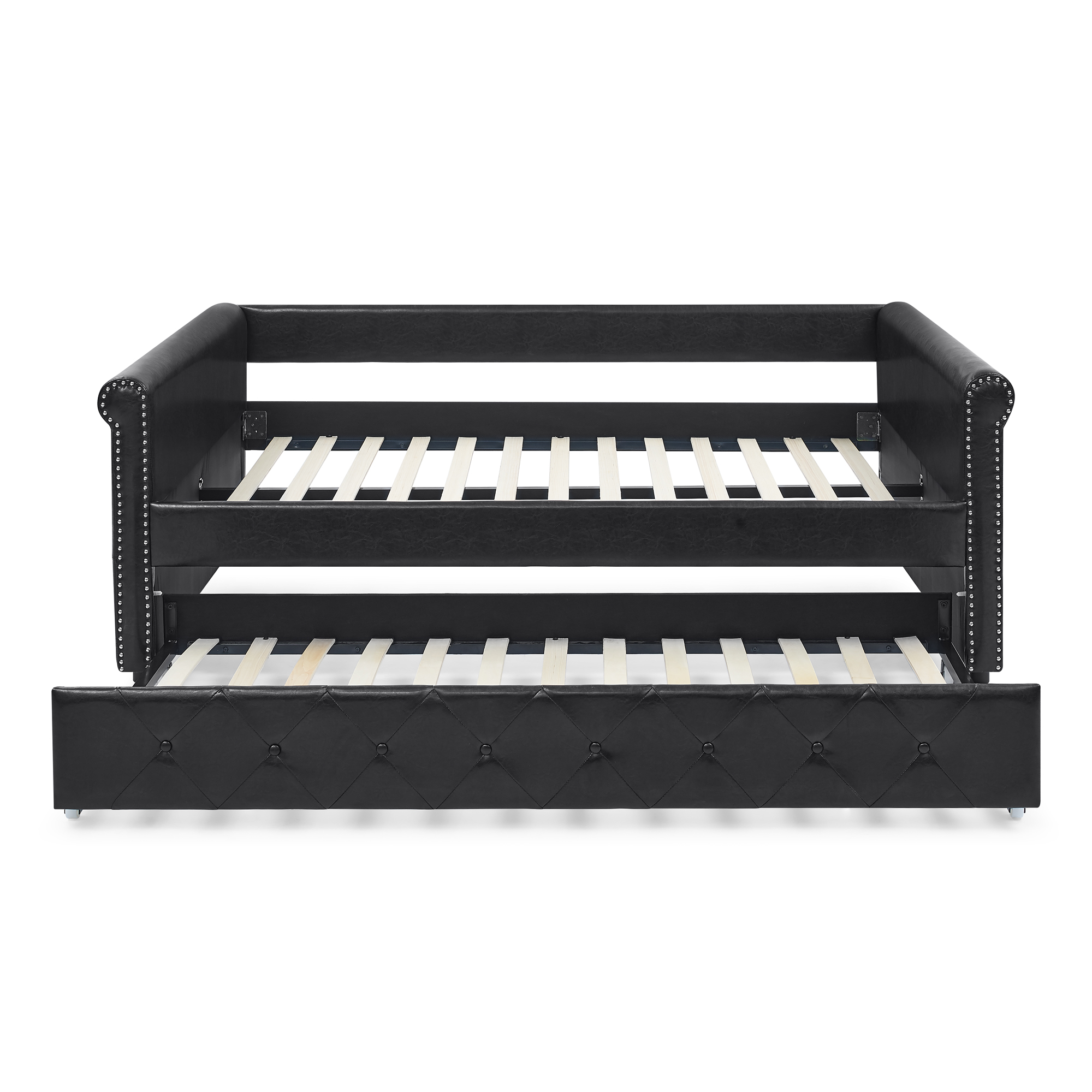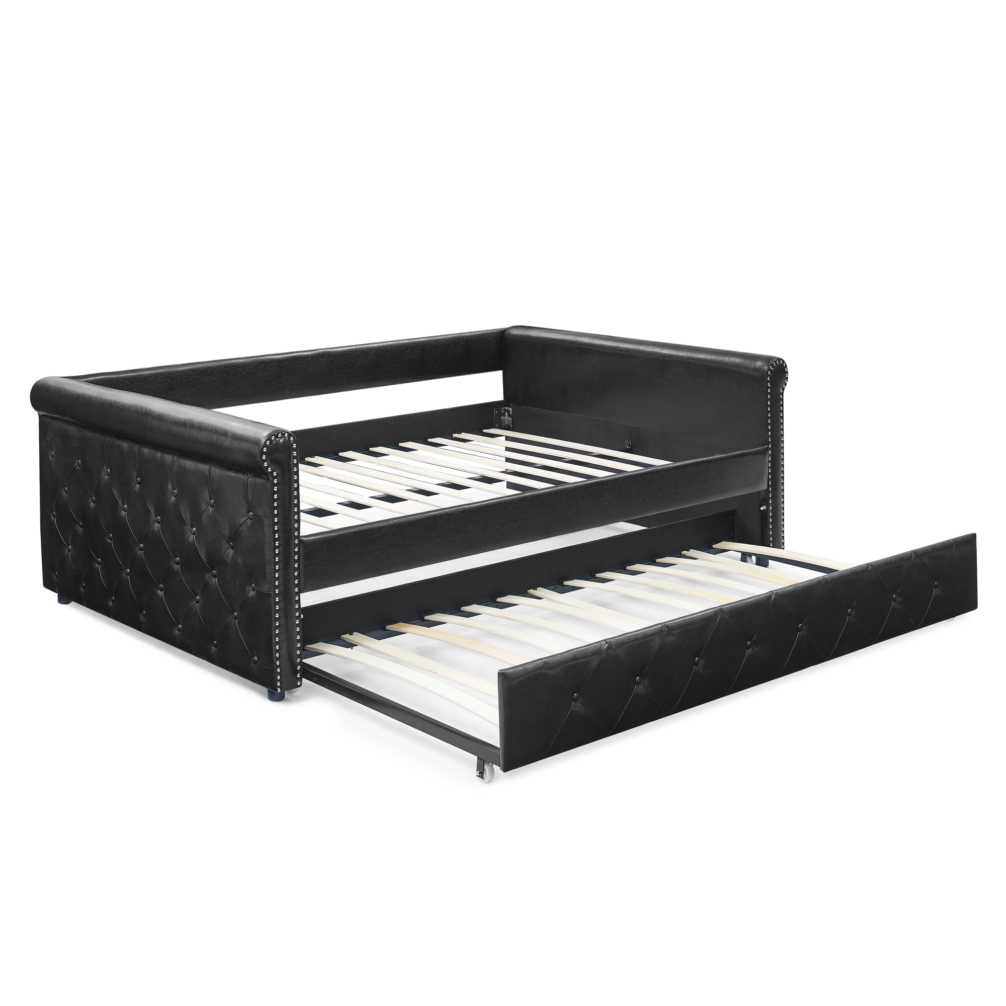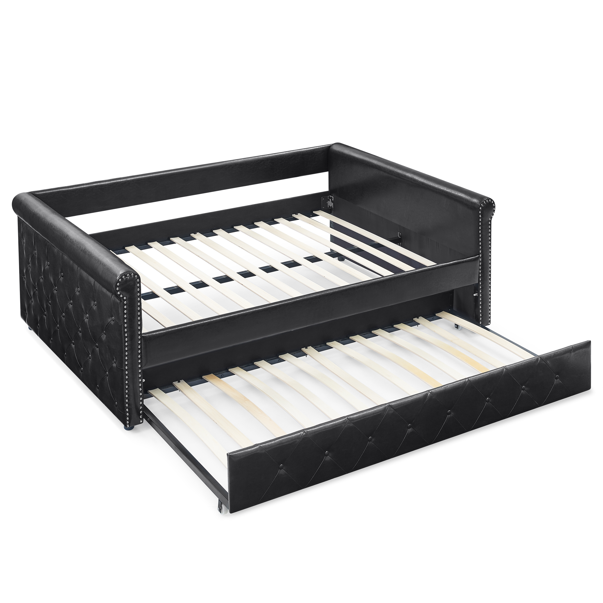 - Reinforced Frame. The frame of this daybed with trundle is crafted from a combination of eucalyptus wood and MDF board to effortlessly hold up to 500 lbs. It can fit two twin-sized mattresses, giving more space for guests. The trundle is equipped with smooth casters for easy pull-out.