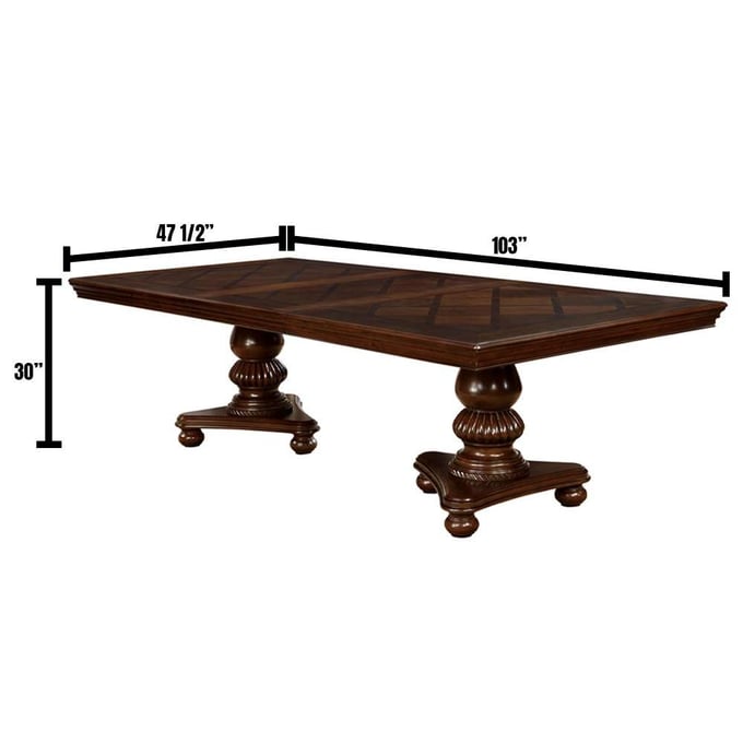 Summary | Shine up your silverware, bring out the glassware and get ready for the dinner party of the century with this glorious, traditional style dining table. The ornate double pedestal base provides the perfect structure for the crisscross patterned table top that, with its large 24-inch expandable leaf, can fit all the friends and family you can imagine. Paired with upholstered chairs featuring espresso leatherette, rope-like trim and elegant carved legs. |