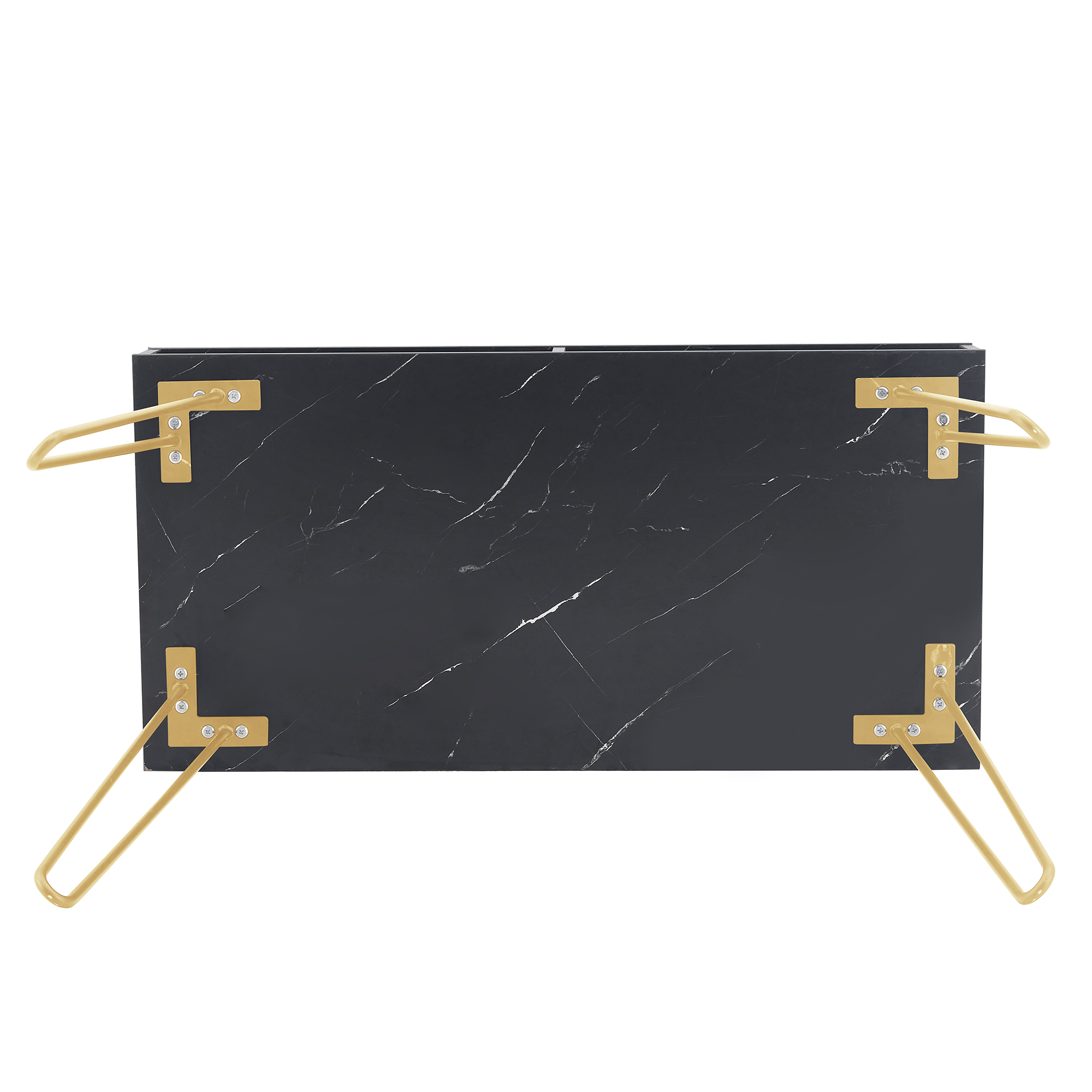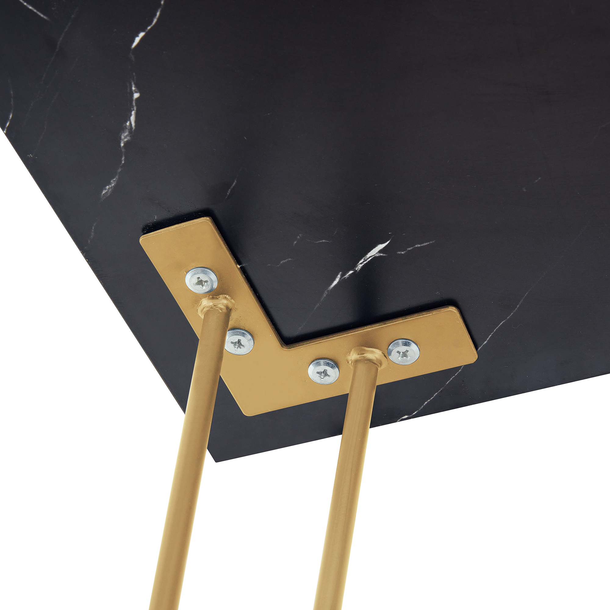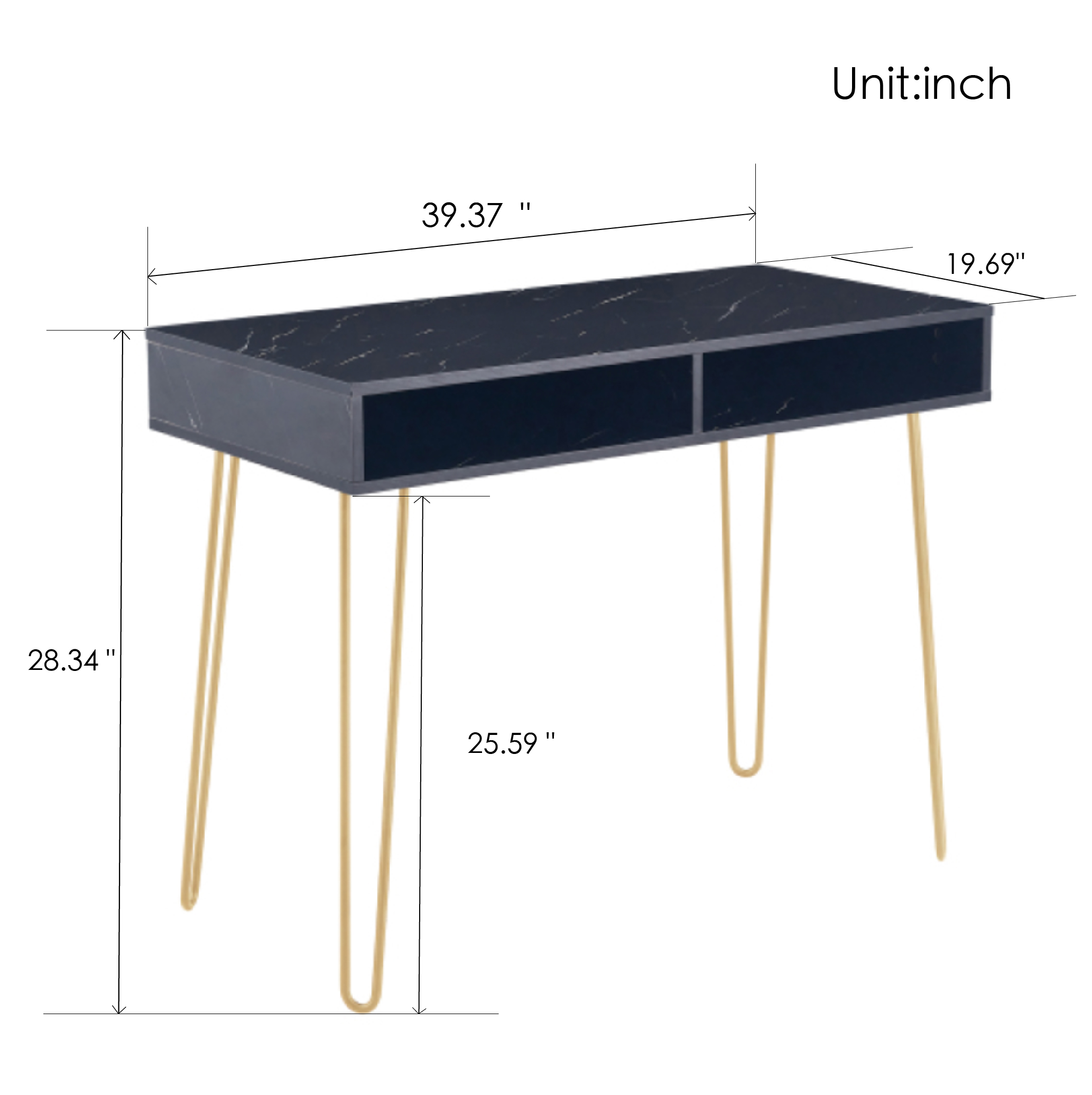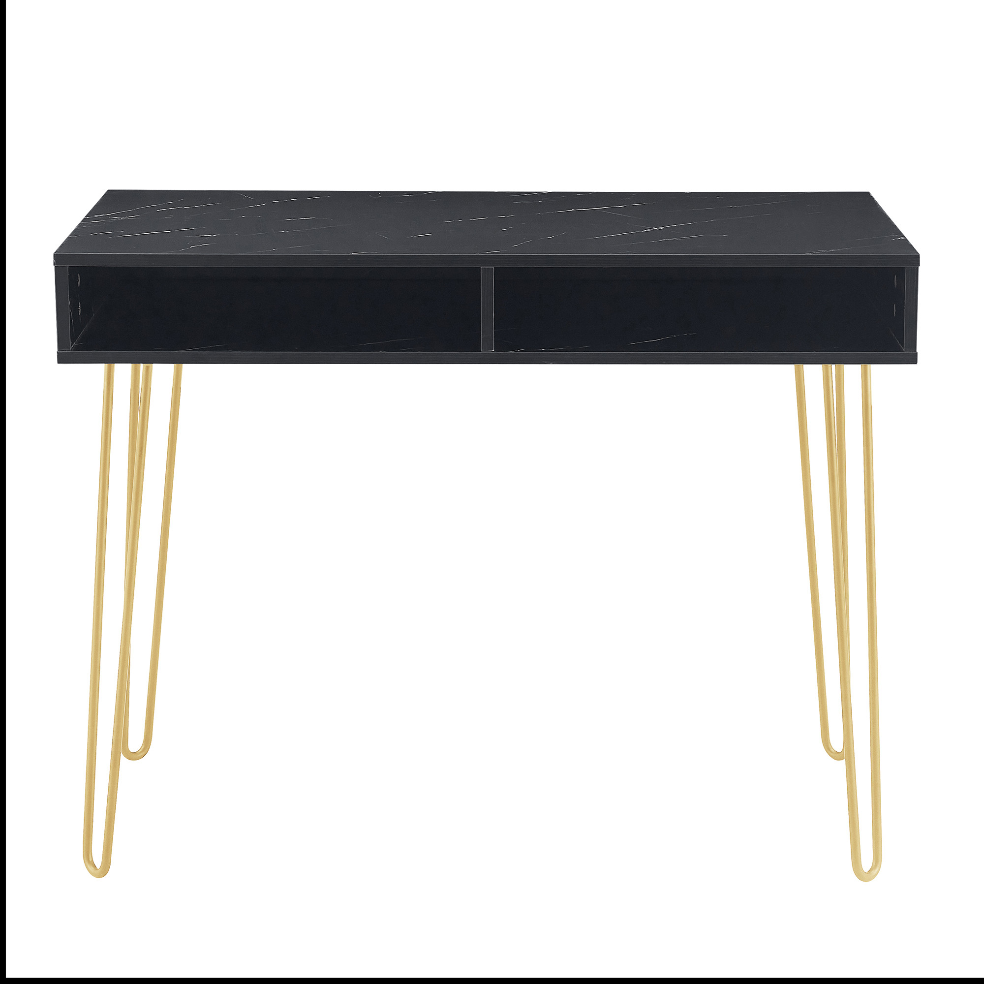 1. Made of MDF laminated particleboard with powder-coated metal legs, the faux black marble finish pairs with the gold hairpin legs for an easy to clean, updated look