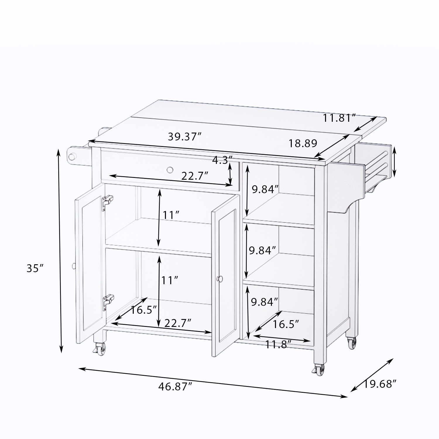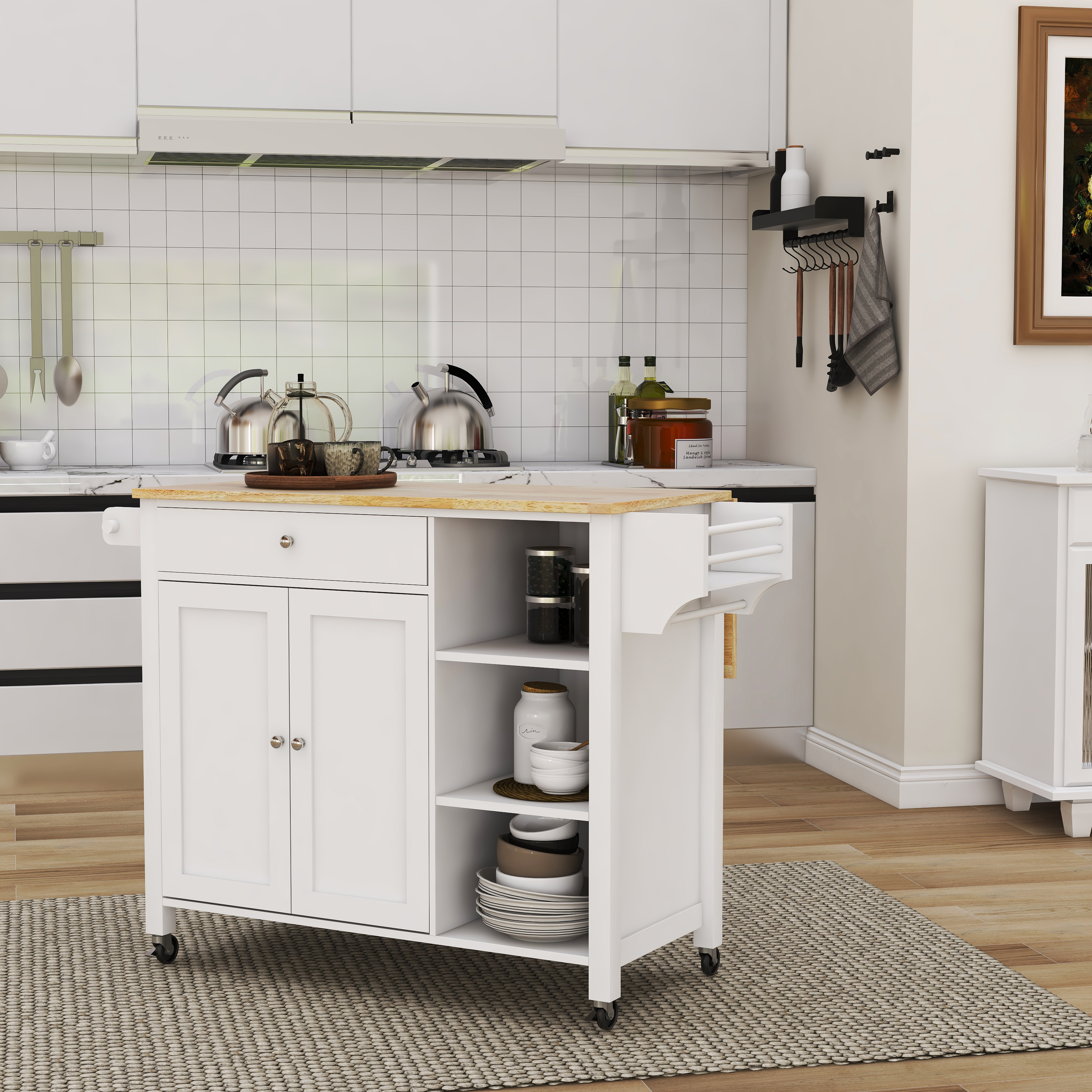 - Product name: Double Door Kitchen Island with Lockable Wheels, Towel Rack, Storage Drawer and Three Open Shelves-White