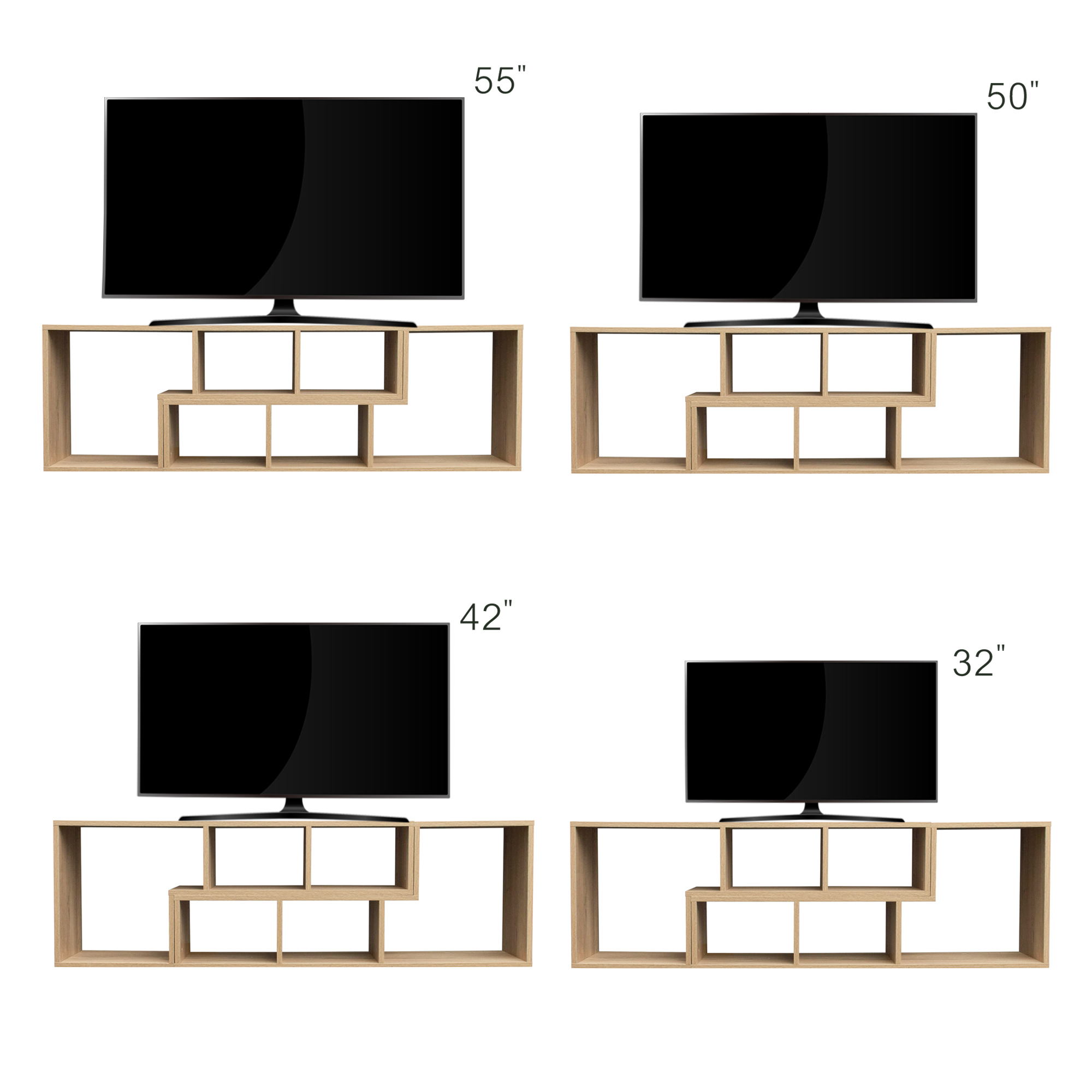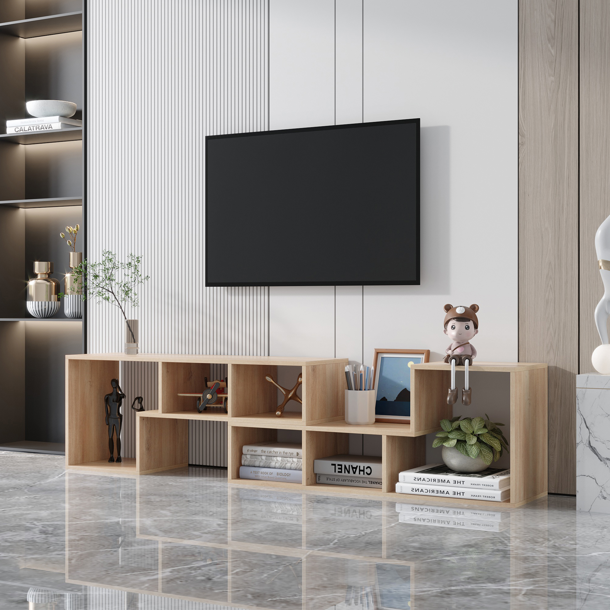 This double L-shaped stand can be placed anywhere in the home as a bookshelf, display stand, TV cabinet, etc. Be creative and choose the best configuration for this stylish and functional cabinet!