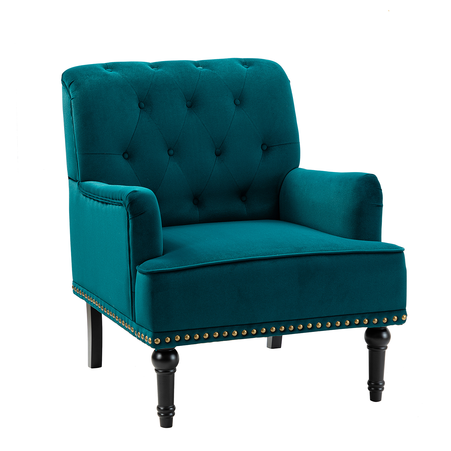 Looking to add an arm chair to your living room or bedroom? This one is in keeping with your glam sensibilities, adding an eye-catching touch to your space. Designed in classic and contemporary style with glam nailhead trim and button-dotting backrest, this accent chair is full of aesthetics, looked attractive in vision. Founded atop four elaborately carved rubberwood legs and wrapped with premium velvet fabric, comfortable for skin touch, it also arrives with a s-spring built-in seatrest for perfect support, ensuring a long term seating. Medium-density foam filled brings cosy experience while a solid and manufactured wood frame provides sturdy structure. This timeless fashion piece will not fail to blend with your home decor with its rich color selections. At any time, this chair provides an essential spot for sitting and enjoying a good book or catching up on your favorite show, effectively reliving the pressure. It's the perfect pick for the living room, office room and bedroom.