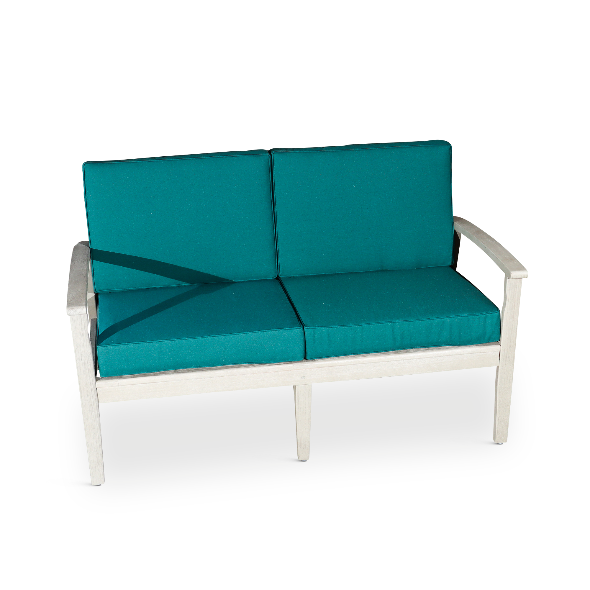 Eucalyptus Loveseat with Cushions, Driftwood Gray Finish, Dark Green Cushions
