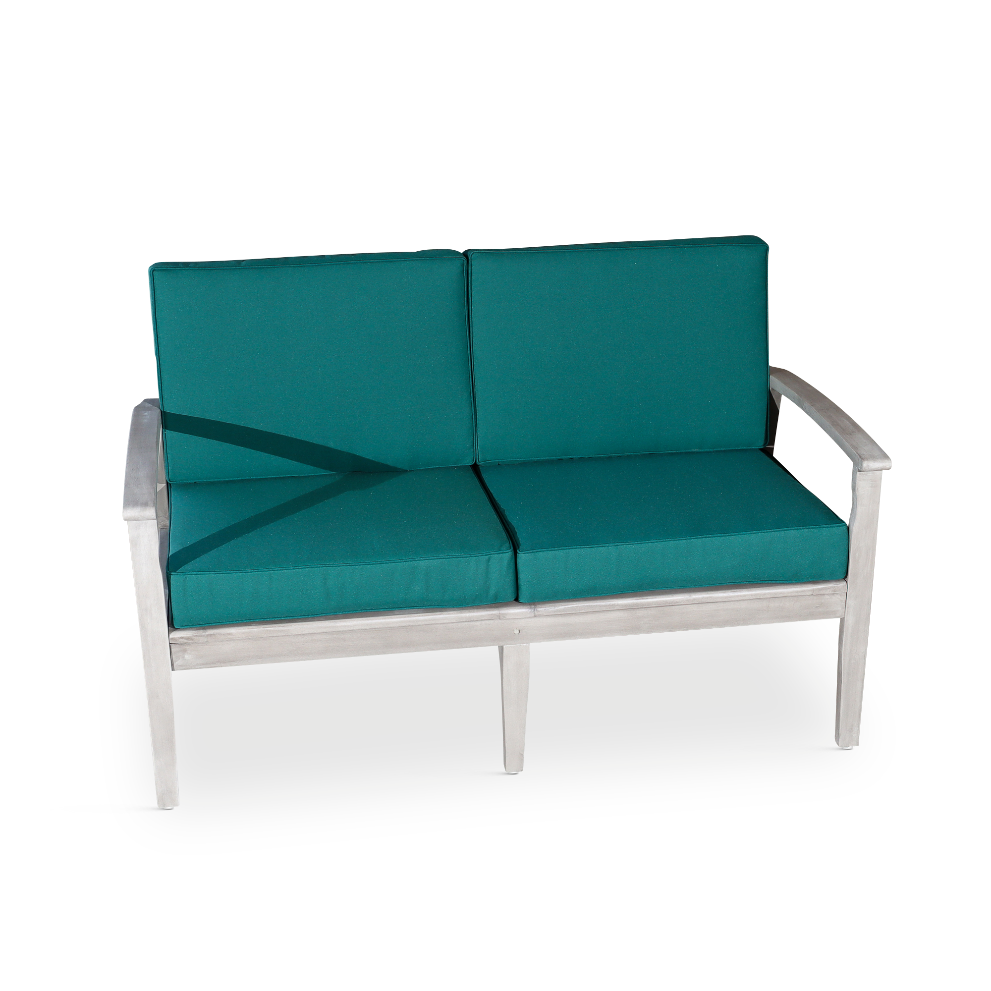 Eucalyptus Loveseat with Cushions, Silver Gray Finish, Dark Green Cushions