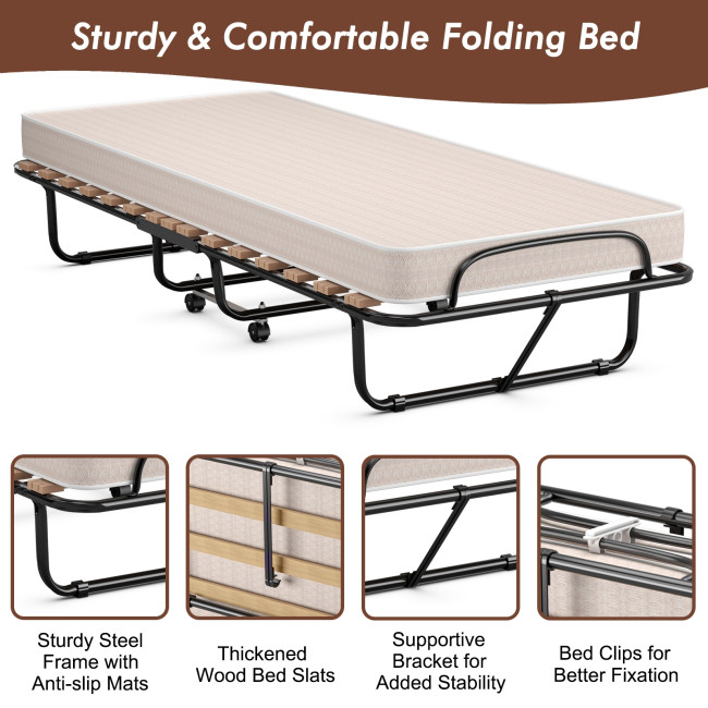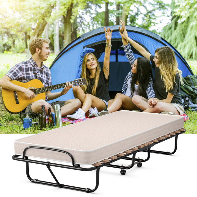 It is constructed by reinforced steel frame with exquisite coating for high stability and better durability. Designed with 4 all-directional wheels, this folding bed is easy to move to any place. What's more, you can fold it when you are not using it. It can be stored in limited places, such as corner, bedroom and more. Enjoy this comfortable bed with your friends and your family!