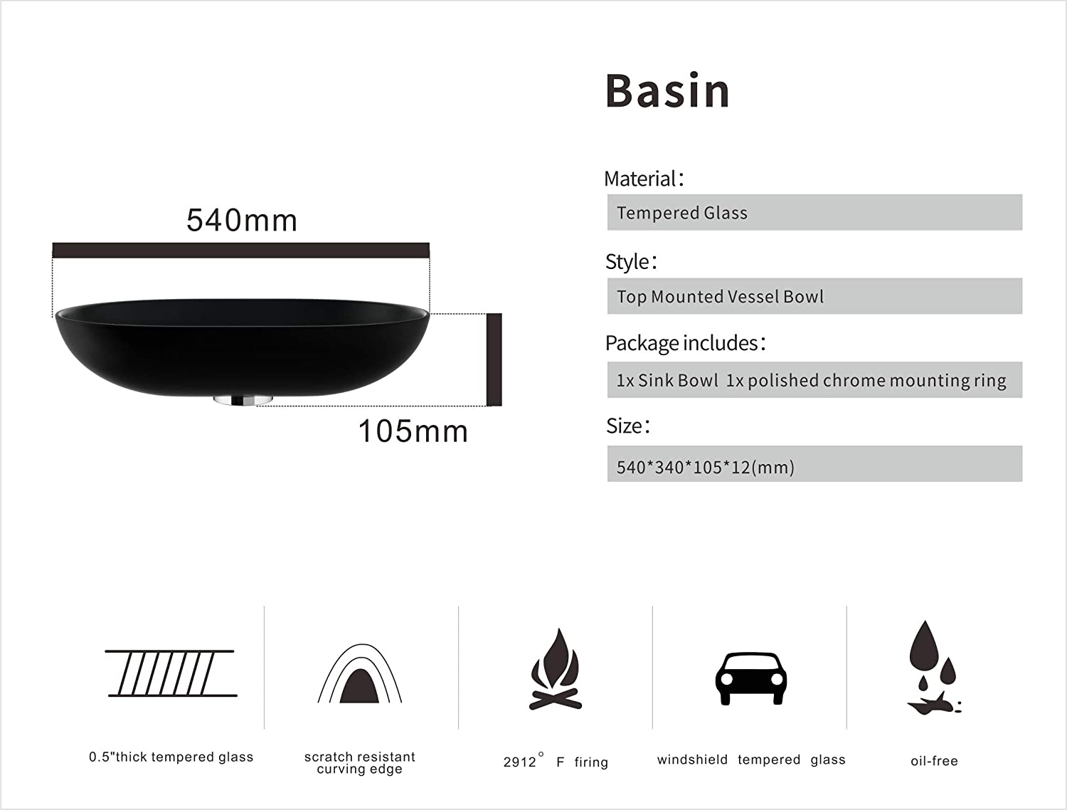 [Glass Vessel Dimensions]: 22" L x 13.5"W x 4" H x 1/2" thick. Standard 1 3/4" drain opening [Package Included]: 1 x Glass Vessel Sink, 1 x Mounting Ring