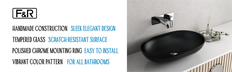 FR Glass Vessel Bathroom Sink Modern Tempered Glass Vessel Bowl Sink, Bathroom Sink Tempered Black Glass Vessel, Top Mount Bathroom Sinks Above Counter