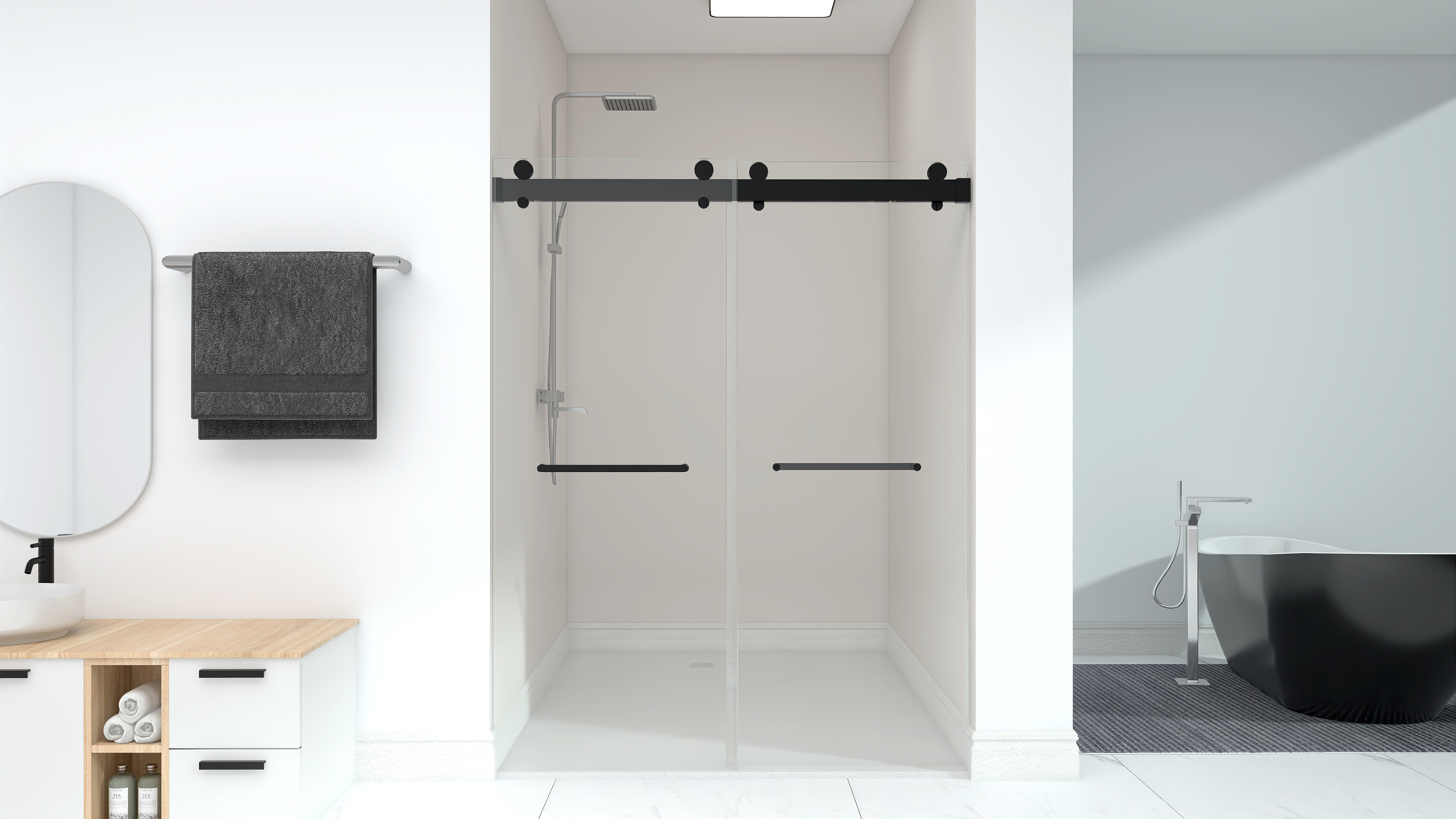 Frameless Double Sliding Shower, 57" - 60" Width, 79" Height, 3/8" (10 mm) Clear Tempered Glass, , Designed for Smooth Door Closing With Upgraded Crashproof System Technology Matte Black Finish