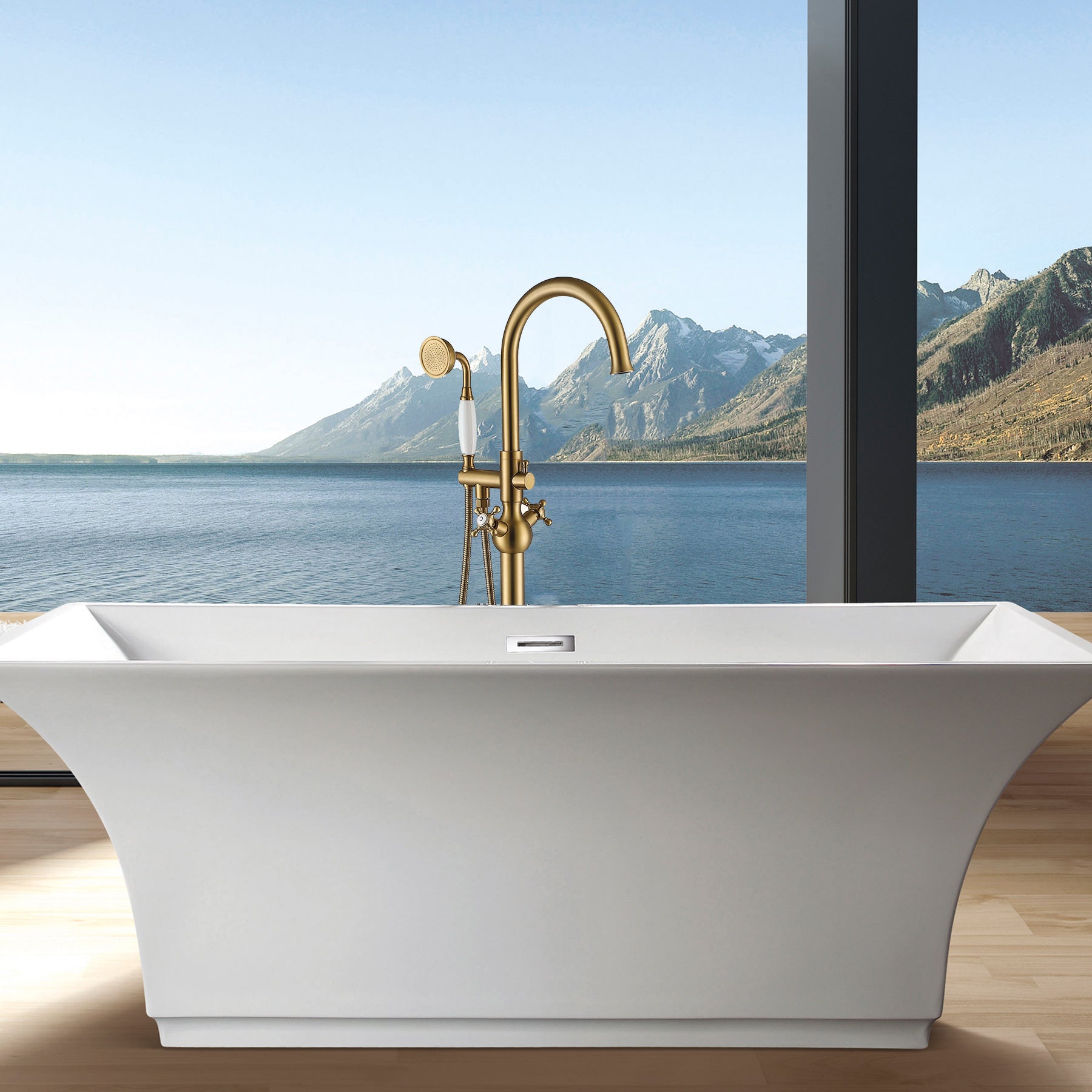 • This freestyle bathtub faucet is made of brass.It includes a shower hose and hand shower with a advanced valves.This modern stand-alone bathtub faucet adjusts the water temperature to avoid sudden hot and cold shocks