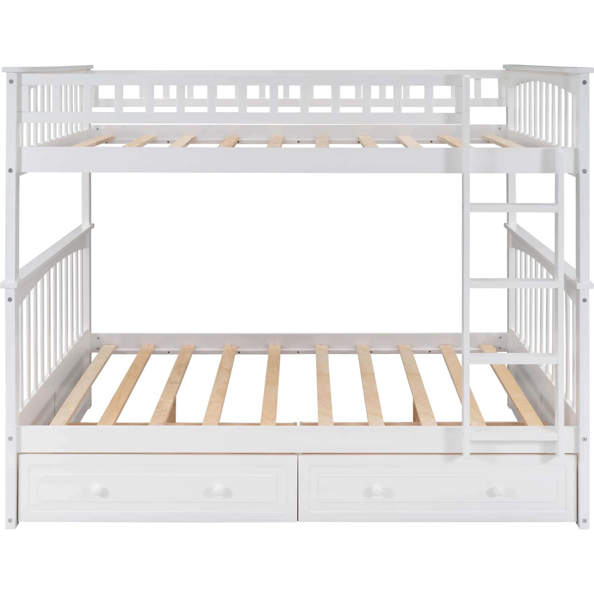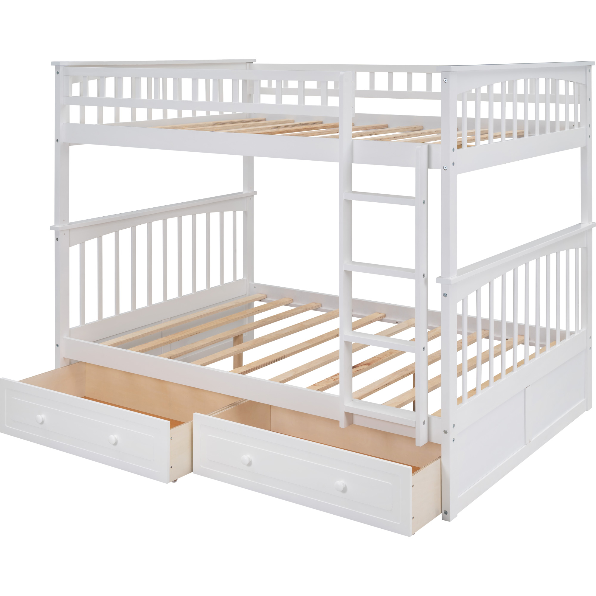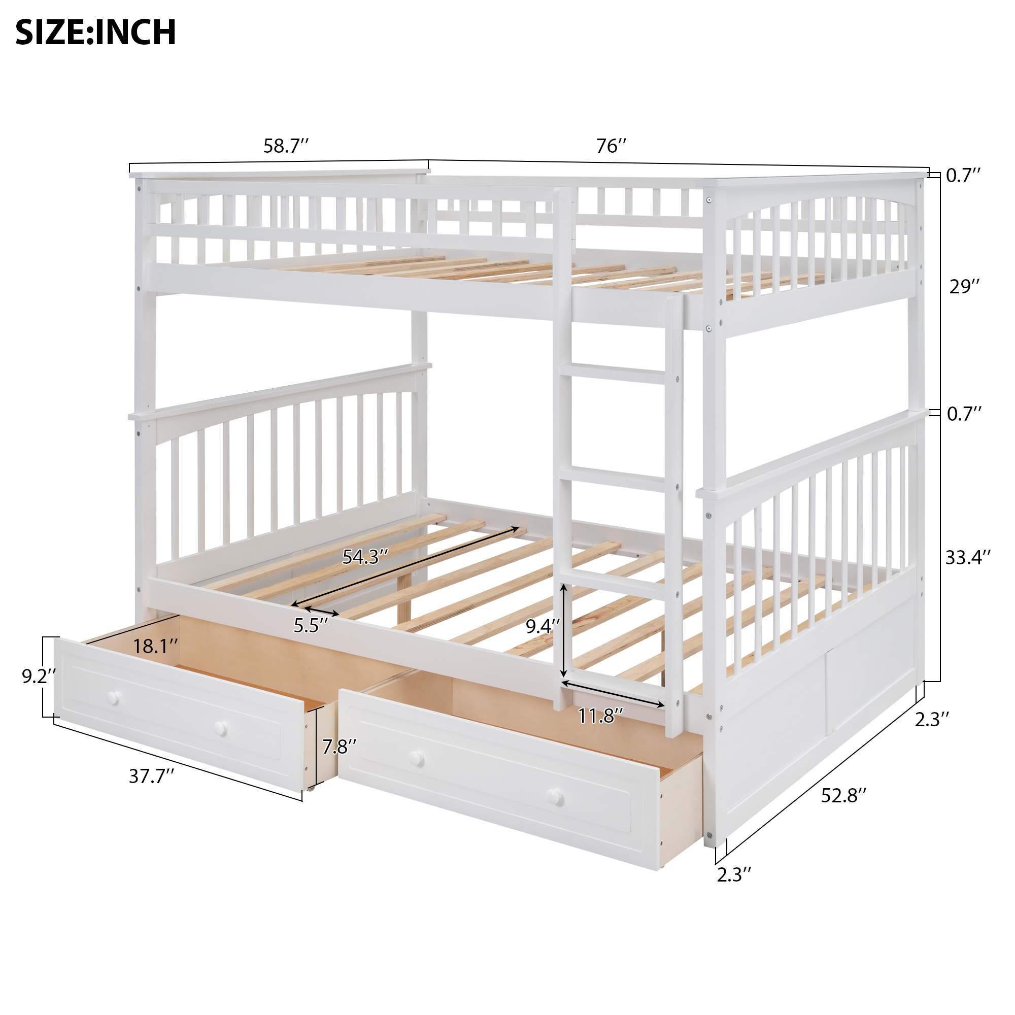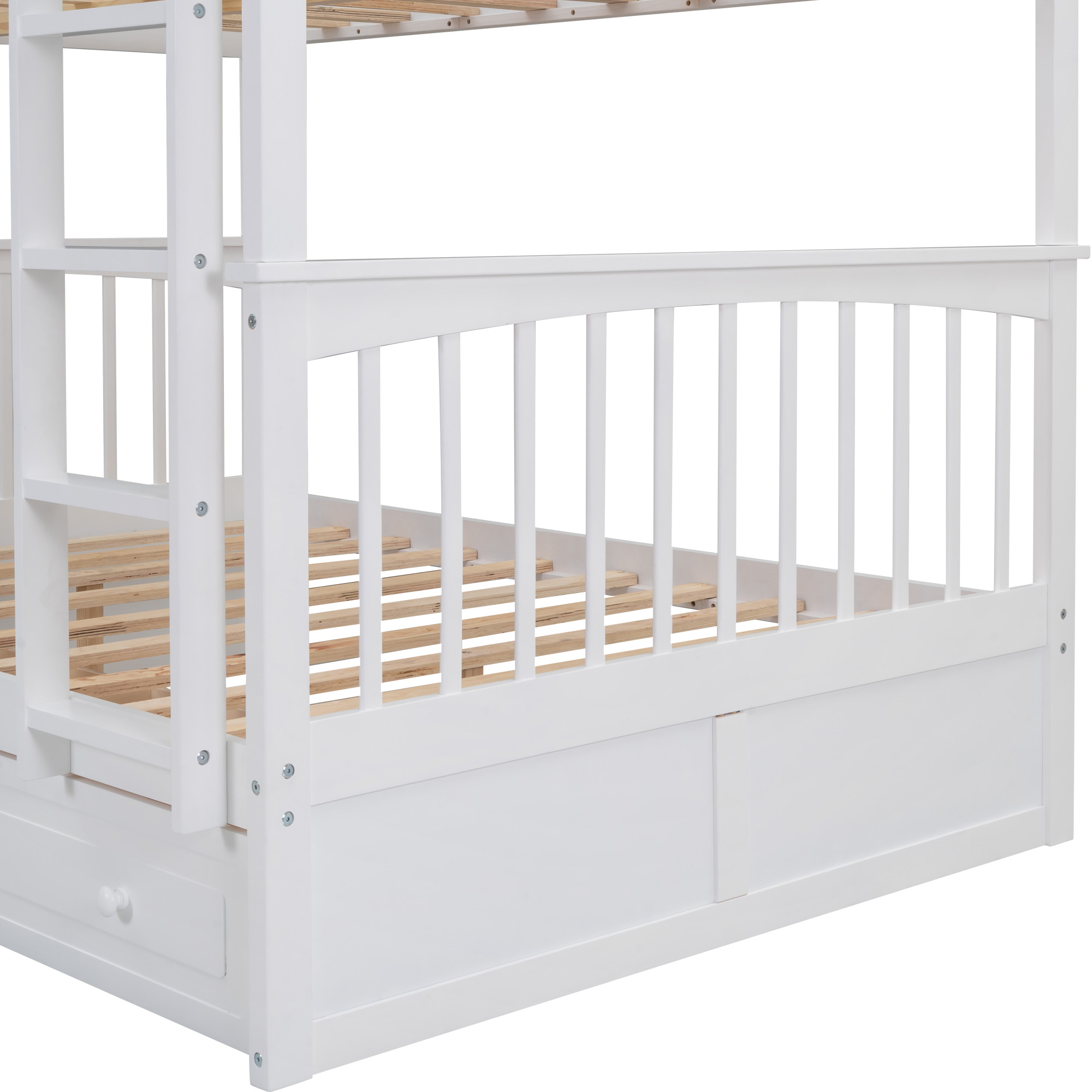 This multifunctional bunk bed can meet your various needs. Coming with two drawers, this bed provides great storage function. Drawers are equipped with wheels and handles which make the drawers easy to roll in and roll out. The bed can also be converted to two separated beds, one with two drawers, one with spacious under-bed space. Made of solid pine wood and high-quality MDF, this bed can definitely withstand the test of time. With elegant appearance and multiple function, this bed will be the perfect addition to your bed.