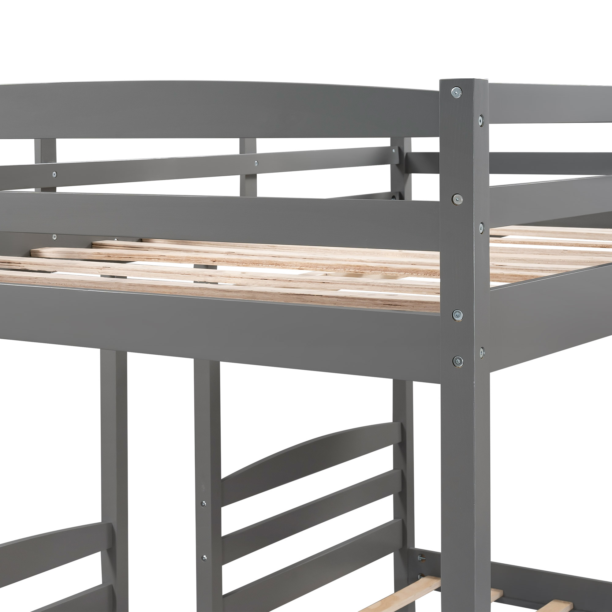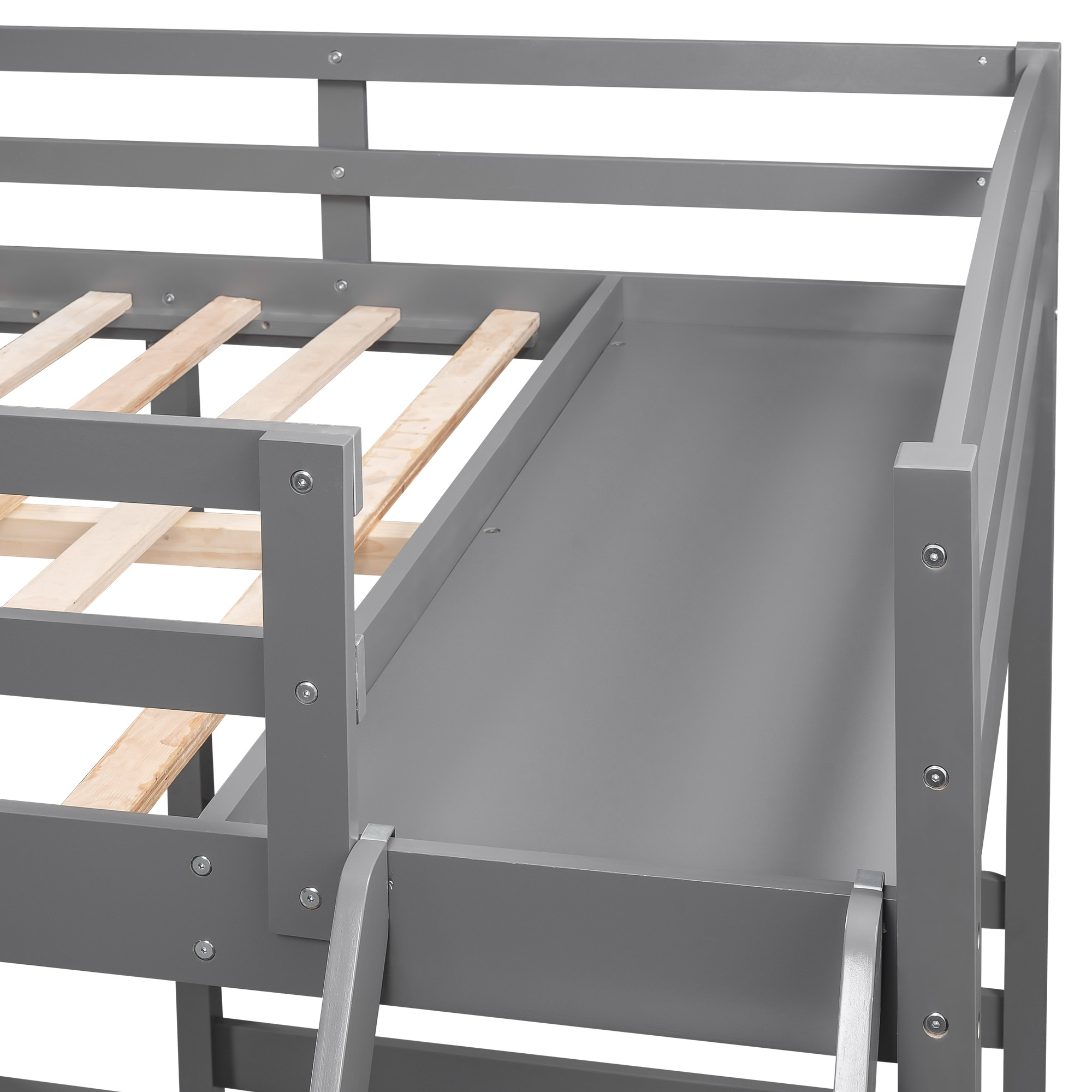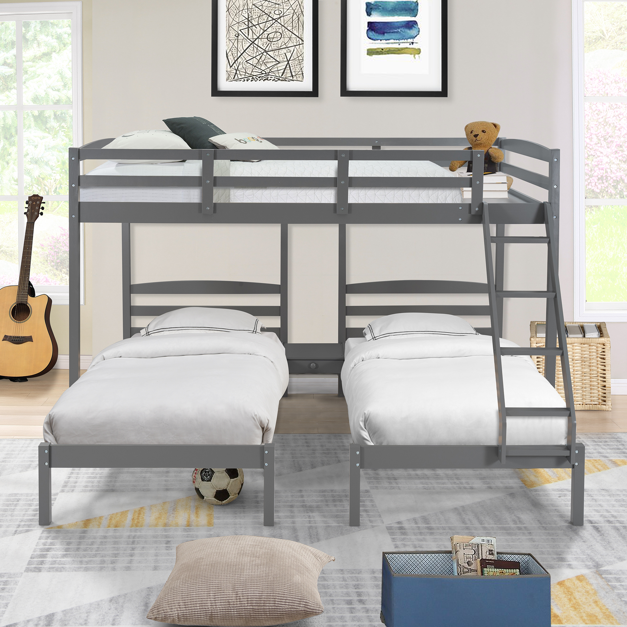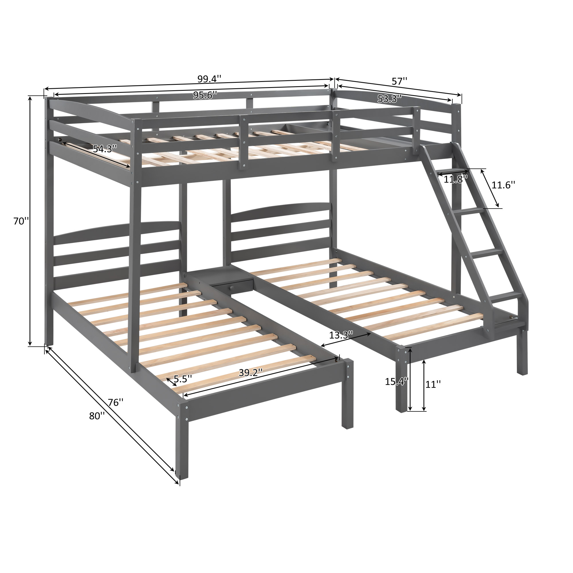 This bunk bed features three beds in one, truly a space-saver. With a full size bed on top and two twin size beds underneath, this bed is ideal for accommodating guests and sleepovers, and also perfect for family with multiple members. The drawer between beds is available for storage and the down bed is 11” off the floor, so there’s spacious space under the down beds, you can use it to store your stuff. The top bed is equipped with full-length guardrail, keeping user’s safe from falling. Coming with great quality and multiple function, this bed will be the best addition to your bedroom.