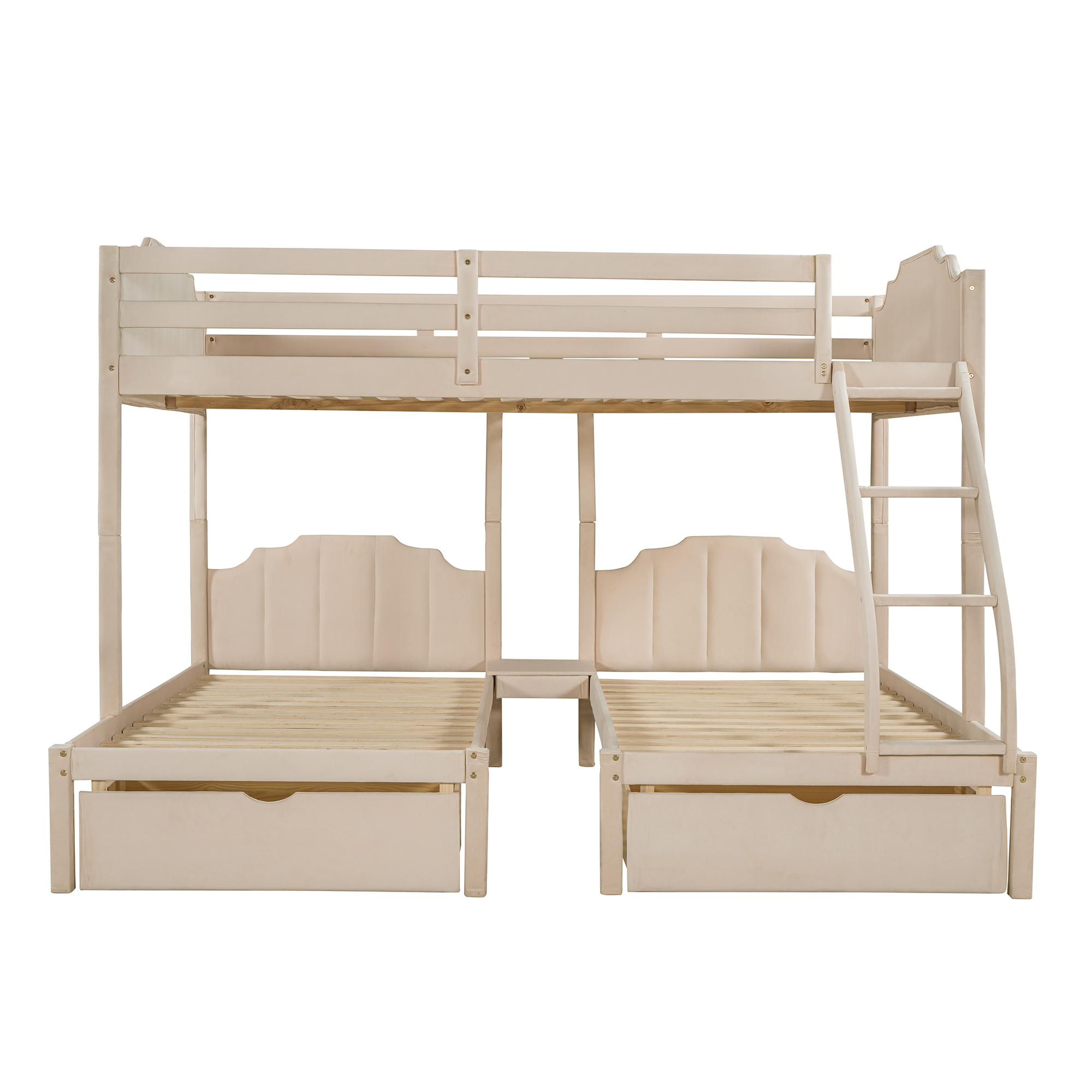v [Multi-functional] This triple bed can be divided into three separate beds to meet your different needs. The shelf beside the upper full bed and the table with drawer between the two lower beds provide place for you to put some daily supplies within easy reach, and the two pull-out drawers under the lower beds save a space for you to store some clothes and toys.