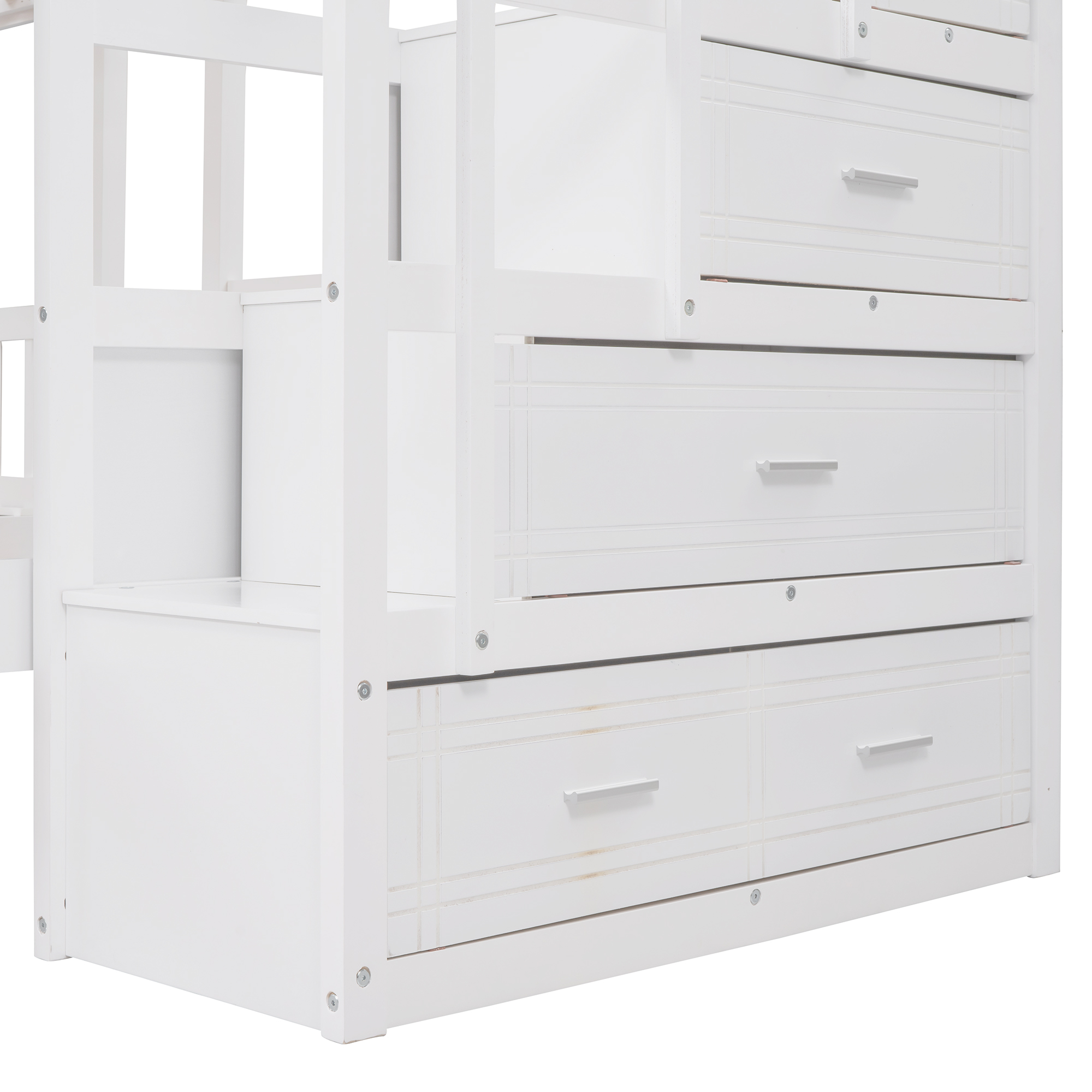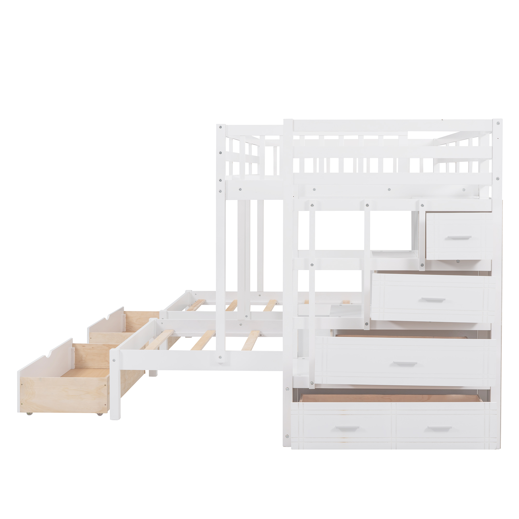 v [Bunk Bed with Storage Drawers ] Multifunctional staircase instead of ladder. Easy access to the upper bed, safe and sturdy climbing . 4 storage drawers for your storage, super organized bunk bed to families’ ultimate demands.The side steps can be interchanged left and right to meet different layout requirements.