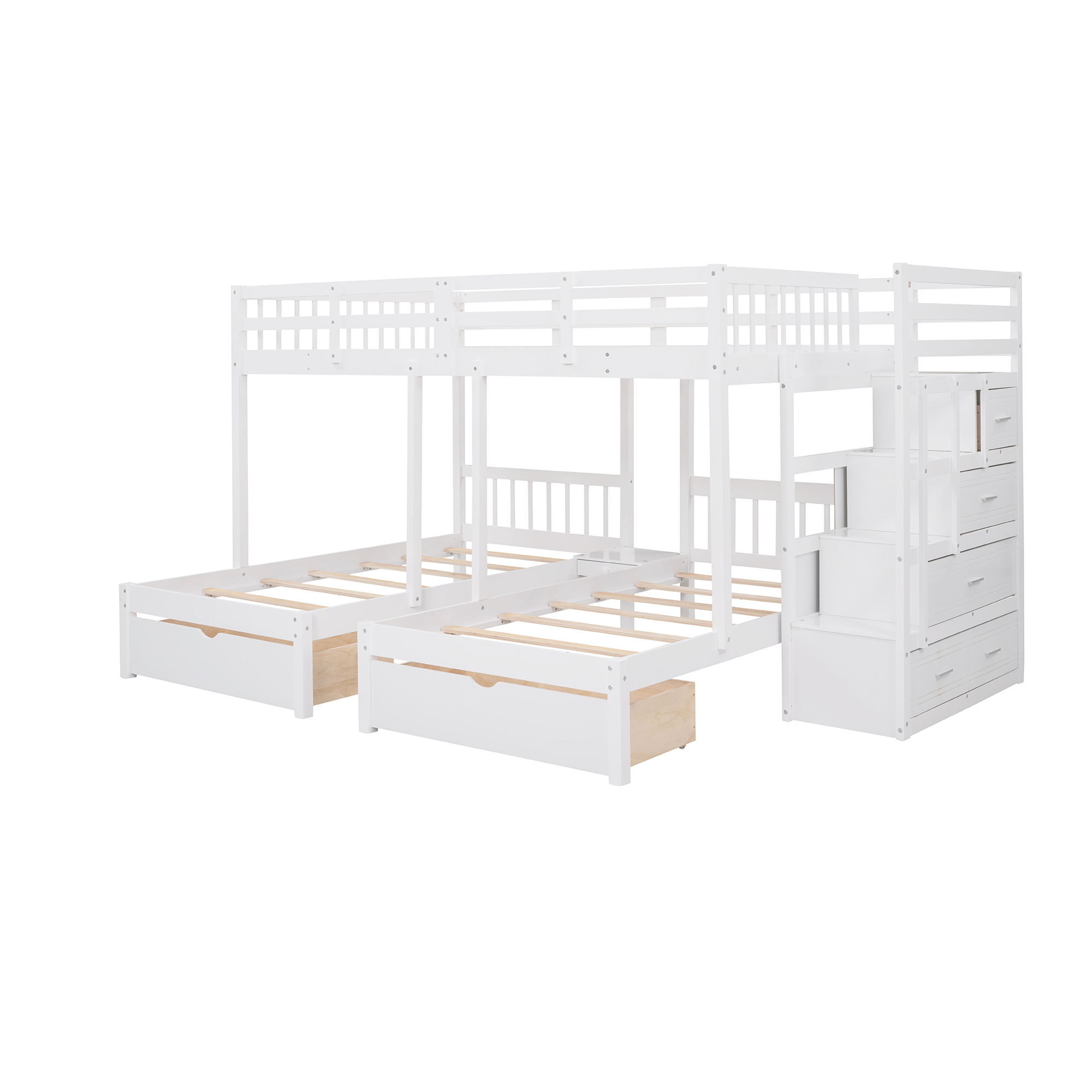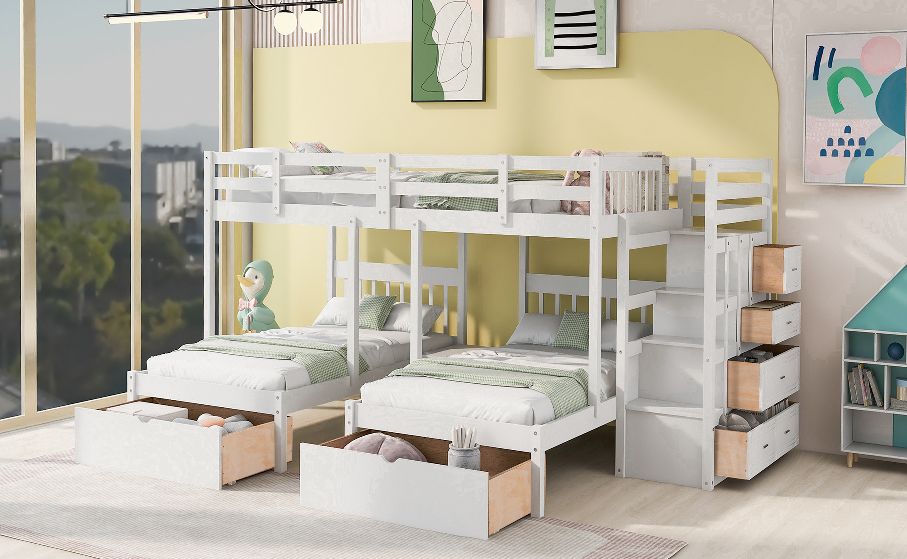 A perfect space-saving solution for multi-child families. A full size bed combined with two twin size beds, this triple bunk bed provides a convenient and flexible arrangement option for large families and sleepovers by taking advantage of vertical space. Crafted with pine wood and plywood, this triple bunk bed is sturdy and durable to withstand the test of time. The stair allows you to easily and safely access the upper bed. Sturdy guardrails protect you as you sleep through the night. Ample storage space is provided by the two large drawers under lower beds. Coming with great quality and multiple function, this bed will be the best addition to your bedroom.