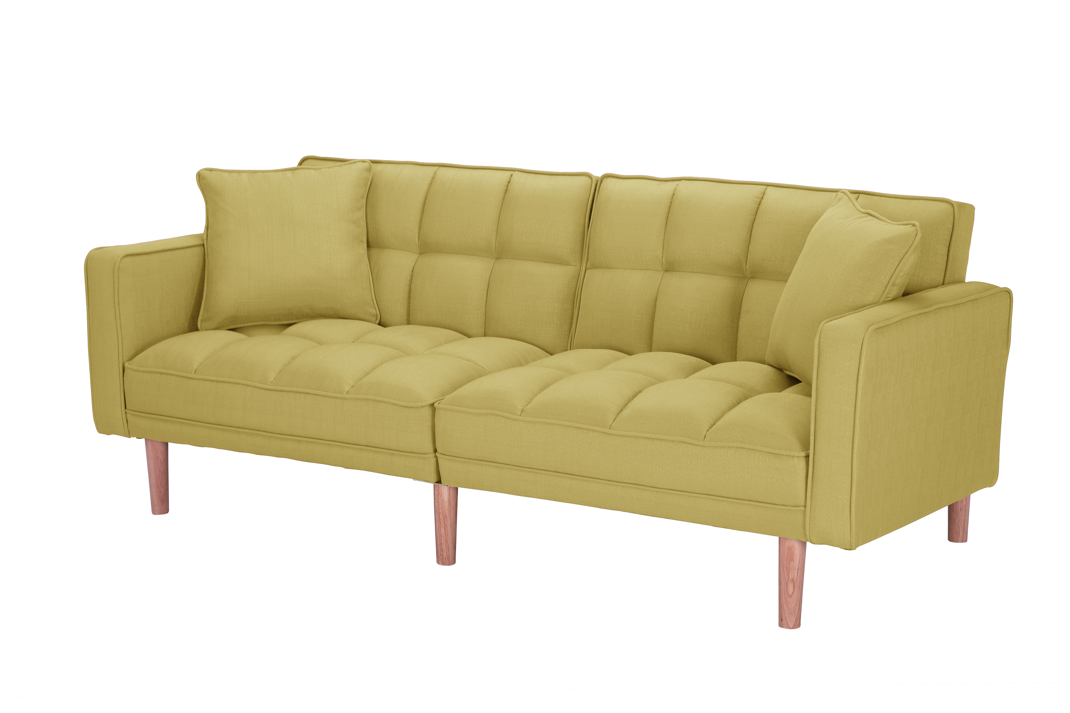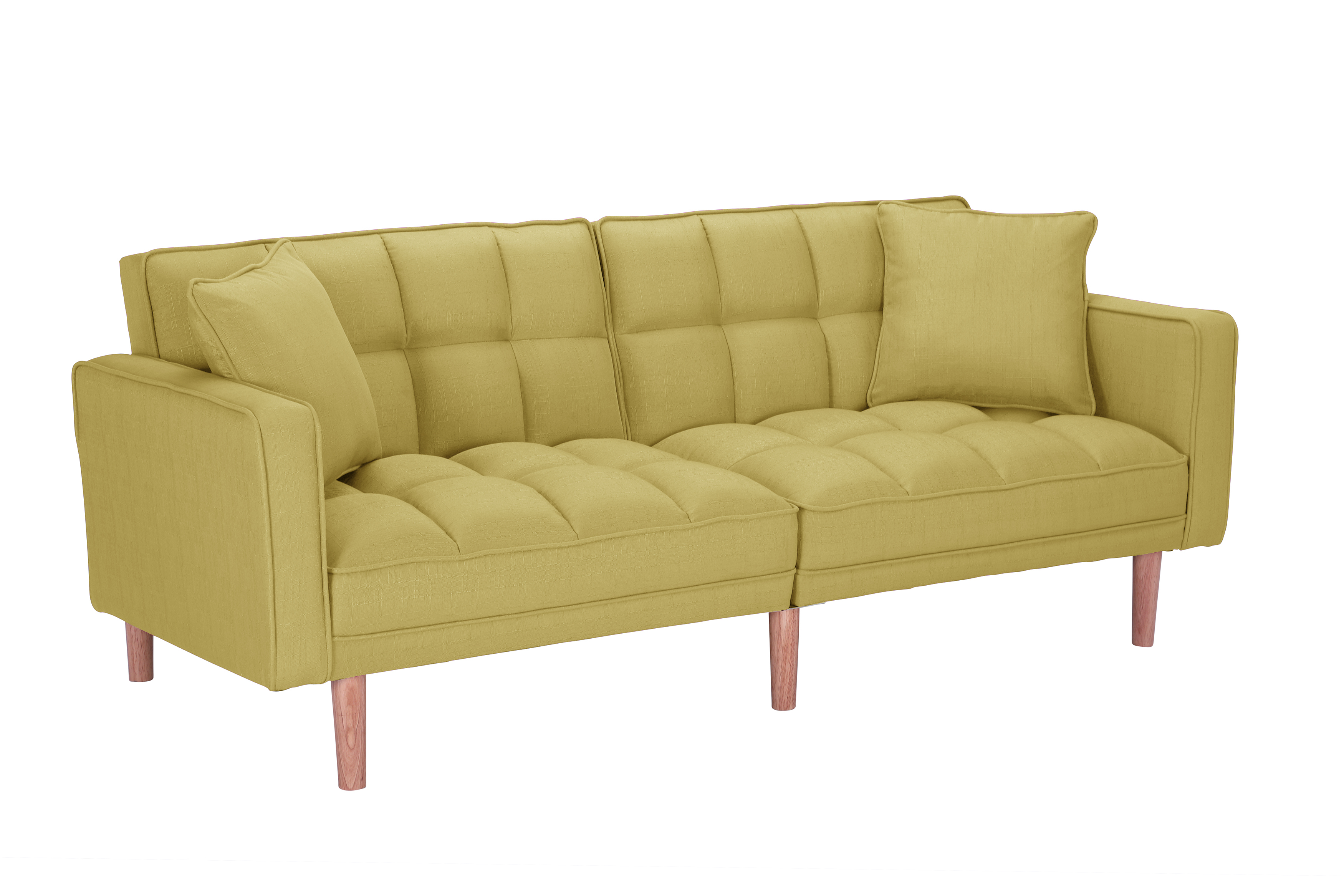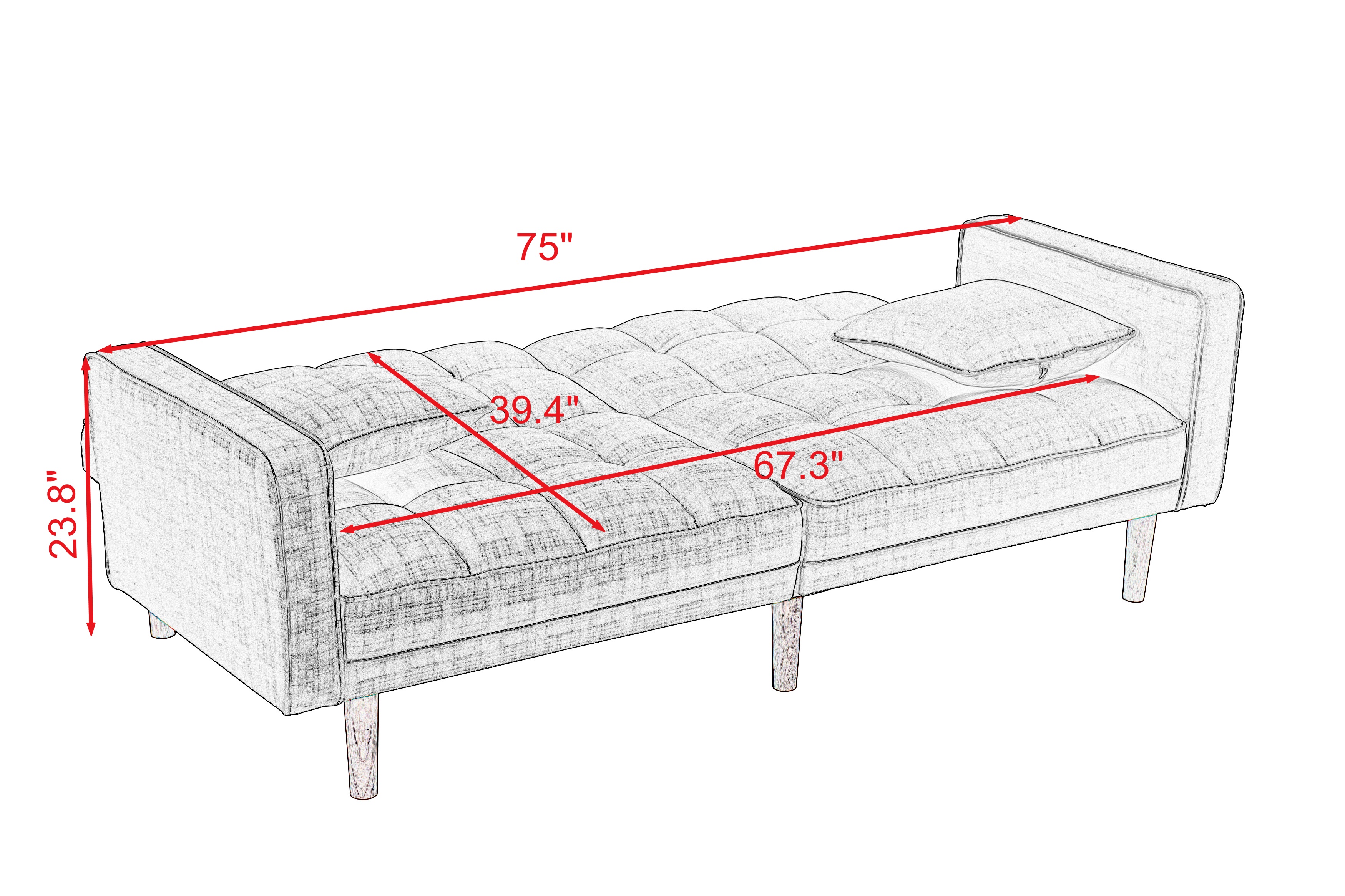 Perfect for unexpected overnight guests, or just a handy spot for a nap, futons are a great option for adding a touch of seating that can easily be transformed into sleeping space whenever needed. Featuring a split back, track arms, and tapered legs, this sofa showcases a clean-lined silhouette perfect for adding a modern touch to any living ensemble. All colour choices are upholstered in 100% polyester linen-look fabric and rounded out with a chevron-stitched pattern. The back of this piece folds down to create a bed. The split-back design of this convertible sofa is made to offer each guest their own level of comfort, from sitting up to lounging back. You can even lay flat both the seat and back cushions to create a comfortable place for overnight guests to sleep.