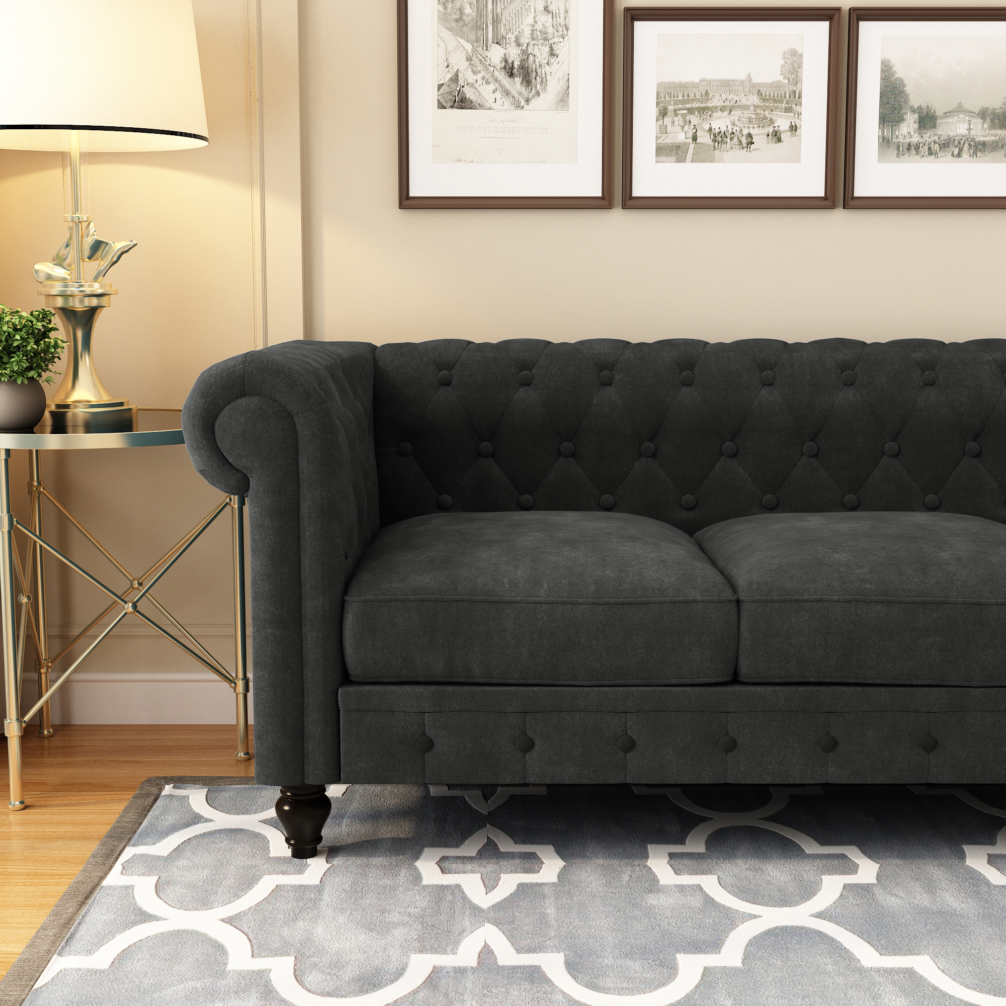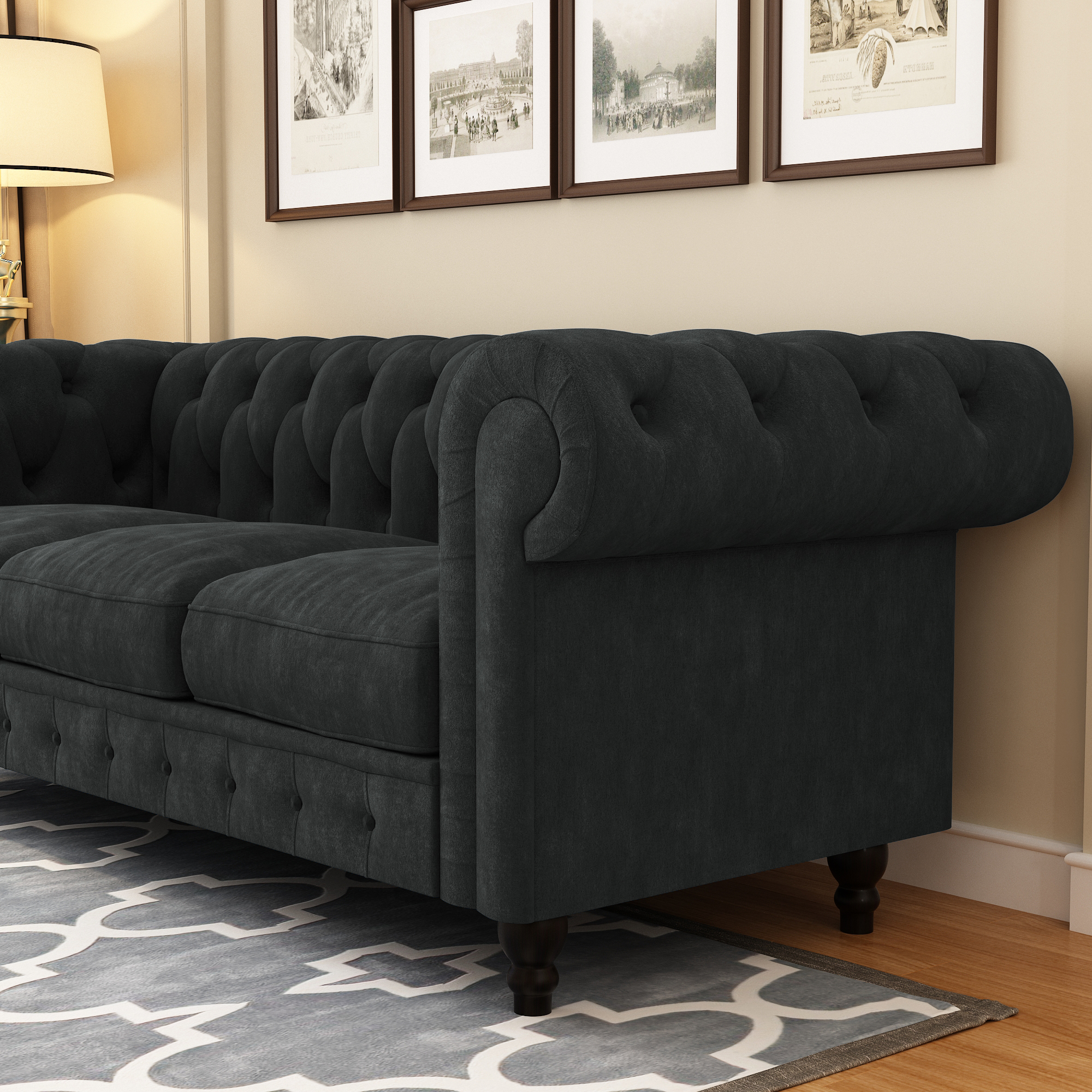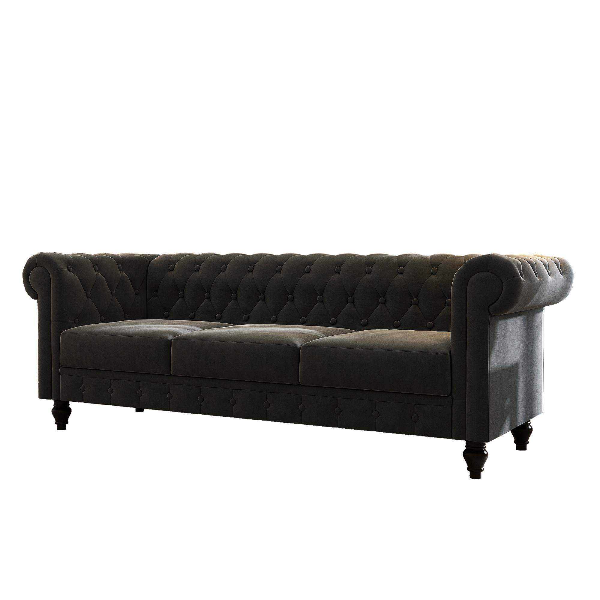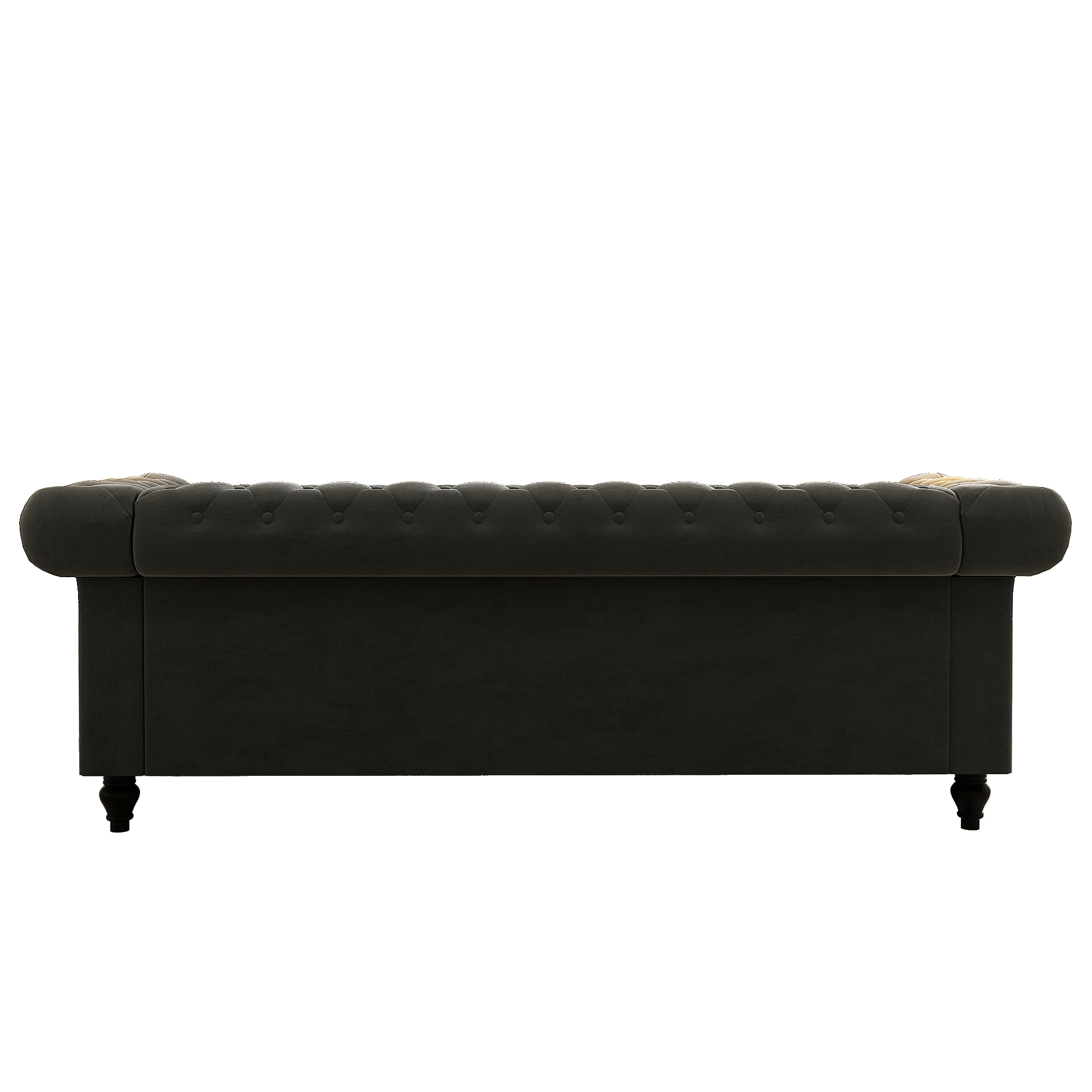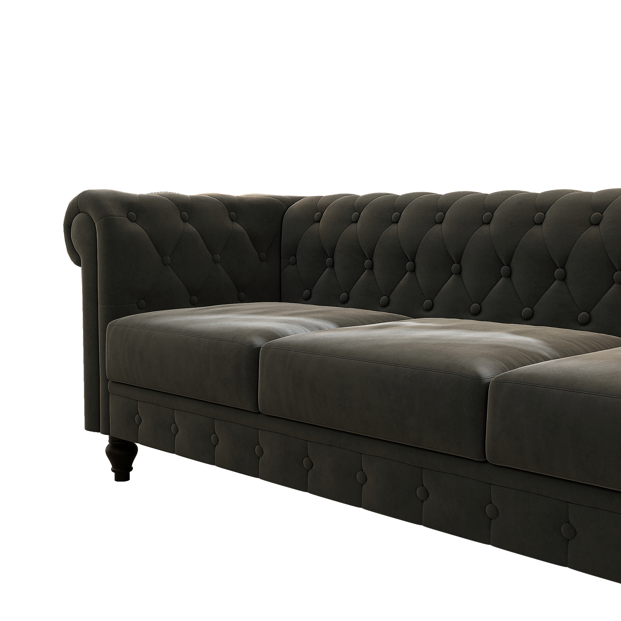 Bring home a timeless addition for your living room with our lasting chesterfield style sofa. This lovely sofa is the ideal addition to any living room with its classic design and traditional elements such as deep button tufting, and nailhead accents. Featuring a low backrest and plush upholstery, this sofa stands as a streamlined statement piece that can change the whole flow of your living room, creating an open, clean space. Finished with beautifully turned legs, our sofa provides an elegant touch to any room.