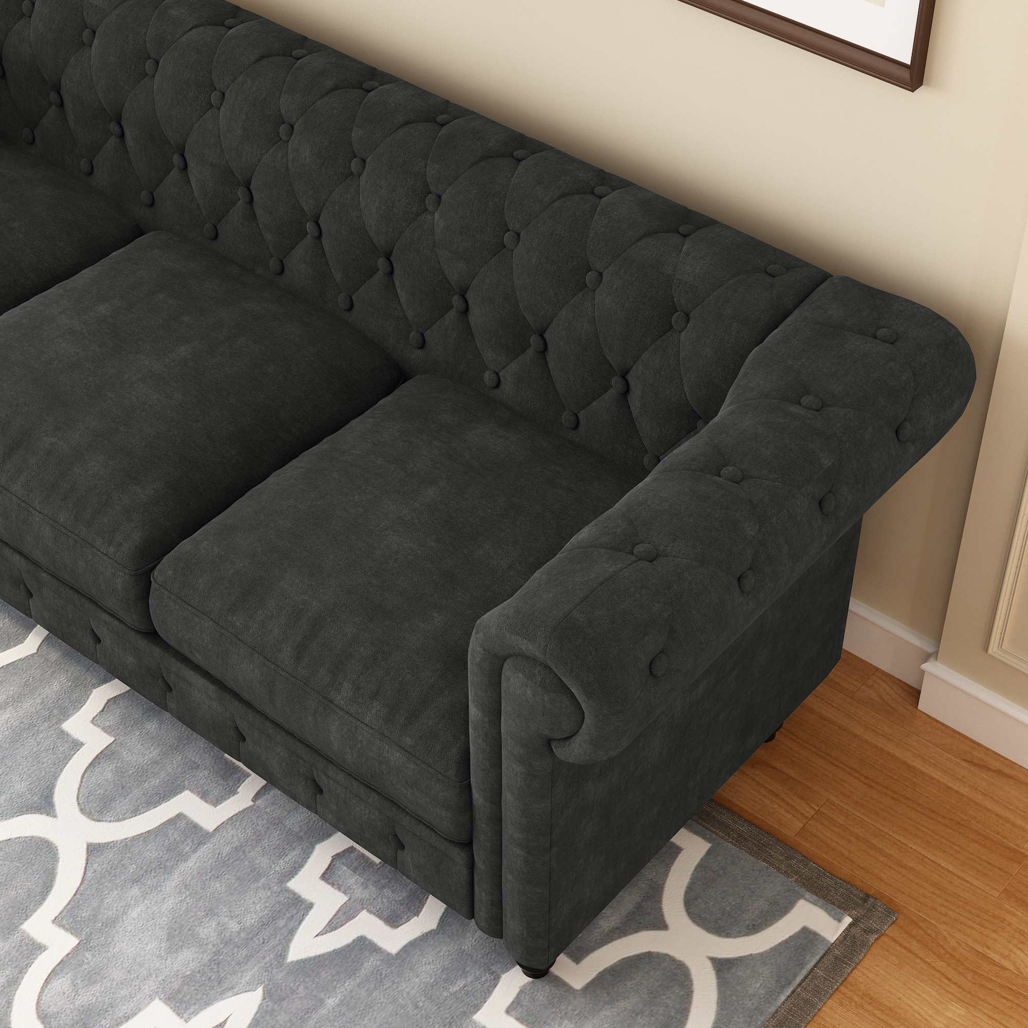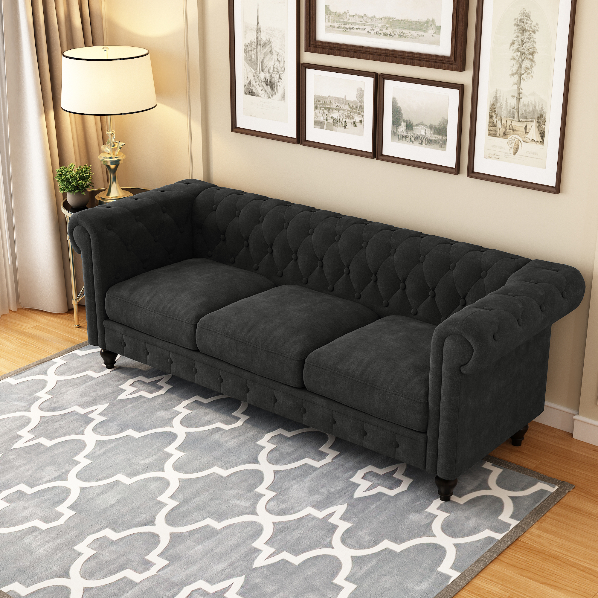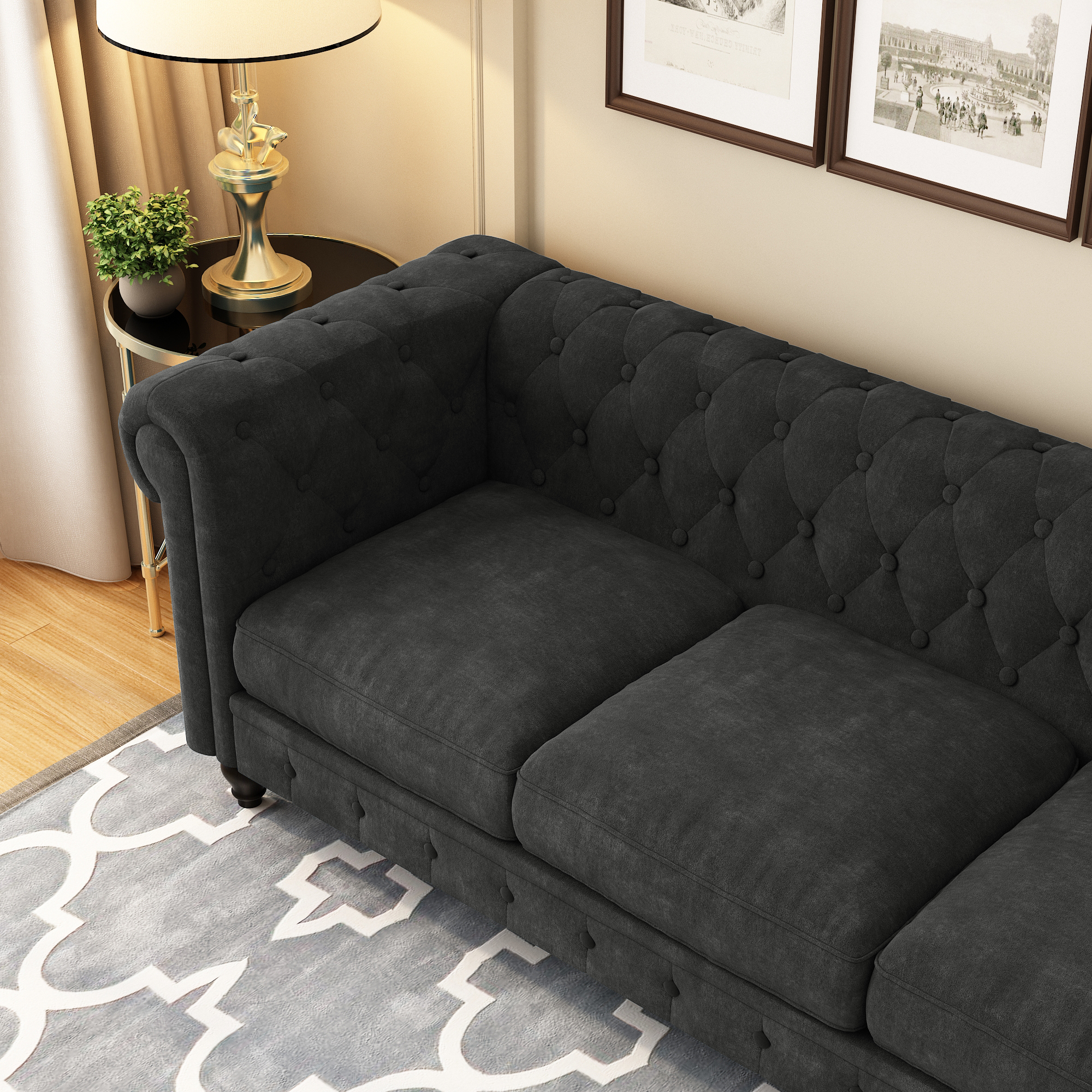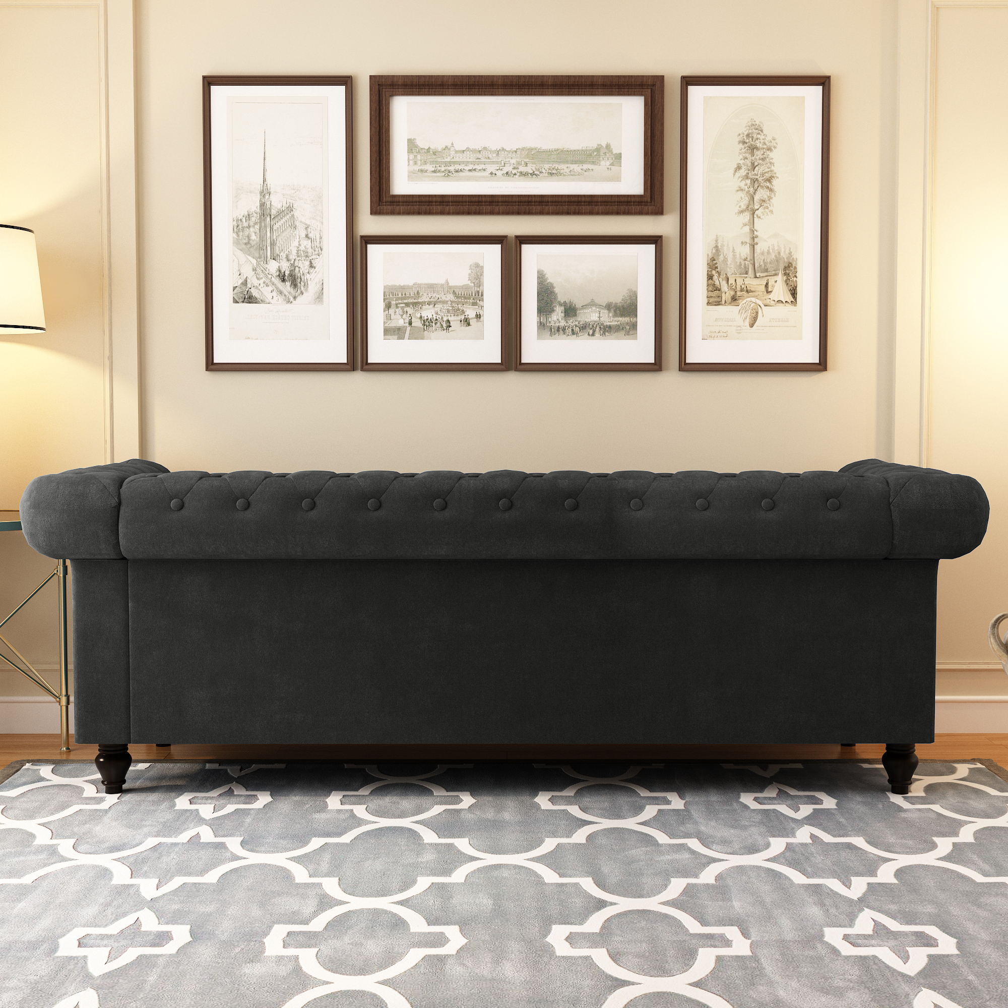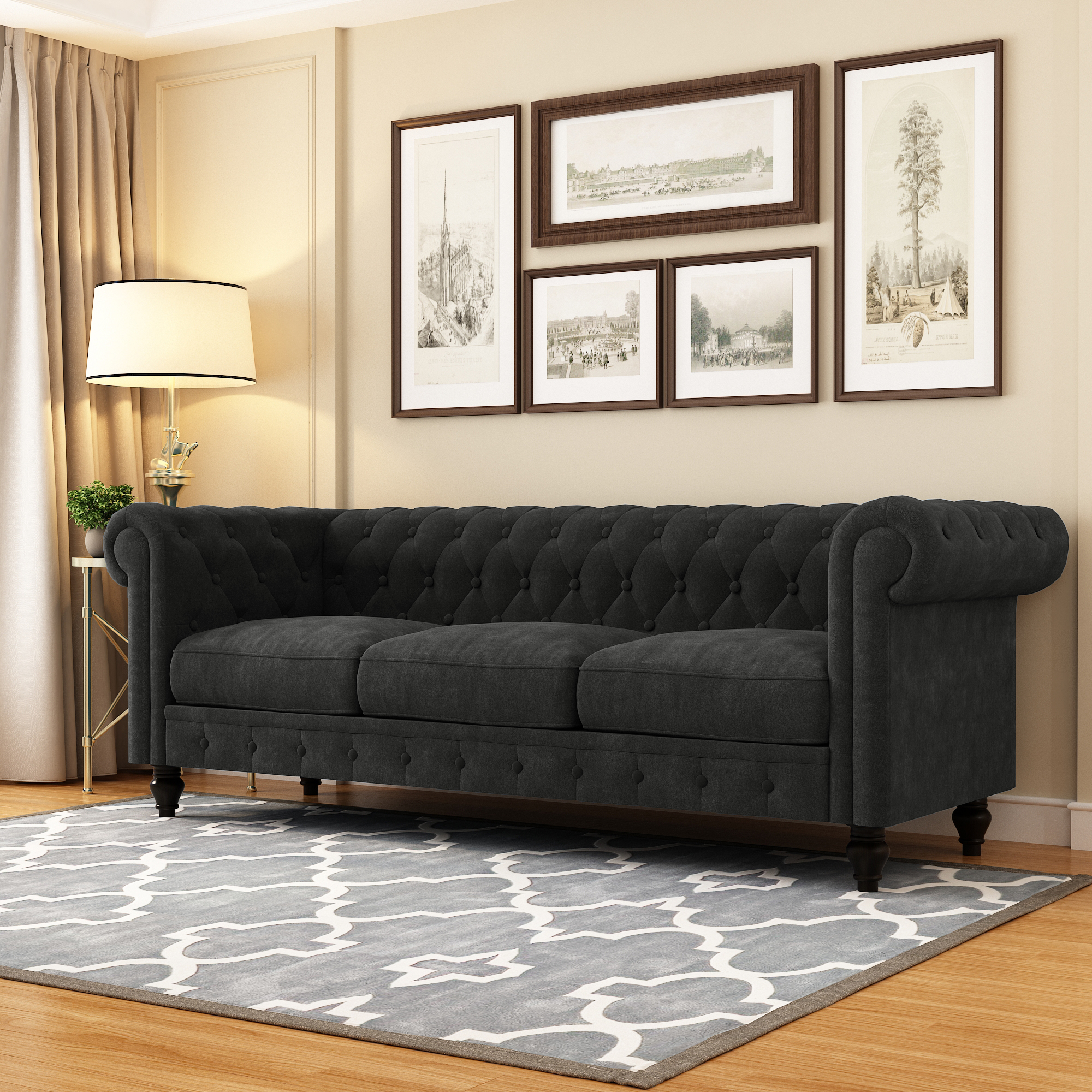 Bring home a timeless addition for your living room with our lasting chesterfield style sofa. This lovely sofa is the ideal addition to any living room with its classic design and traditional elements such as deep button tufting, and nailhead accents. Featuring a low backrest and plush upholstery, this sofa stands as a streamlined statement piece that can change the whole flow of your living room, creating an open, clean space. Finished with beautifully turned legs, our sofa provides an elegant touch to any room.