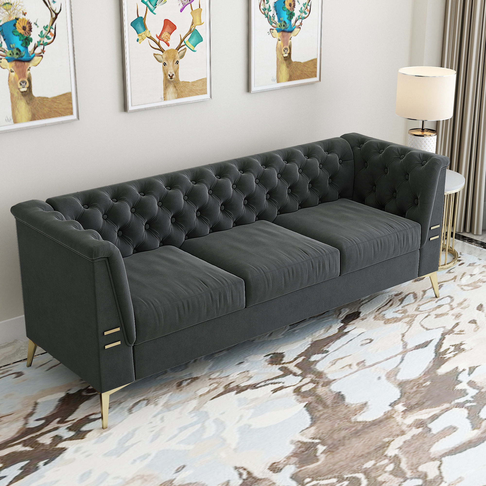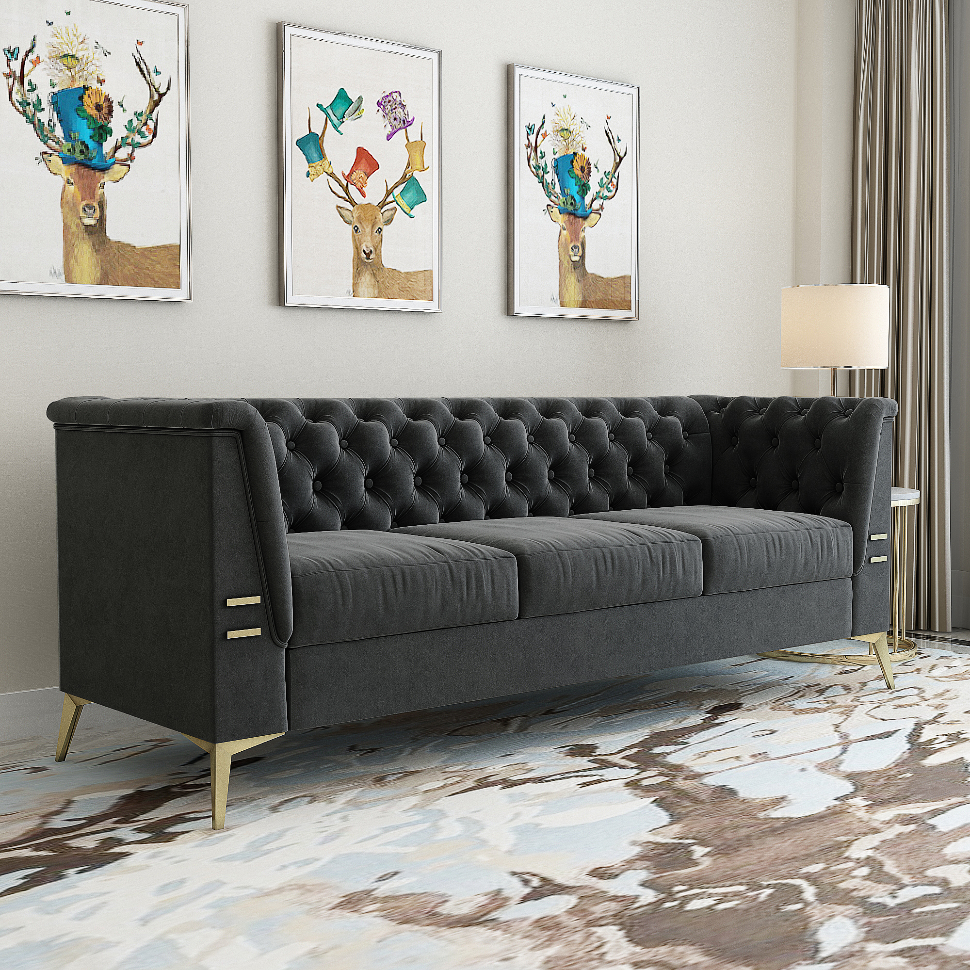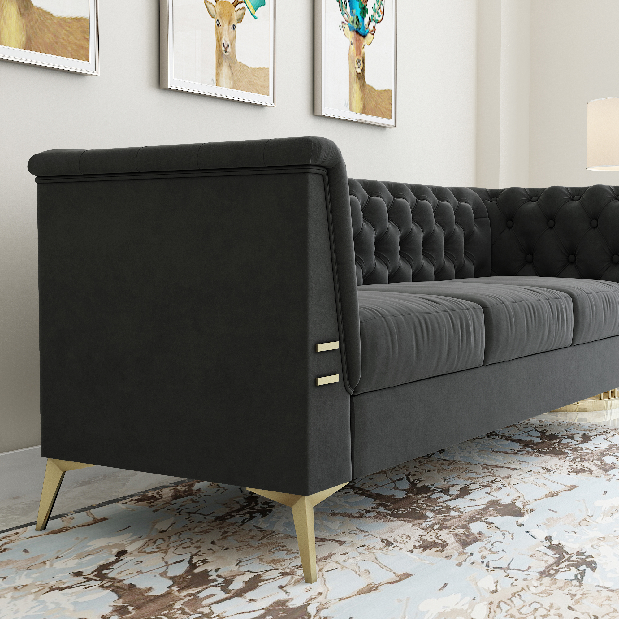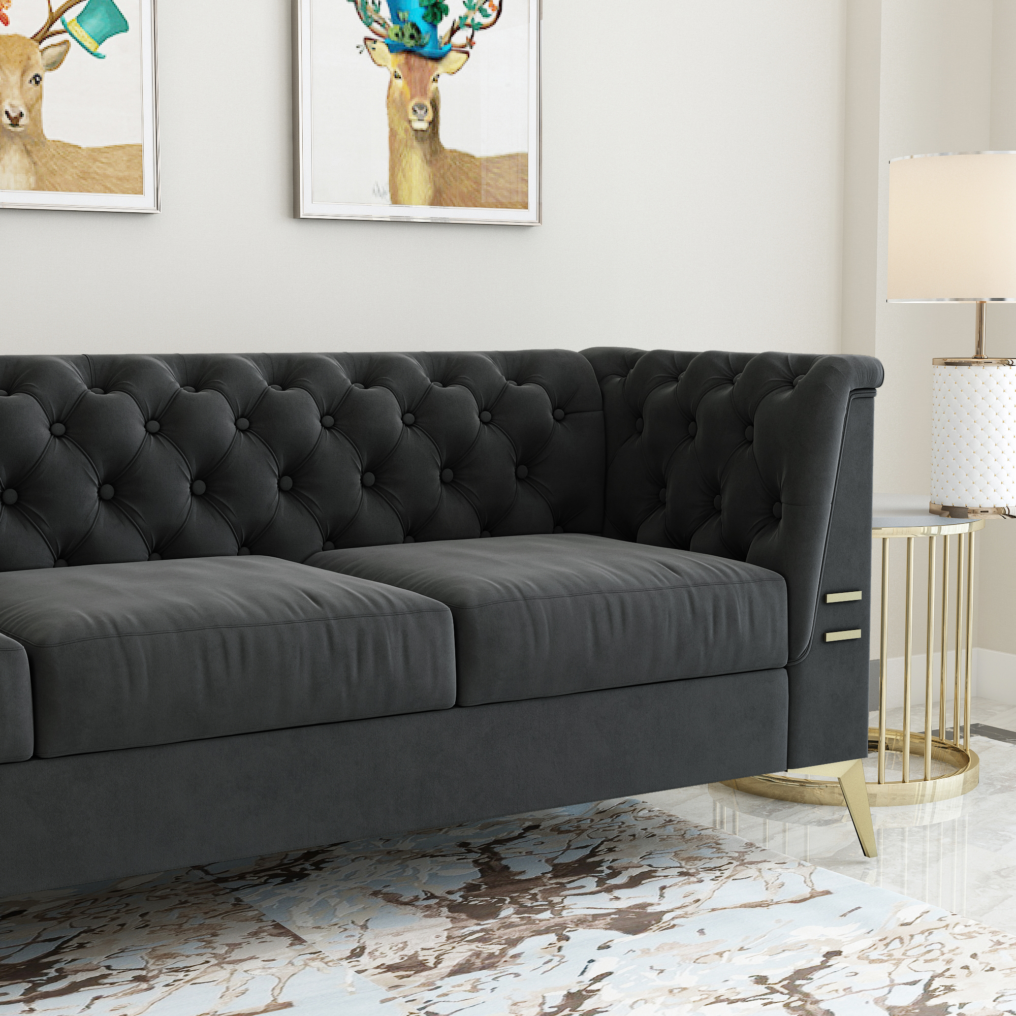 A marriage of comfort and contemporary allure, this eye-catching sofa is sure to lend style to your living room look. Founded atop four tapered feet, its clean-lined frame is crafted from kiln-dried hardwood and is covered in velvet upholstery. While a solid hue makes it a stylish stage for plush patterned pillows and faux fur blankets, it's equally elegant all on its thanks to square arms, tufted seat & back cushion.