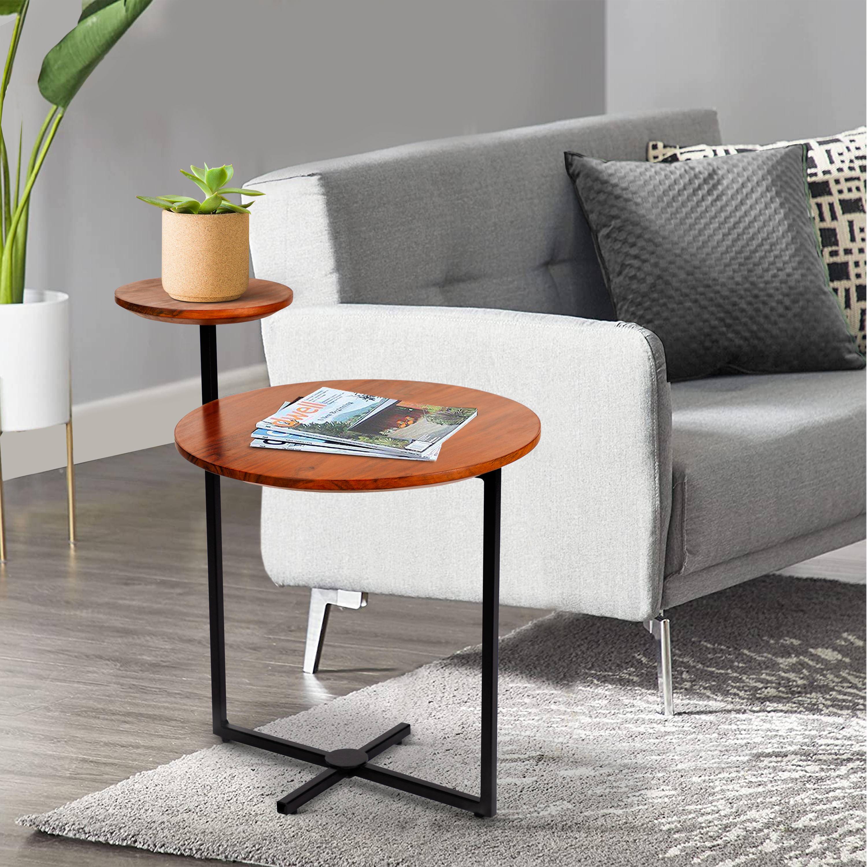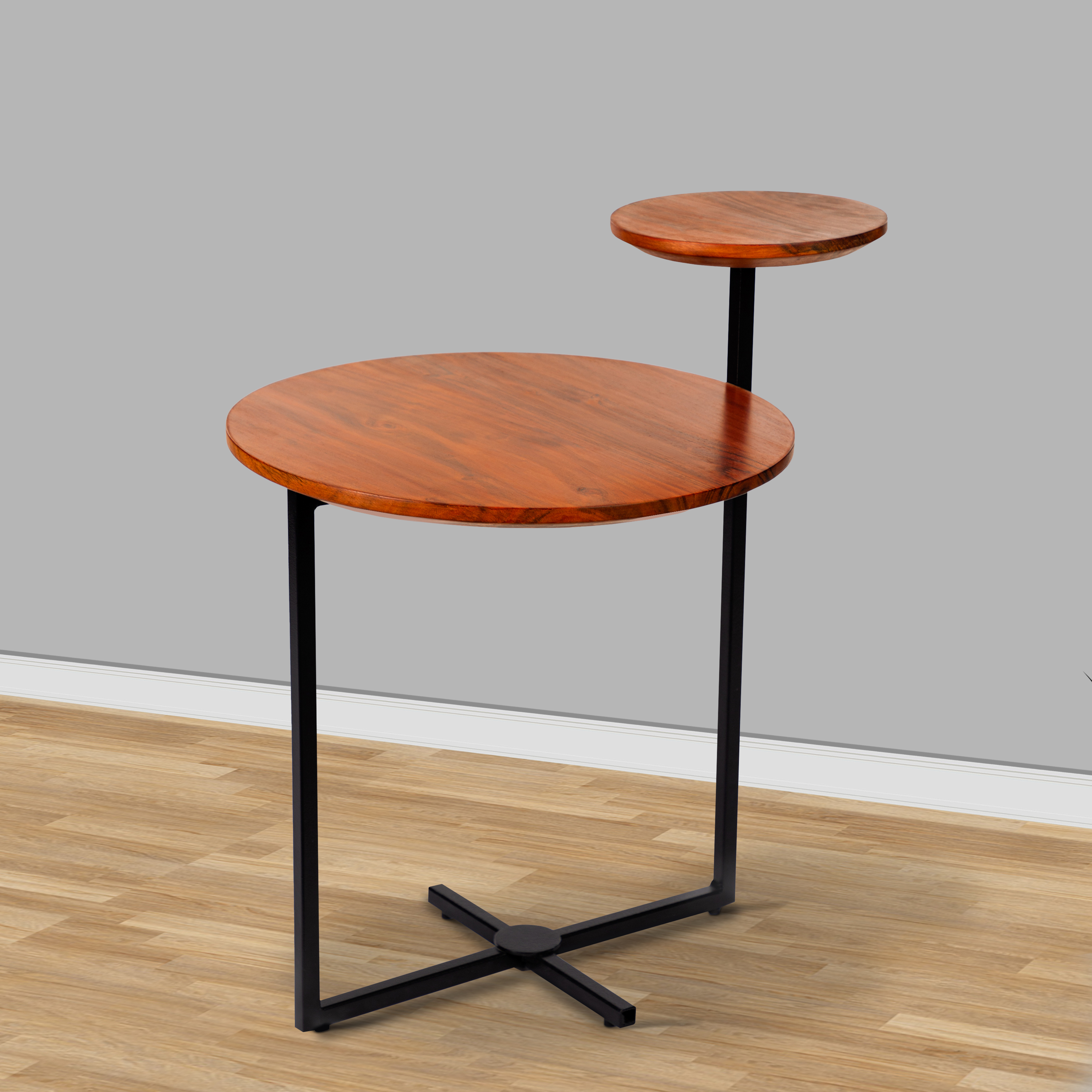 Intriguing geometric design meets industrial style with this accent table from our Geo collection. With rich wood grain details for a natural appeal, the two tier round tabletops sit in perfect harmony with the lightweight but strong metal frame that extends to form a cross shaped support at the base. Handcrafted from real acacia wood and metal, the warm brown wood compliments the black powder coated frame. With clean lines and simple shapes, the design of this is fun to sit by with a drink or it is also perfect for showcasing collectibles or displaying books. In addition to being useful as an accent table, it makes a great compliment in your lounge or sitting area as a side table or end table.