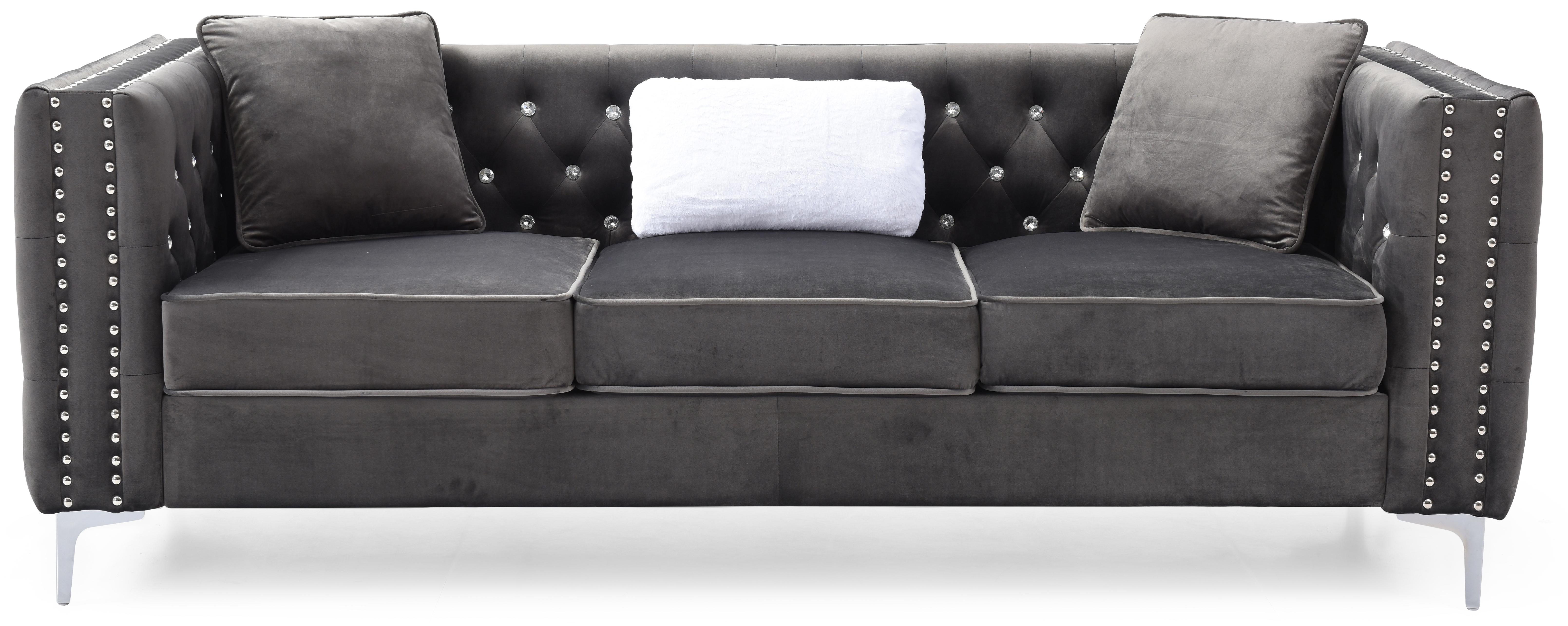 Covered in Soft Velvet Jeweled Buttoned Tufted on the Outside and Inside of the arms and Backs and Pocketed Coil Cushion Seats Make this Set Comfortable and Stylish Nailhead trimmed and finished off with Chrome Plated Legs , It also includes Throw Pillows. KD Design allows for EZ Delivery to any Home or Room! Choose from Sofa Loveseat or Chair. Tufted Design With Faux Diamond Buttons. KD Design - Ships Small Parcel!. Velvet Material. Kiln Dried Hardwood Frame, Plywood, Manufactured Wood Products. Glued,Screwed, Stapled.