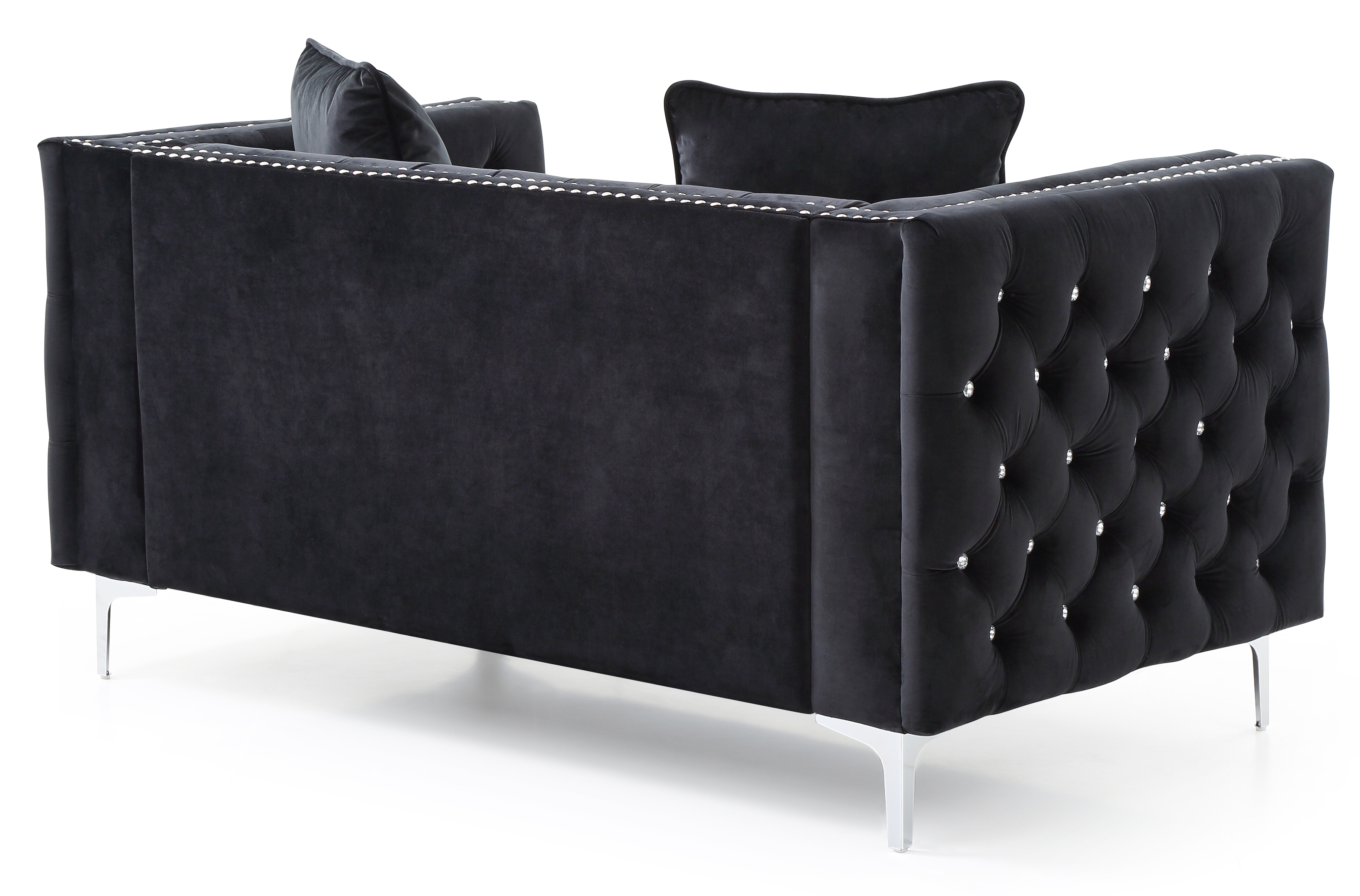 Covered in Soft Velvet Jeweled Buttoned Tufted on the Outside and Inside of the arms and Backs and Pocketed Coil Cushion Seats Make this Set Comfortable and Stylish Nailhead trimmed and finished off with Chrome Plated Legs , It also includes Throw Pillows. KD Design allows for EZ Delivery to any Home or Room! Choose from Sofa Loveseat or Chair. Tufted Design With Faux Diamond Buttons. KD Design - Ships Small Parcel!. Velvet Material. Kiln Dried Hardwood Frame, Plywood, Manufactured Wood Products. Glued,Screwed, Stapled.