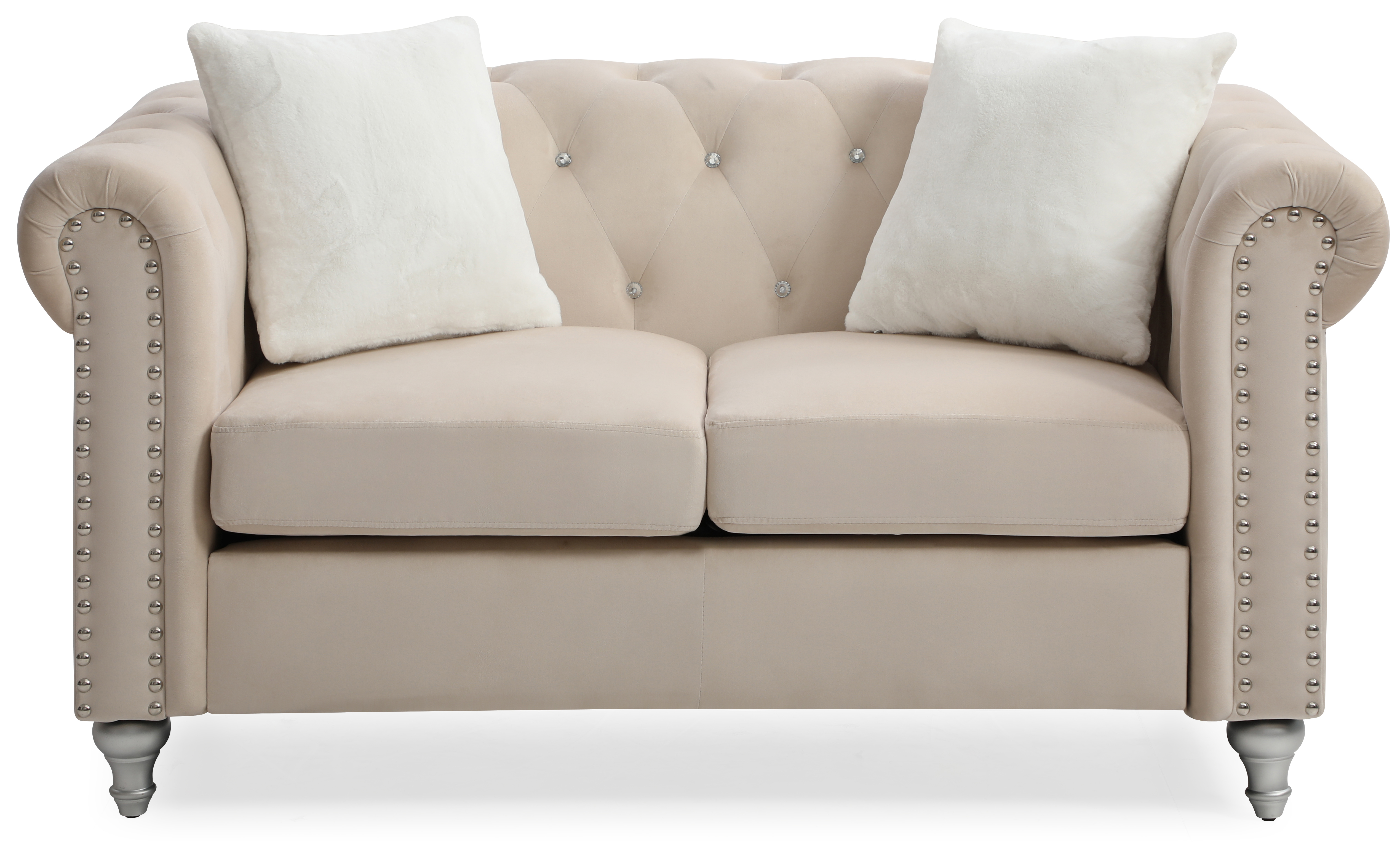An updated version of the Classic Chesterfield Design. Soft micro suede velvet cover is tufted with faux jewels and set off with chrome nailheads for a stunning look. Pocketed coil seats assure you of long-lasting comfort. Contrasting throw pillow finishes off this group Jeweled Tufted Micro Suede Velvet Cover. Chrome Nailheads. Pocket Coil Cushions. Painted Wood Legs. Pocket Coil Cushions. Contrasting Throw Pillow. Ships Small parcel for Fast Delivery. EZ Assembly Glued,Screwed, Stapled. Wood. Screwed. Glued