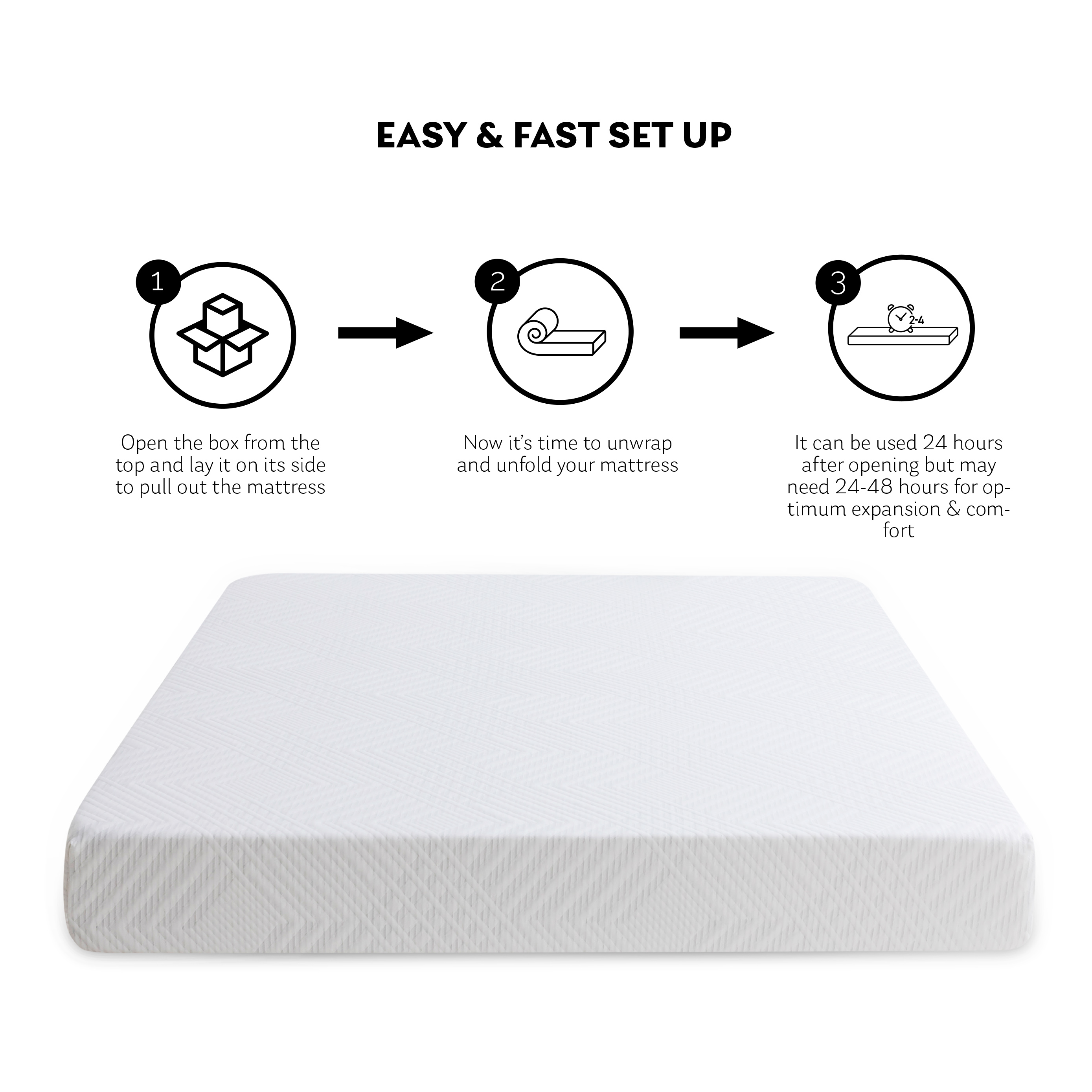• Flex Support Foam Base –This high-grade foam completes the bottom of the mattress to provide long-lasting durability and support to its top layer of gel memory foam