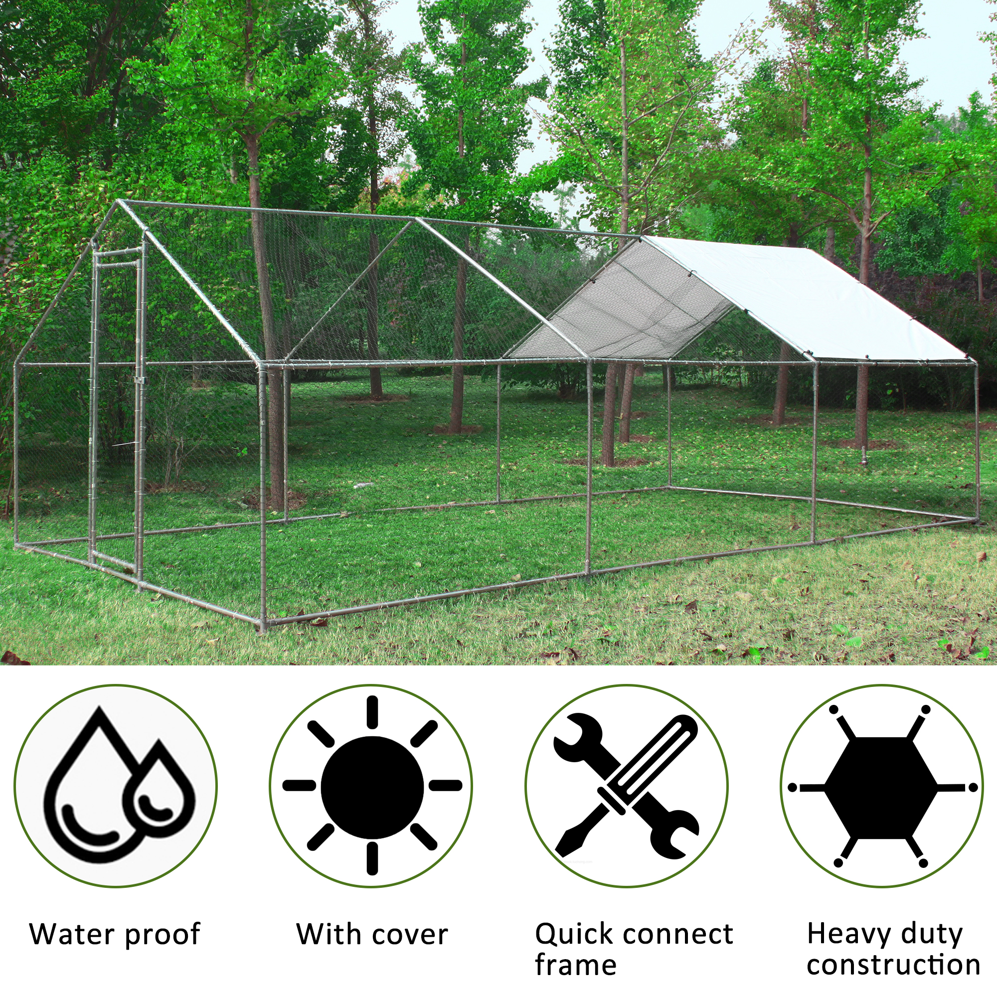 Featuring a durable sun and rain-proof tarp on the top, it is protective for the steel frame, wire mesh and animals under its cover. And the tarp is sturdy enough to avoid tear up or fade over time.