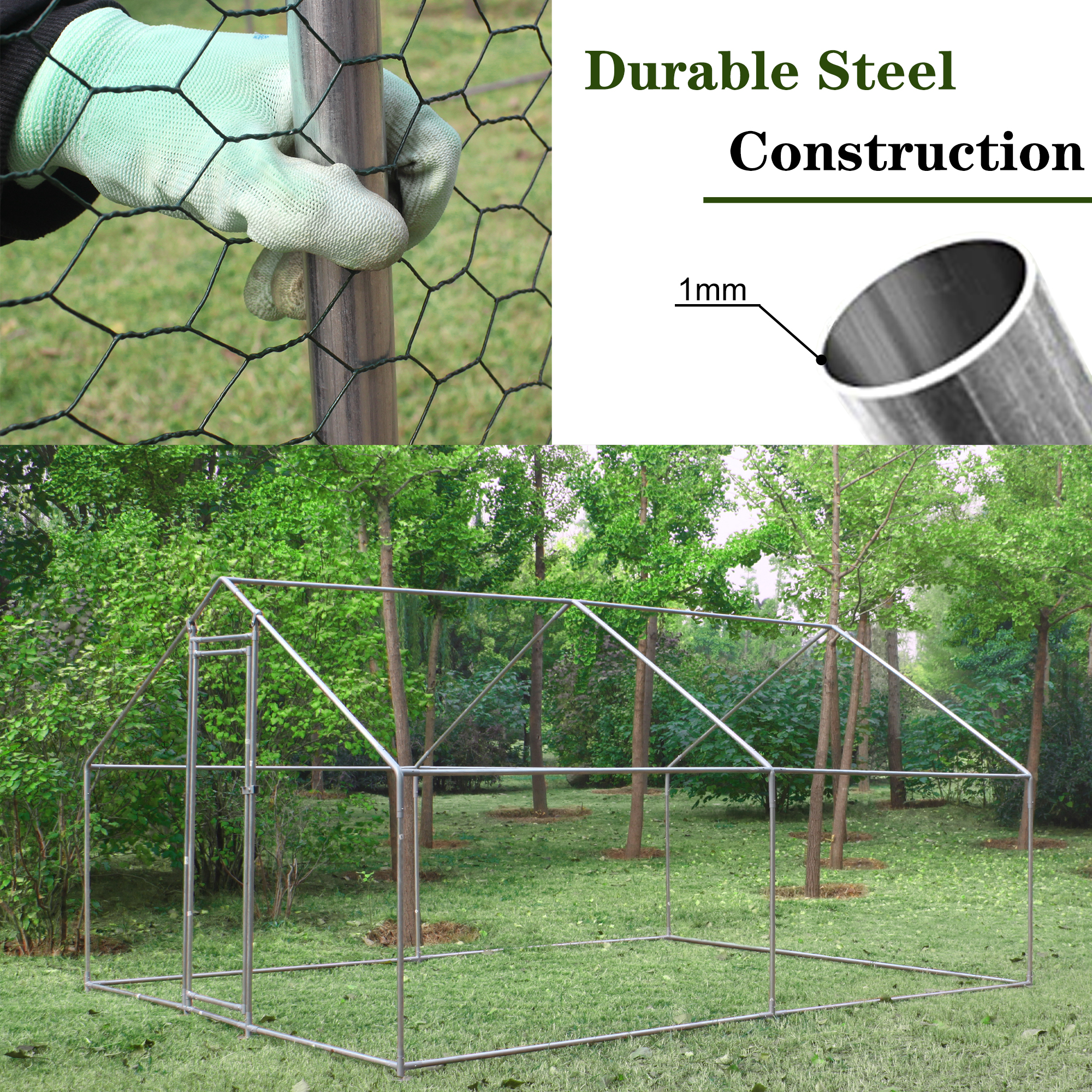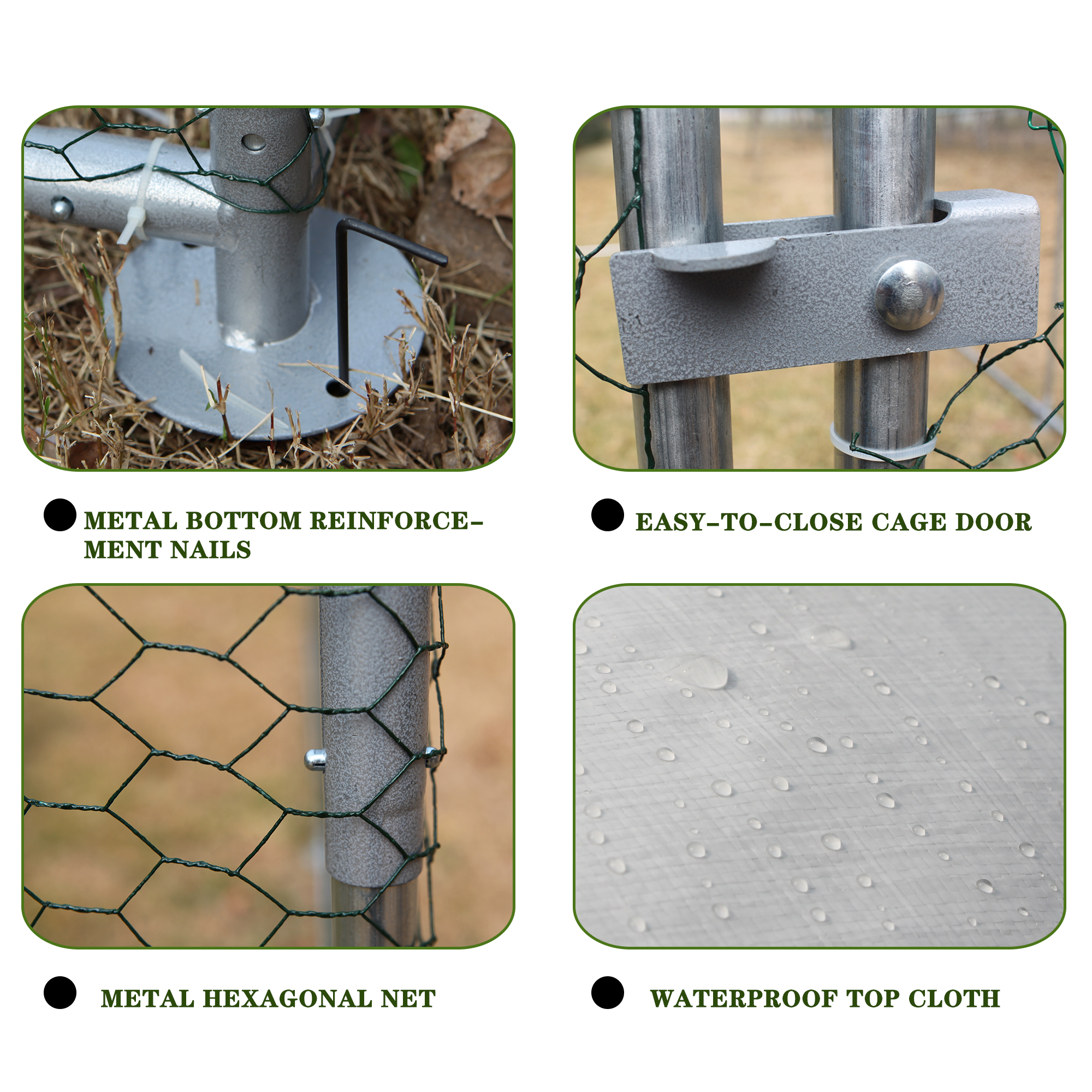 【Durable Construction】Made of a strong steel frame and thick PVC coated wire mesh, our large metal chicken coop is solid enough to withstand long-term outdoor use and keep the chicken safe from predators. Besides, the frame and wire mesh can protect the hen run house from rust and wear, which in return, will provide the animals and owner with a clean living environment.