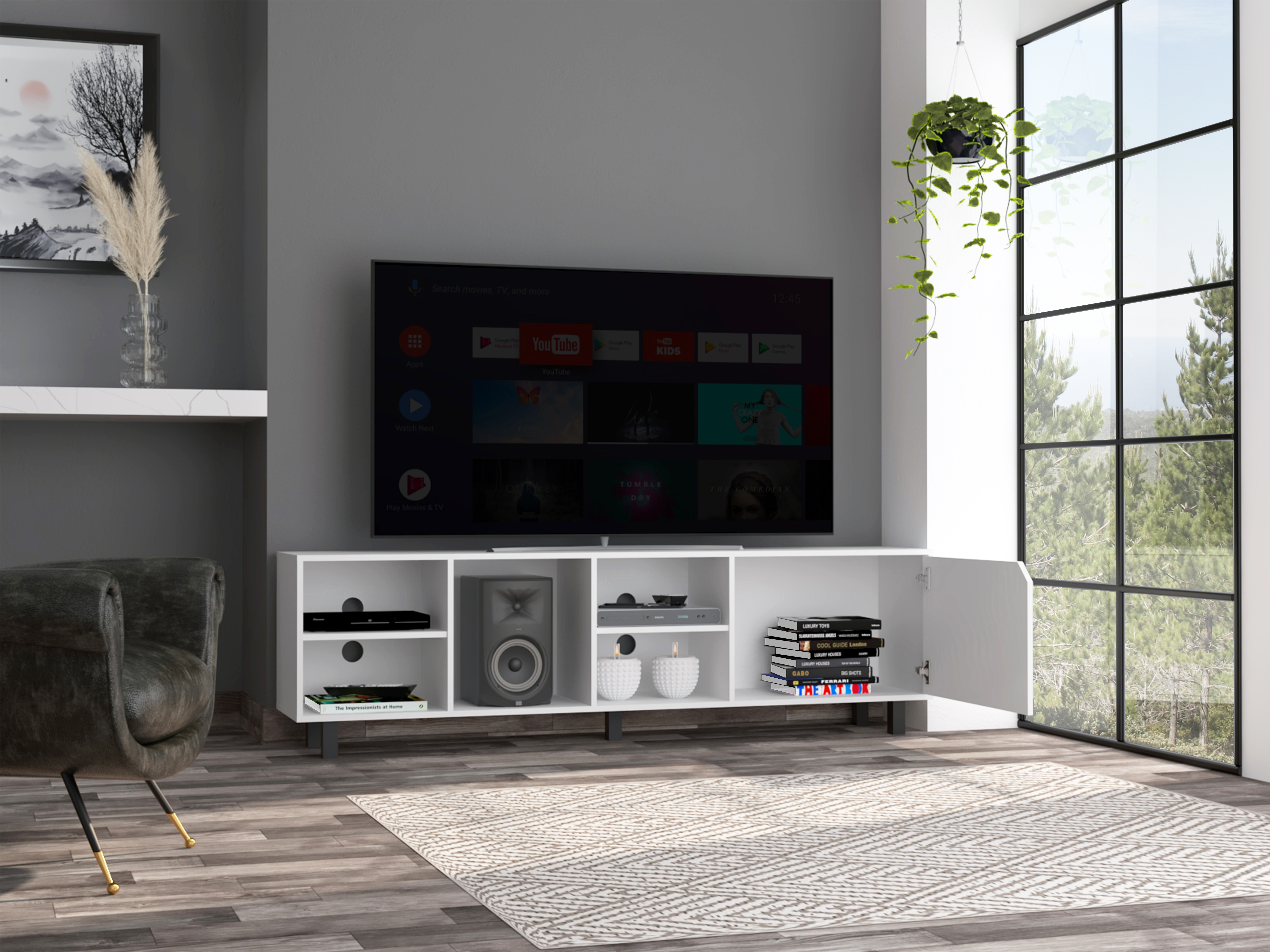 The new product of the collection, the Harwich TV Stand, is excellent for you if you have always dreamed of an ideal spot to organize your new TV with a modern touch and functionality due to its drawers and shelves suitable for storage. Its one-of-a-kind and ergonomic design make it ideal for any environment. It features back holes on the inside to keep your cables orderly.Set includes: One (1) TV standDimensions: 20.6 inches high x 70.8 inches wide x 13.7 inches deepFinish Color: WhiteMaterials: Manufactured woodNumber of shelves: 5-ShelfNumber of doors: 1-DoorFour open shelvesBack holesFive legs 3.9"TV capacity 70"